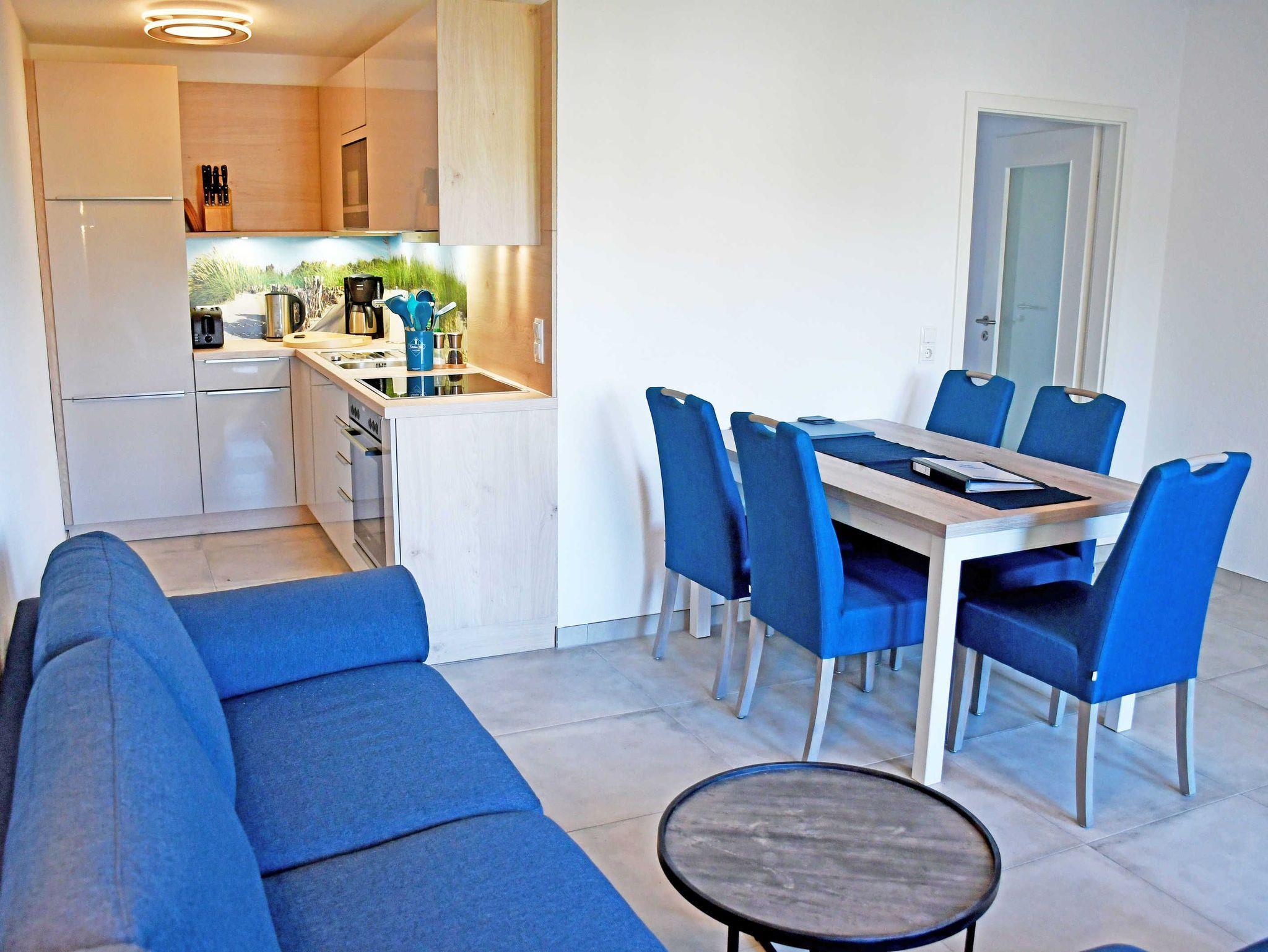 Im Wohnzimmer wartet die gemütliche Sofalandschaft mit Couchtisch und ein modernes Flachbild-TV-Gerät auf Sie zum Relaxen. Hier steht auch ein Esstisch mit fünf Stühlen. Kochfreunde werden in der neuen, hellen und modernen offenen Küche mit hochwertigen Markengeräten wie Backofen, Cerankochfeld mit Abzugshaube, Mikrowelle, Kühlschrank mit Gefrierfach und Geschirrspüler voll auf Ihre Kosten kommen.