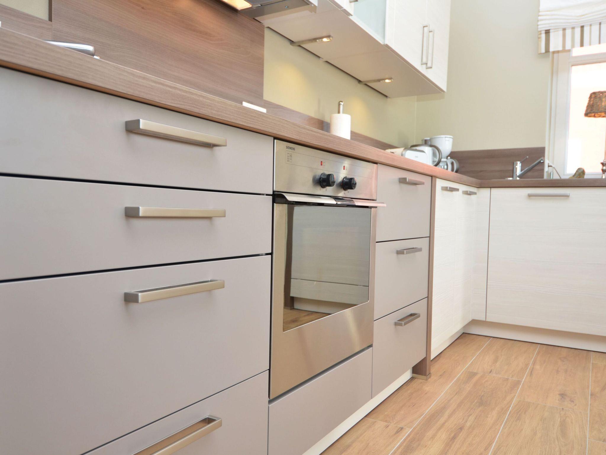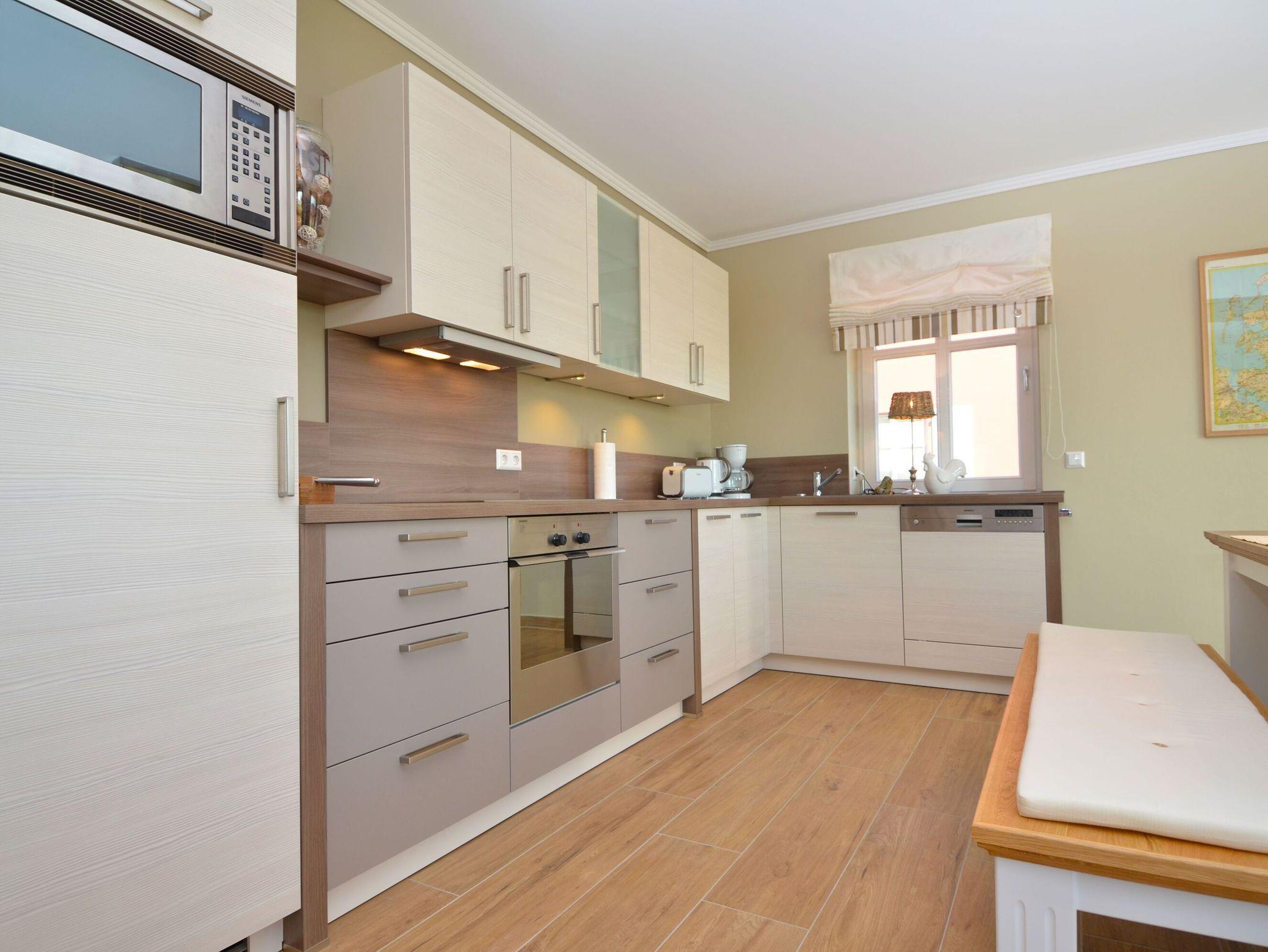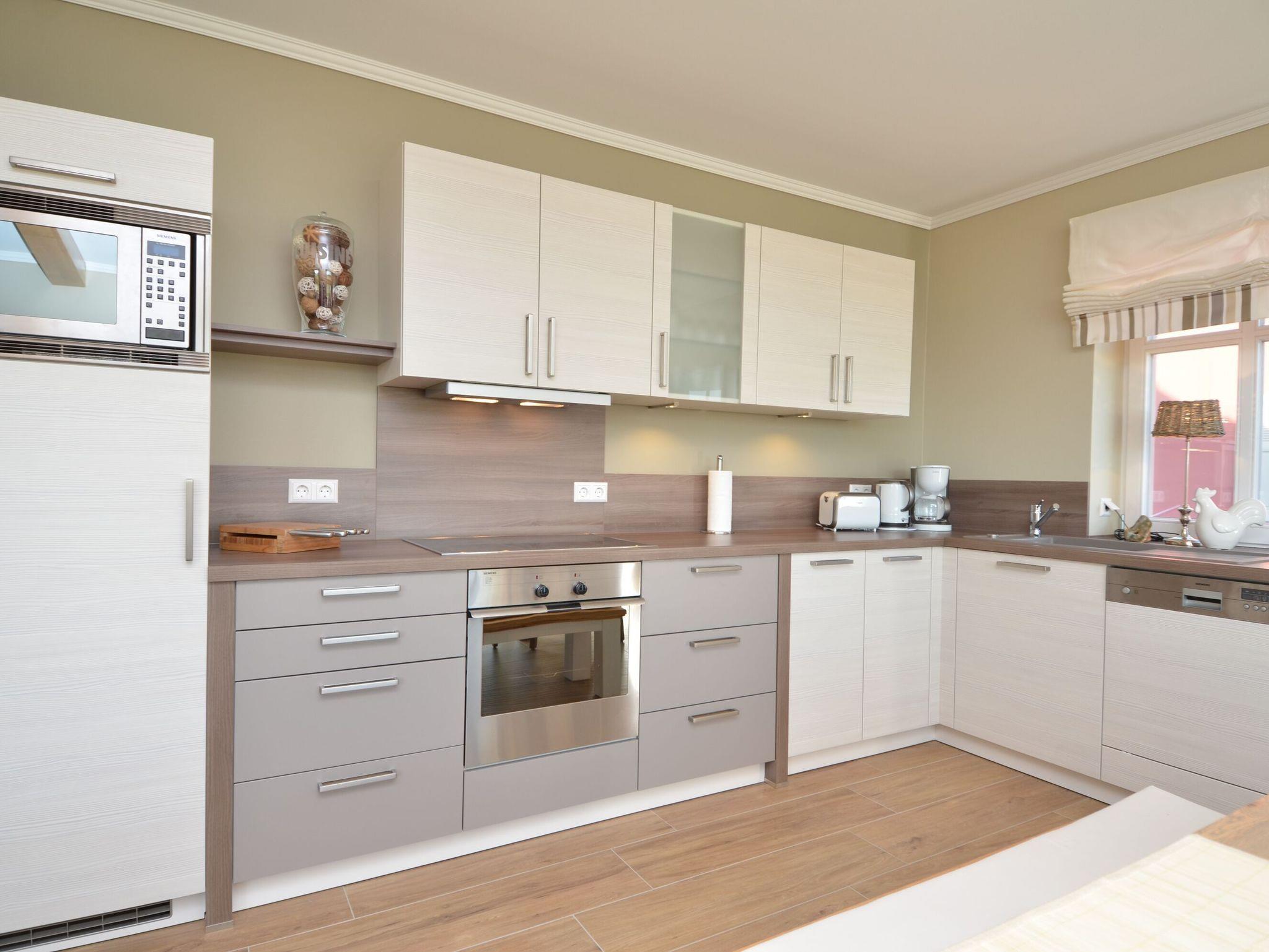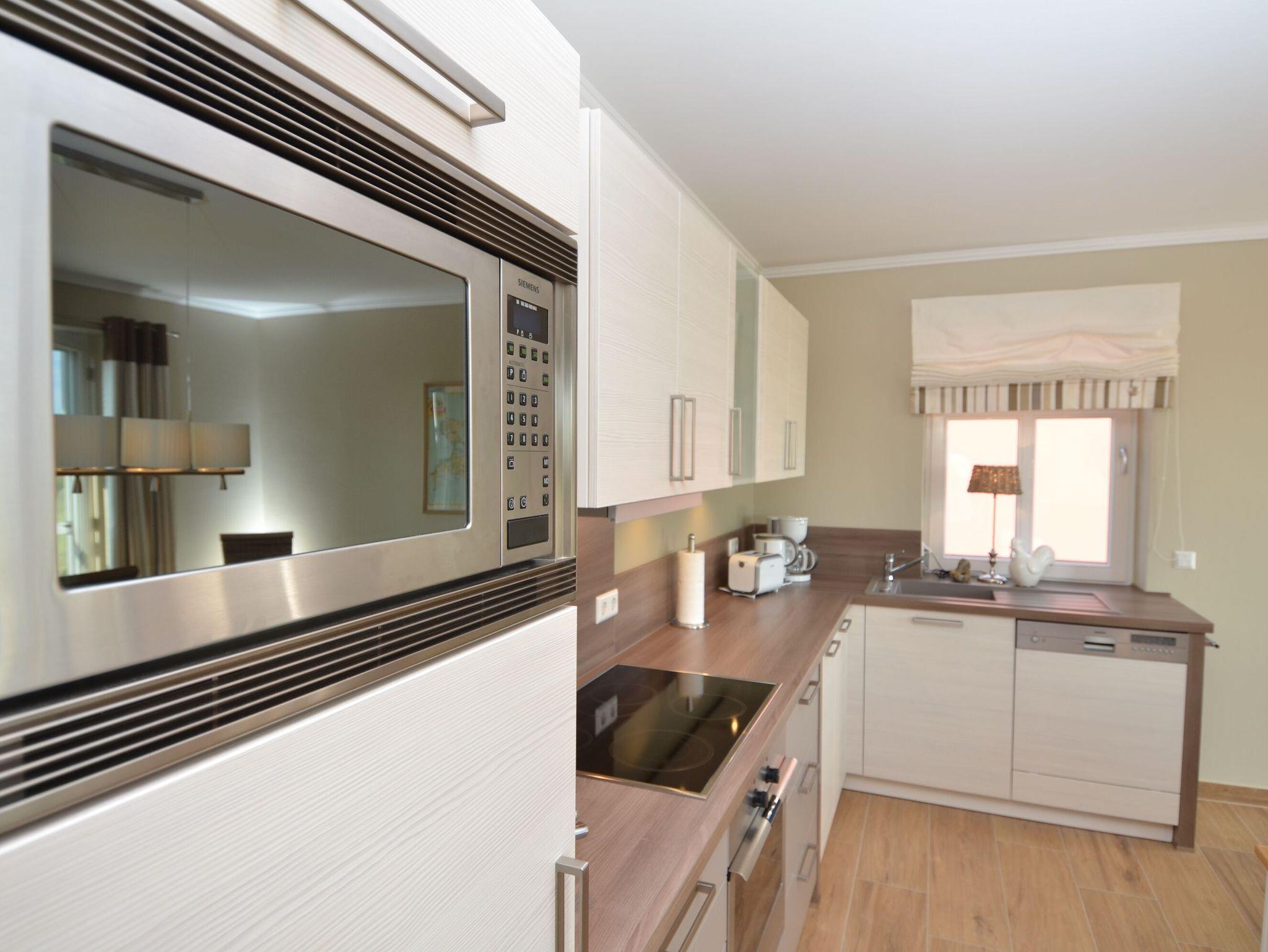 Die harmonisch im Wohnbereich integrierte, hochwertig ausgestattete Küchenzeile verfügt über eine Spülmaschine, einen Backofen, ein 4-Zonen-Cerankochfeld, ein Kühlschrank mit Gefrierfach, eine Mikrowelle, Kaffeemaschine, Toaster, Wasserkocher sowie diverses Kleininventar, welches die Küchenausstattung vervollständigt.
