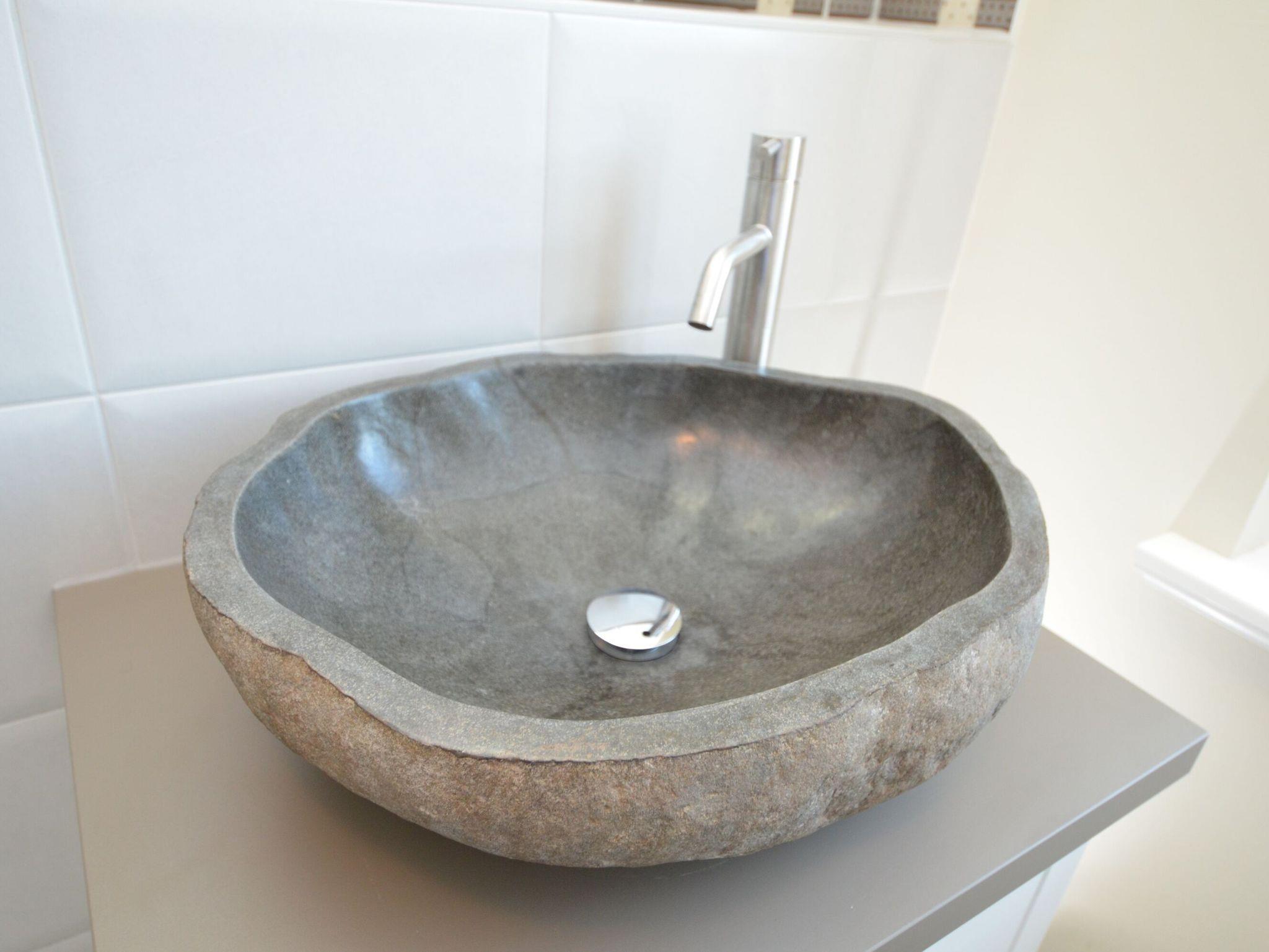 Eines der vier Schlafzimmer befindet sich im Erdgeschoss und ist mit einem Rattanbett (140cm x 200cm) ausgestattet. Ein modernes Duschbad mit flacher Duschtasse (1,00m x 1,00m), WC und das Findling-Waschbecken befindet sich ebenfalls im Erdgeschoss.