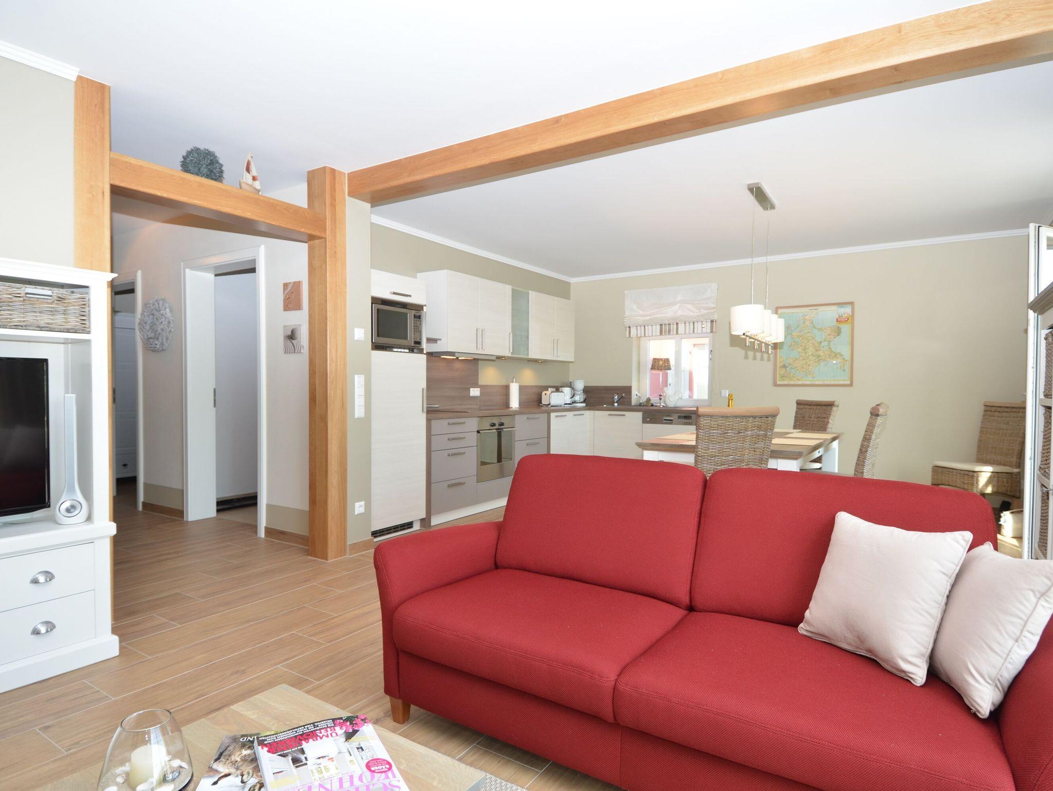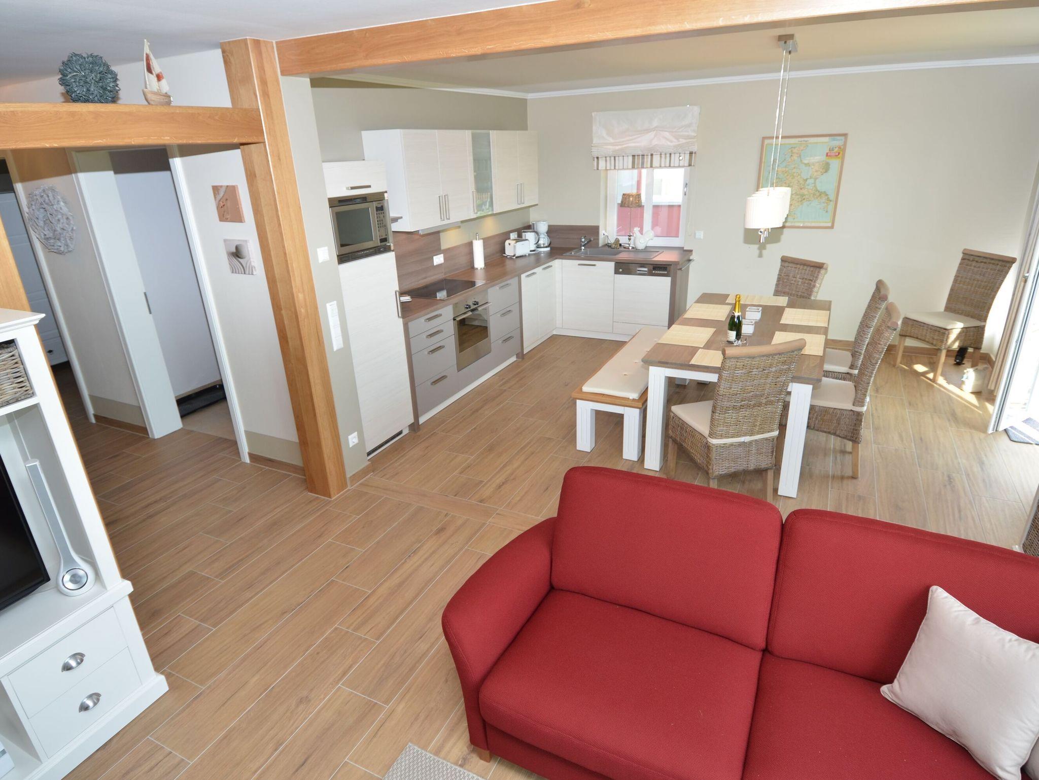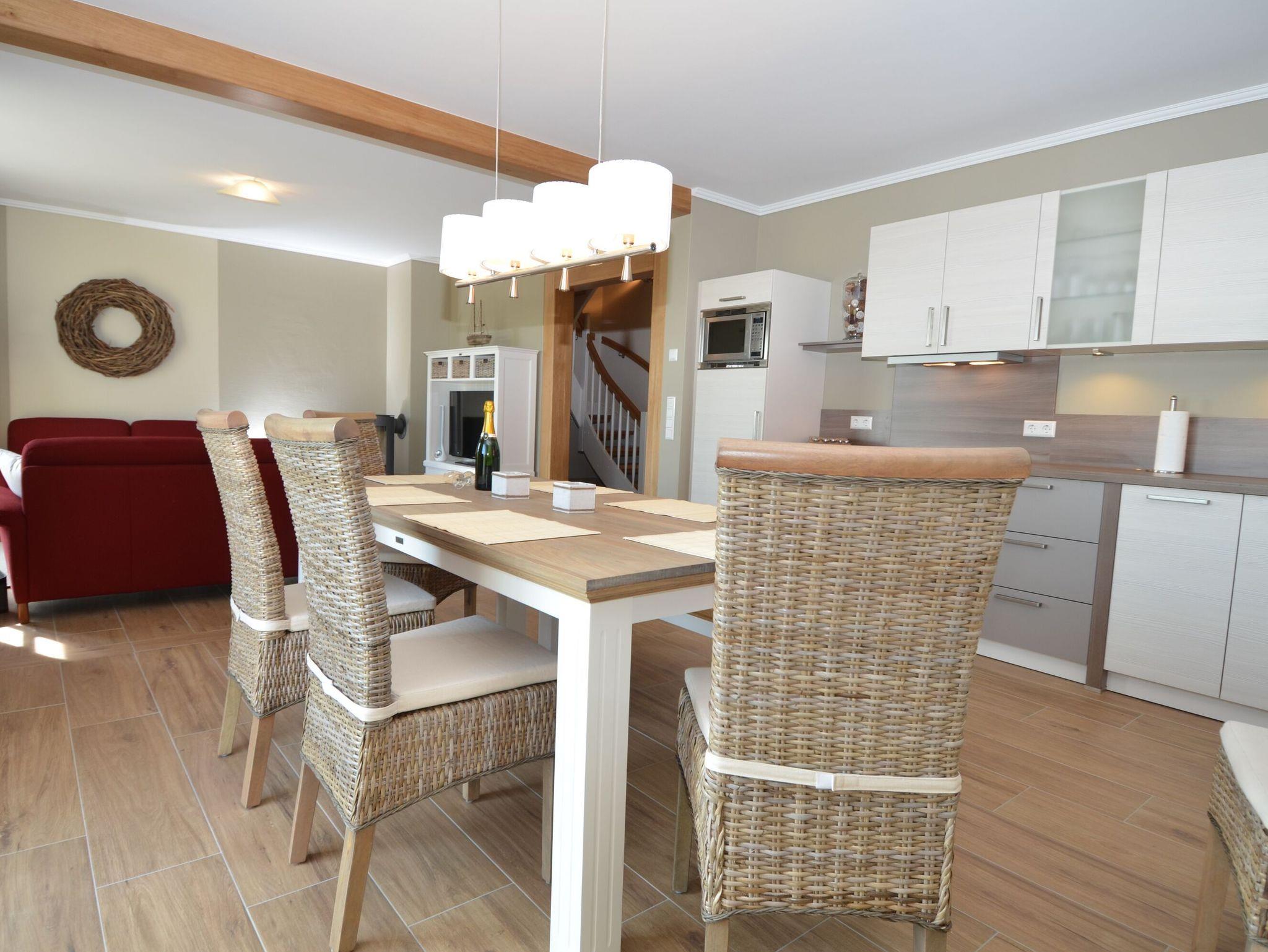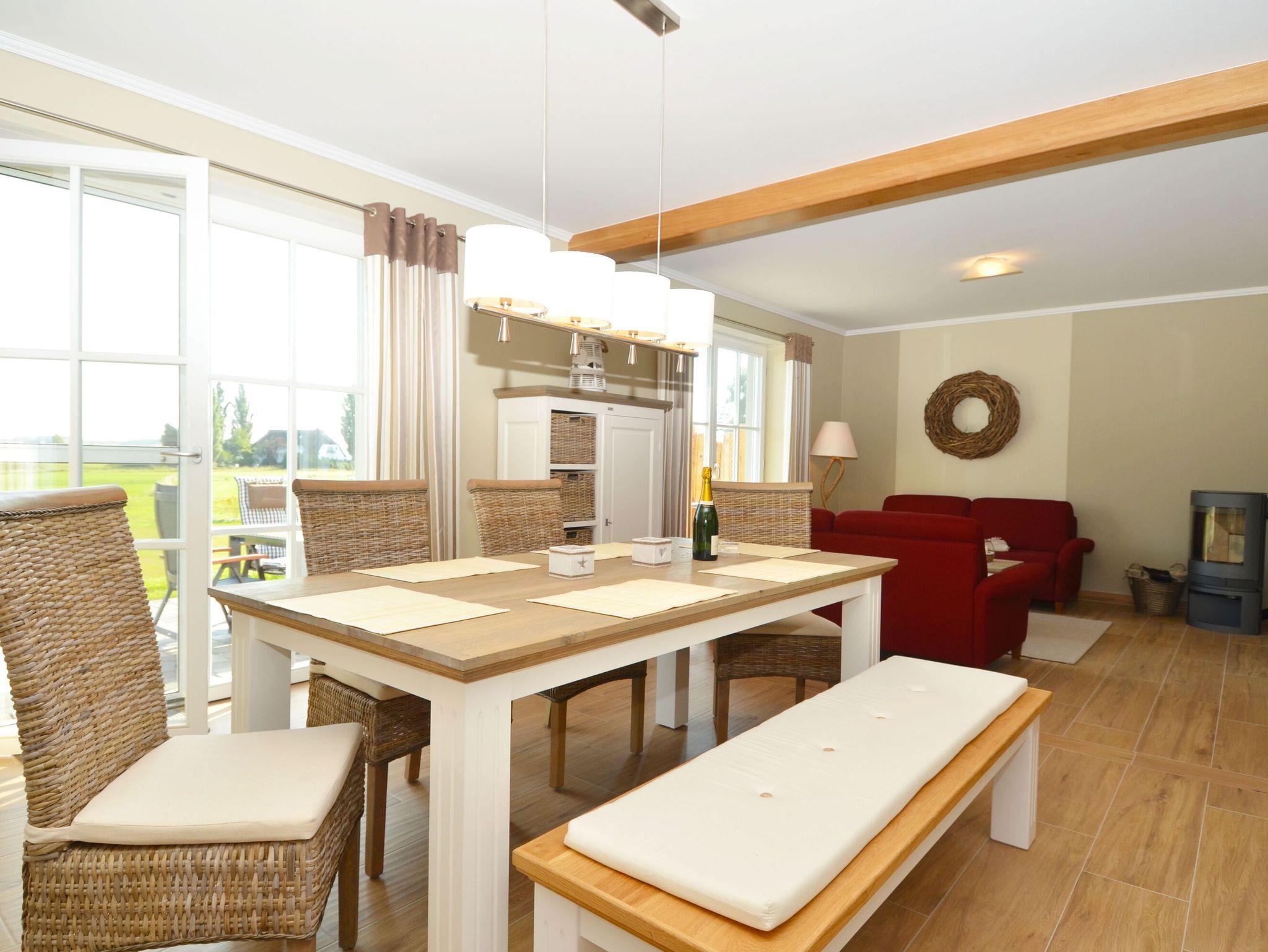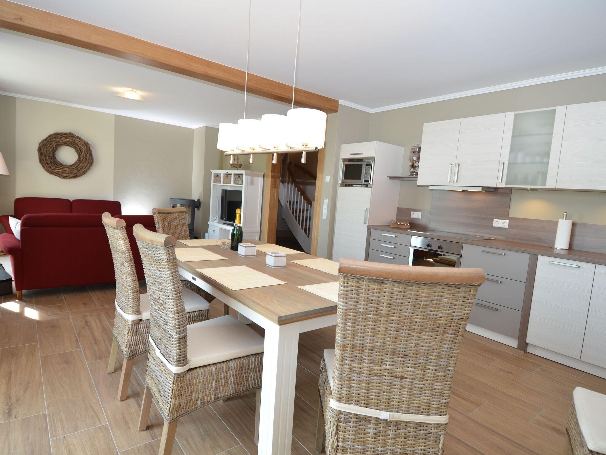 Im Erdgeschoss befindet sich das geräumige, hochwertig ausgestattete Wohn- und Esszimmer mit einem großen Esstisch für bis zu 8 Personen. Auf der Couch im Wohnzimmer lässt man den Urlaubstag vorm Kaminfeuer ausklingen. Für Unterhaltung sorgen ein LCD?Fernseher sowie ein DVD-Player und eine HiFi-Anlage. W-LAN im Haus ist natürlich ebenfalls verfügbar und kostenfrei.