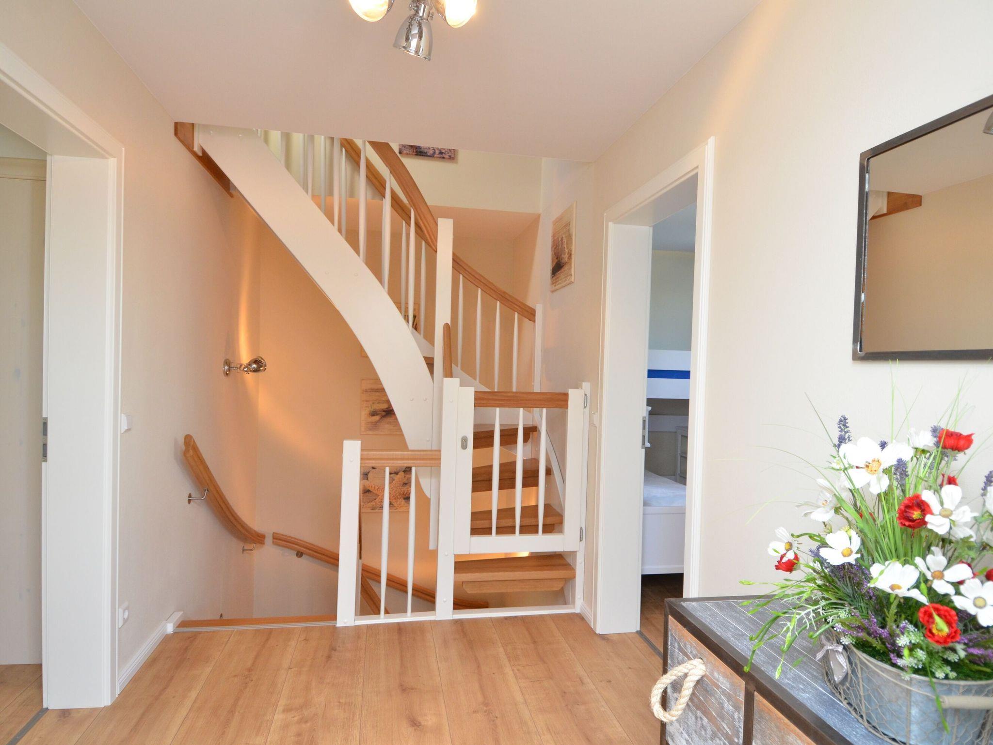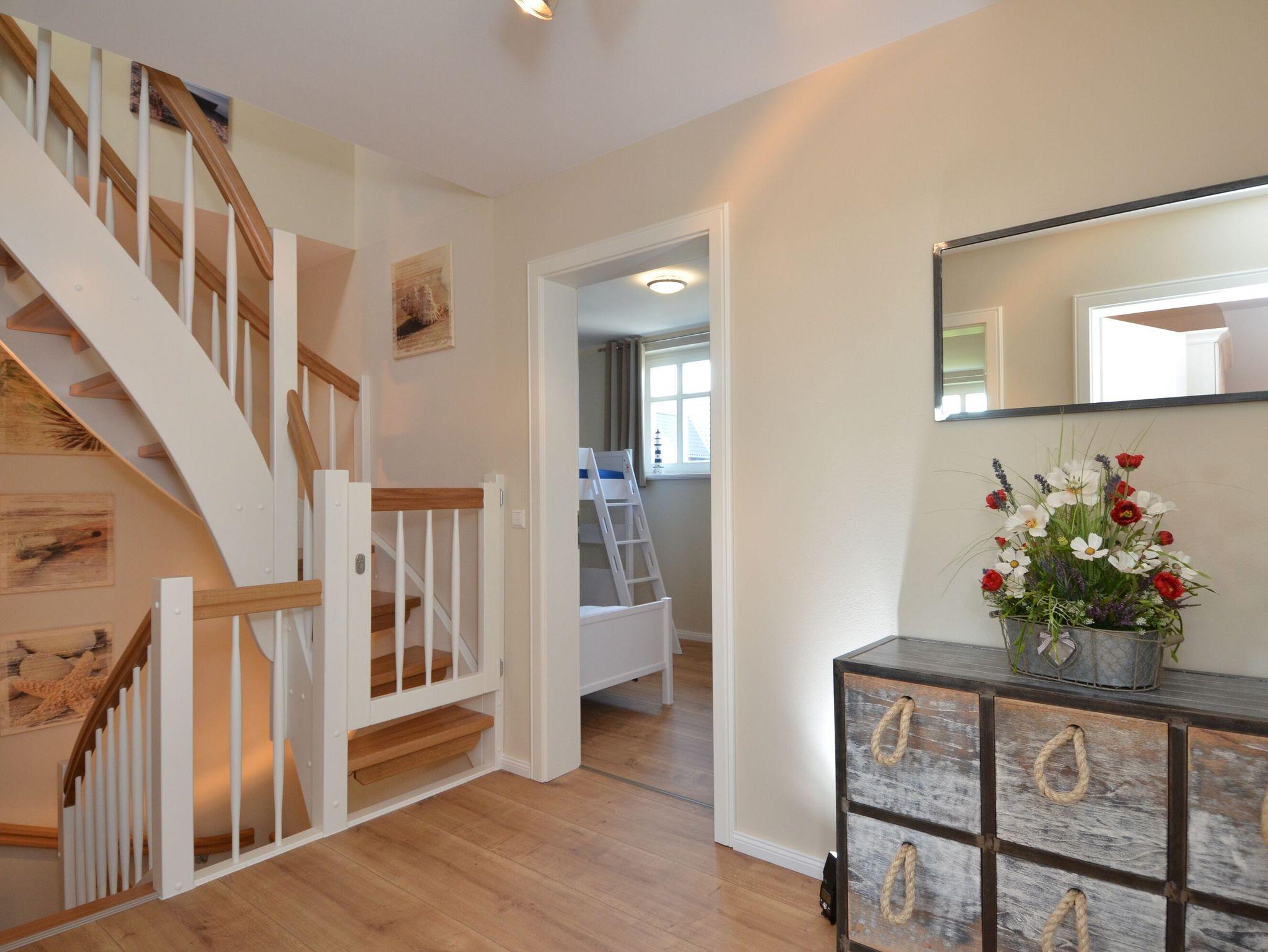 Im Obergeschoss befinden sich drei weitere Schlafzimmer. Zwei Schlafzimmer sind ausgestattet mit einem 180cm breiten Doppelbett (eines davon mit 220 cm Überlänge) sowie je einem Flachbildfernseher. Und falls im Urlaub mal dringend notwendige Büroarbeiten anstehen, können diese in einem dieser Schlafzimmer am Schreibtisch mit Sitzgelegenheit erledigt werden. Das dritte Schlafzimmer verfügt über ein Eck-Etagenbett mit zwei Einzelbetten der Größe 90x200cm und einen kleineren Schreibtisch mit Sitzgelegenheit. Ausreichend Platz für Ihre Garderobe ist in allen Schlafzimmern vorhanden.