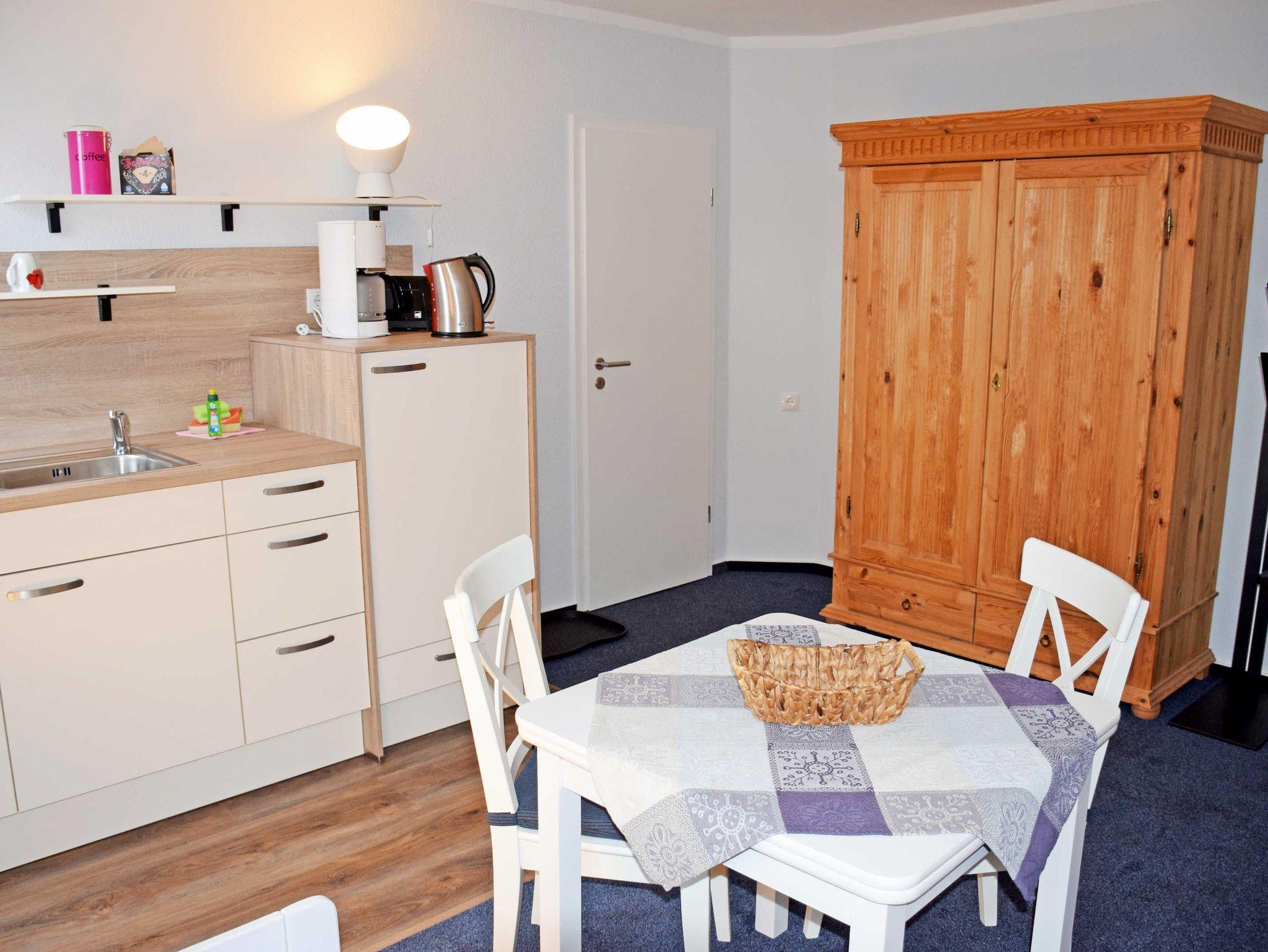 Die Ferienwohnung liegt im Hotelgebäude und ist ca. 36 qm groß. Sie hat Platz für maximal 3 Erwachsene und wurde modern und hochwertig eingerichtet. Im Wohnraum befinden sich eine bequeme Sitzcouch mit Tisch und ein modernes Flachbild-TV-Gerät. Hier steht auch ein Esstisch mit Stühlen. Die moderne Küchenzeile ist mit einem Herd, Mikrowelle, Wasserkocher, Kaffeemaschine, Toaster und Kühlschrank komplett ausgestattet. Das großzügige Schlafzimmer ist mit einem bequemen Doppelbett mit Nachttischen und Leselampen sowie einem Kleiderschrank ausgestattet.