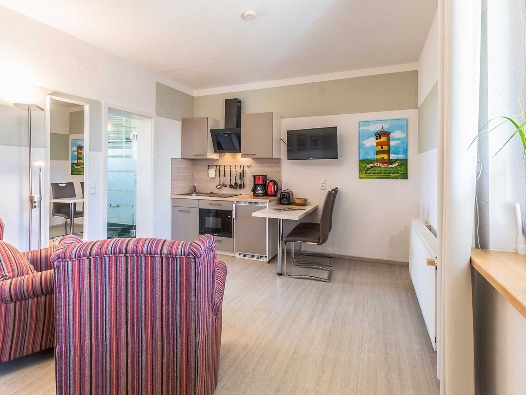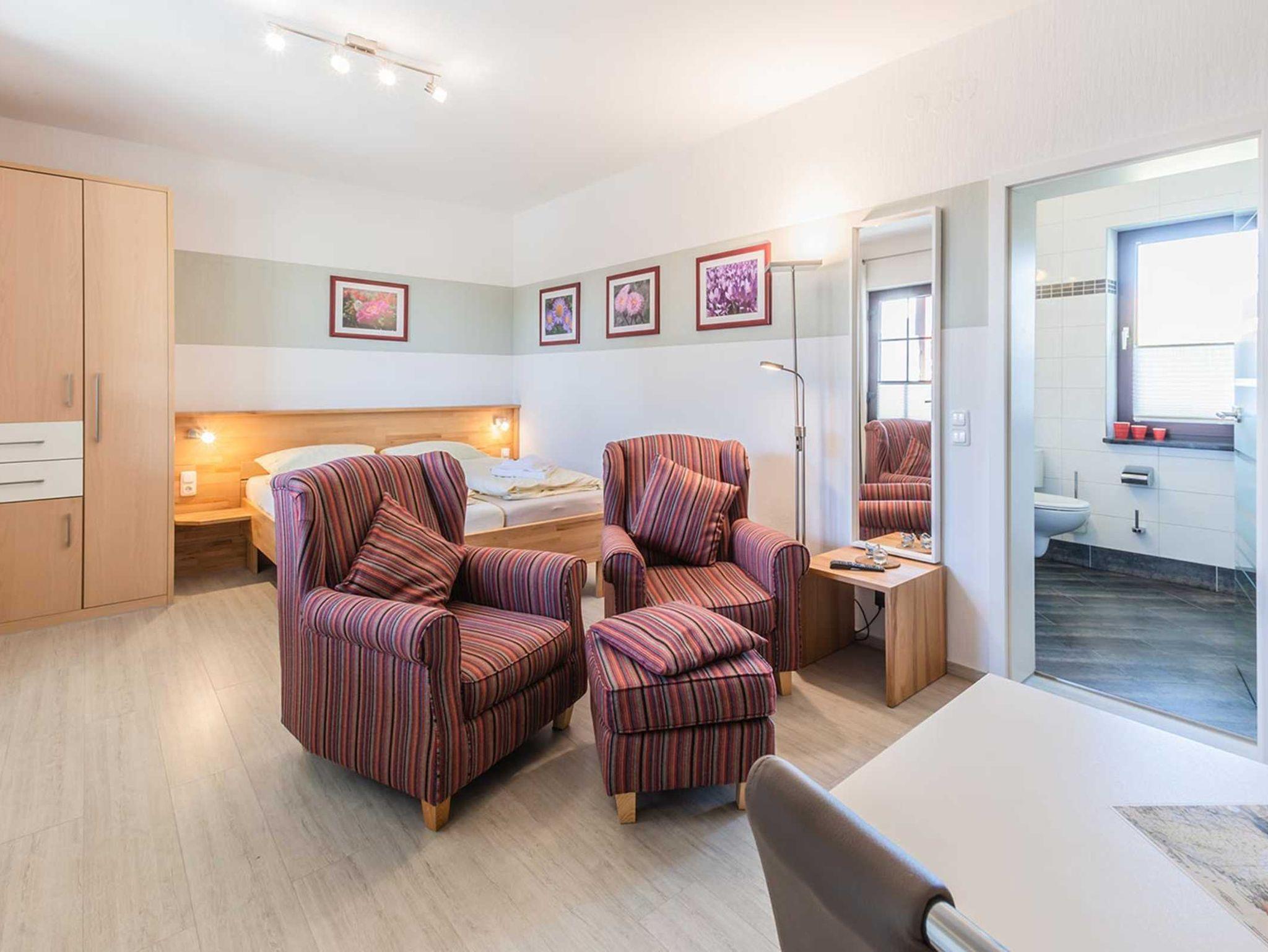 Diese schön eingerichtete 1-Raum Ferienwohnung (Nichtraucher) für bis zu 2 Personen ist ca. 26 m² groß und befindet sich in der linken Haushälfte im Erdgeschoss. Sie wurde komplett neu renoviert und ist hochwertig eingerichtet.