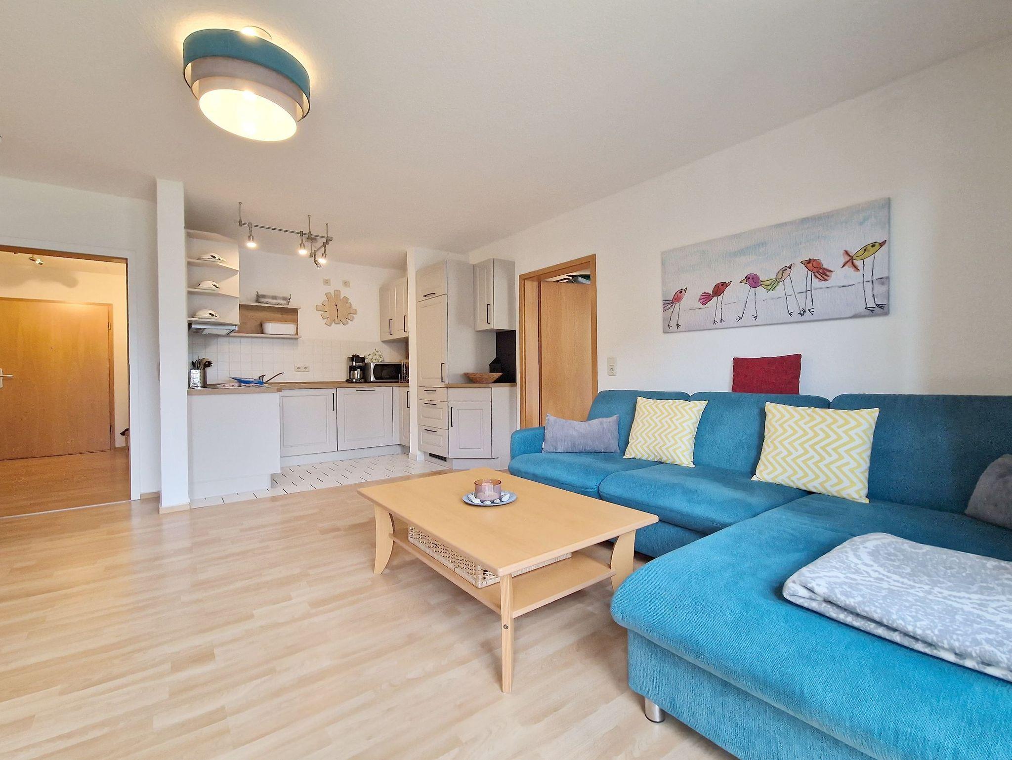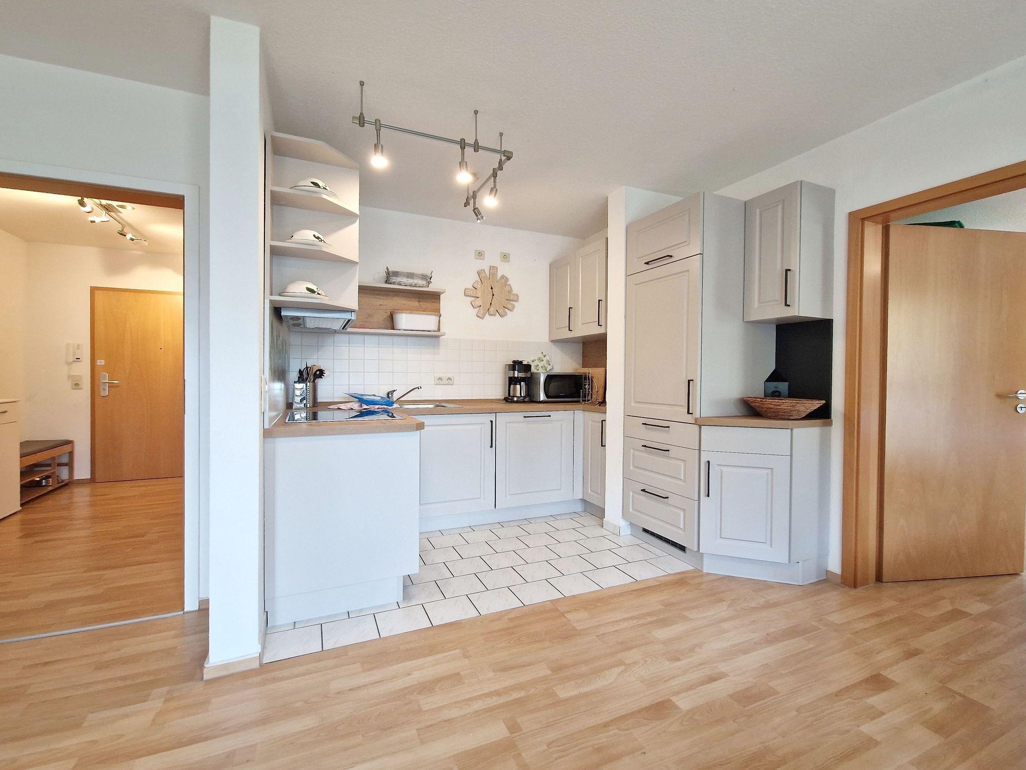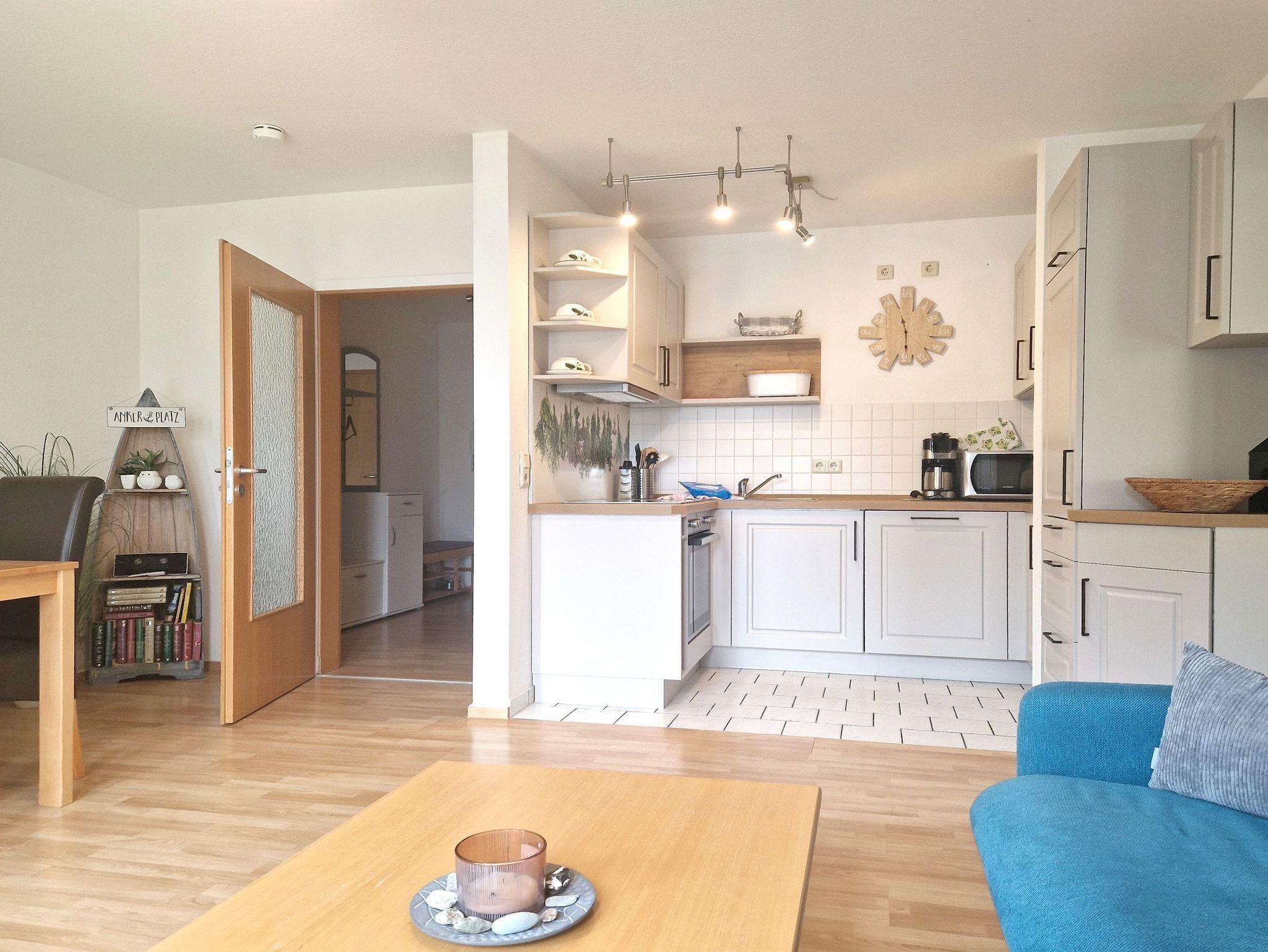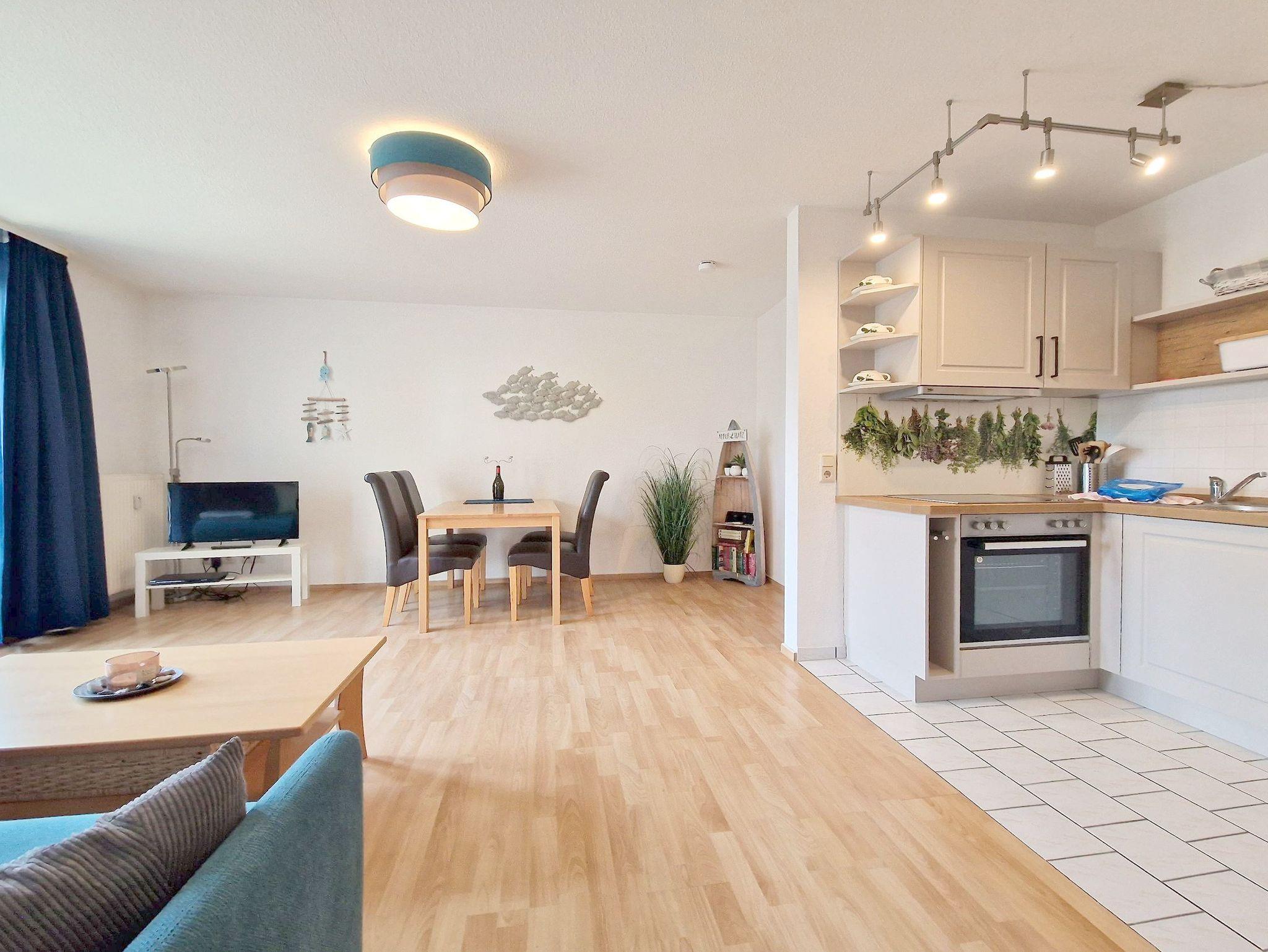 Der Wohnbereich ist mit einer gemütlichen Schlafcouch, sowie einem Flachbild TV eingerichtet. Die offene Küche mit Essbereich ist ausgestattet mit einem 4-Felder Ceranherd, Minibackofen, Kühlschrank mit Gefrierfach, Geschirrspüler, Kaffeemaschine, Toaster, Wasserkocher und reichlich Küchenutensilien. Die Wohnung bietet 1 Schlafzimmer mit gemütlichem Doppelbett und einer Couch. Vom Schlafzimmer gelangen Sie auf die Terrasse.