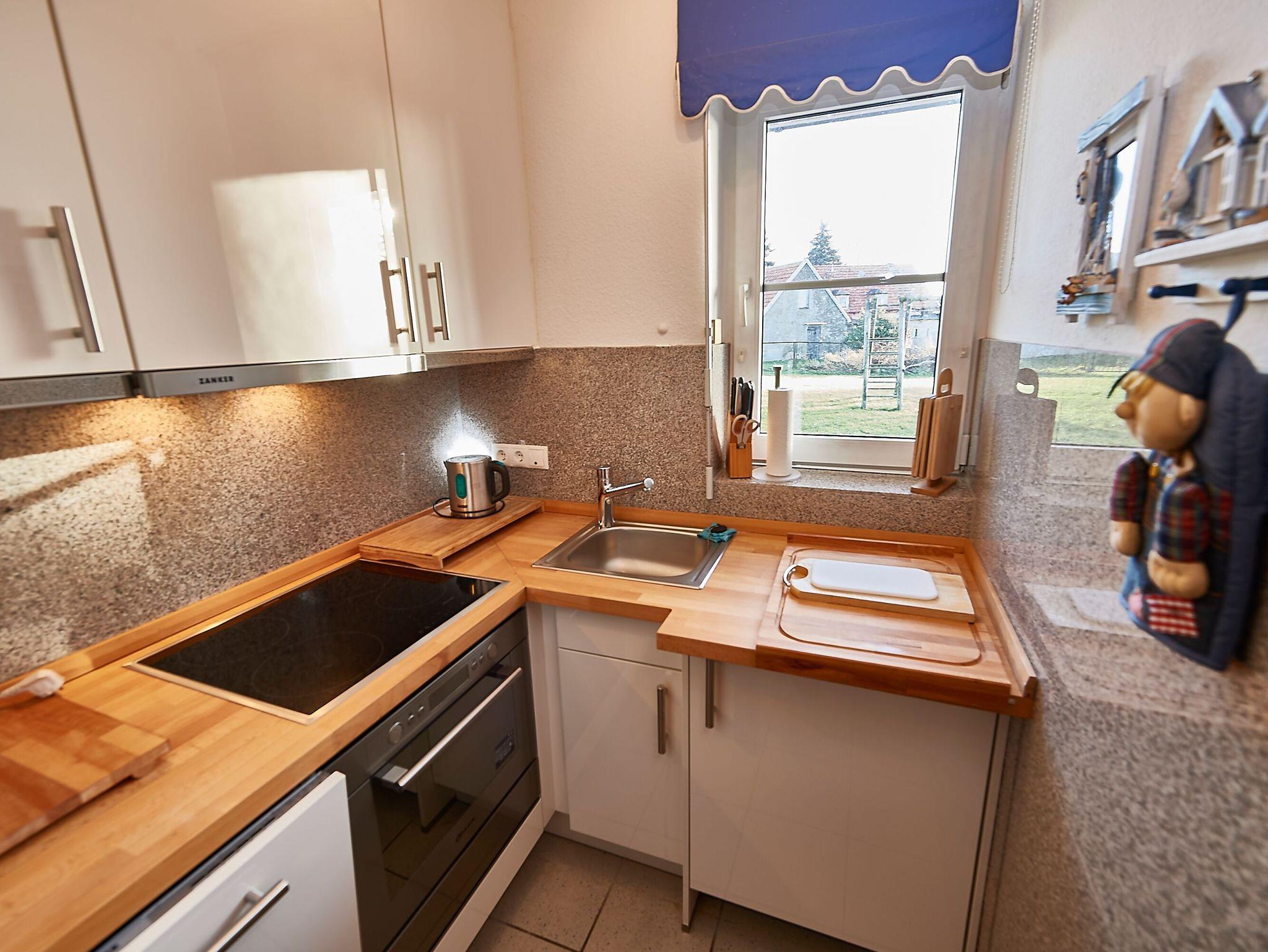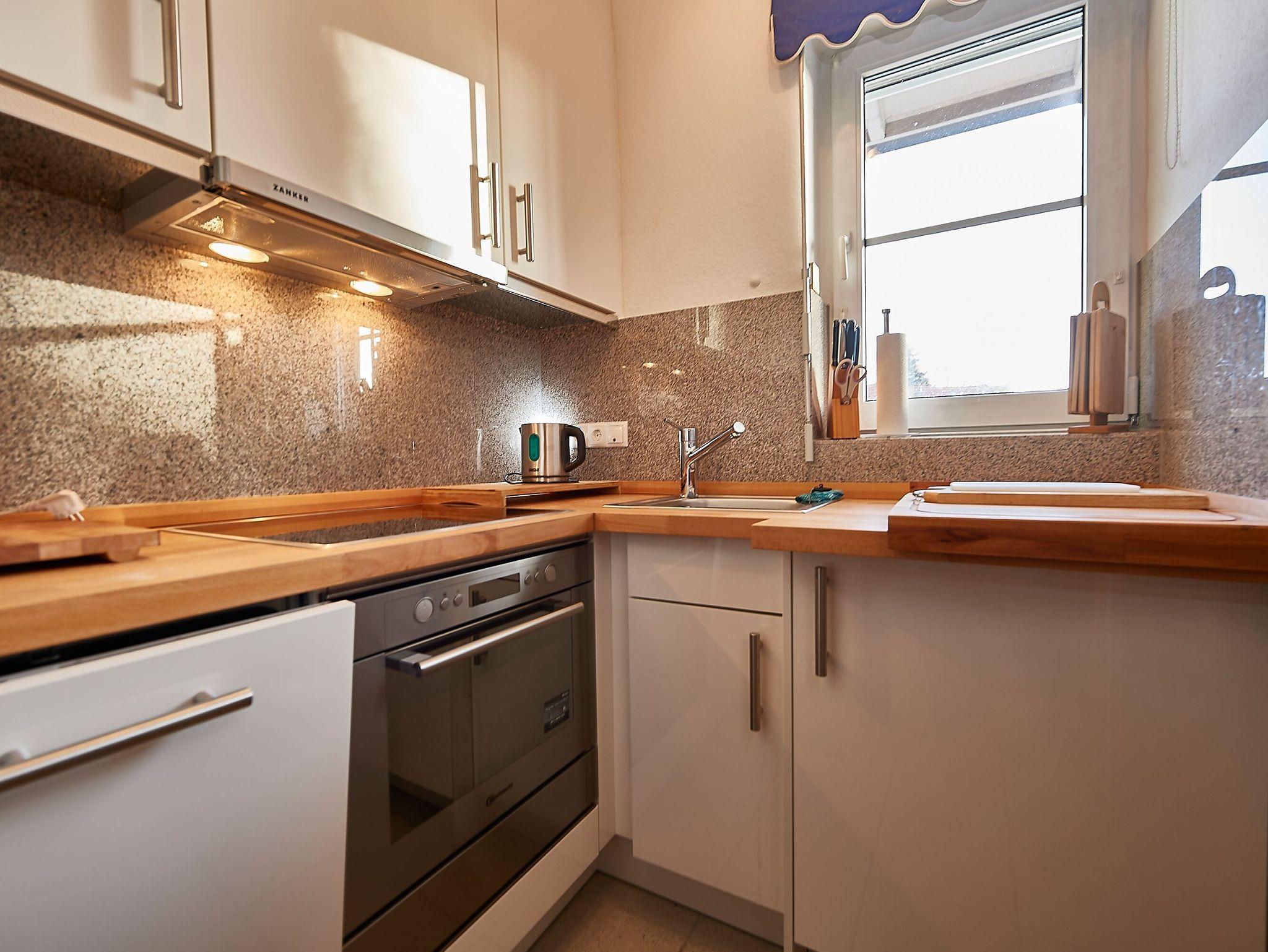 Die separate kleine Küche ist ausgestattet mit einem Induktionsherd, Spülmaschine, Backofen, Kühlschrank, Mikrowelle, Toaster, Kaffeemaschine, einem Wasserkocher und diversem Kleininventar, das die Küchenausstattung komplettiert.