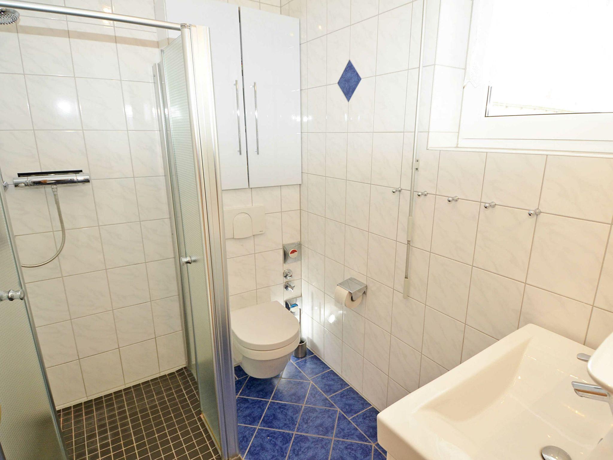 Ihr Badezimmer verfügt über Dusche/WC, einen Waschtisch und einen großen Spiegel.