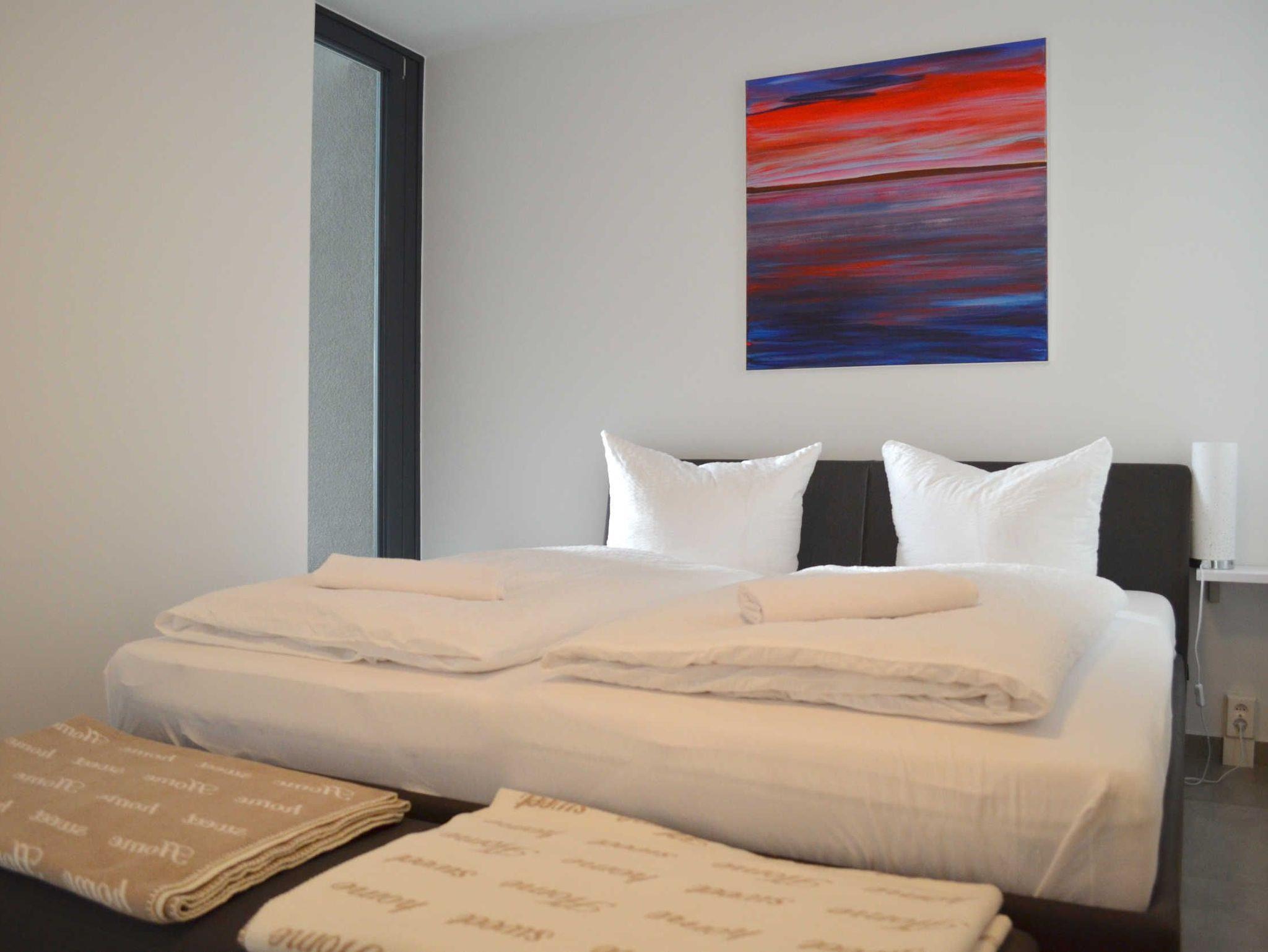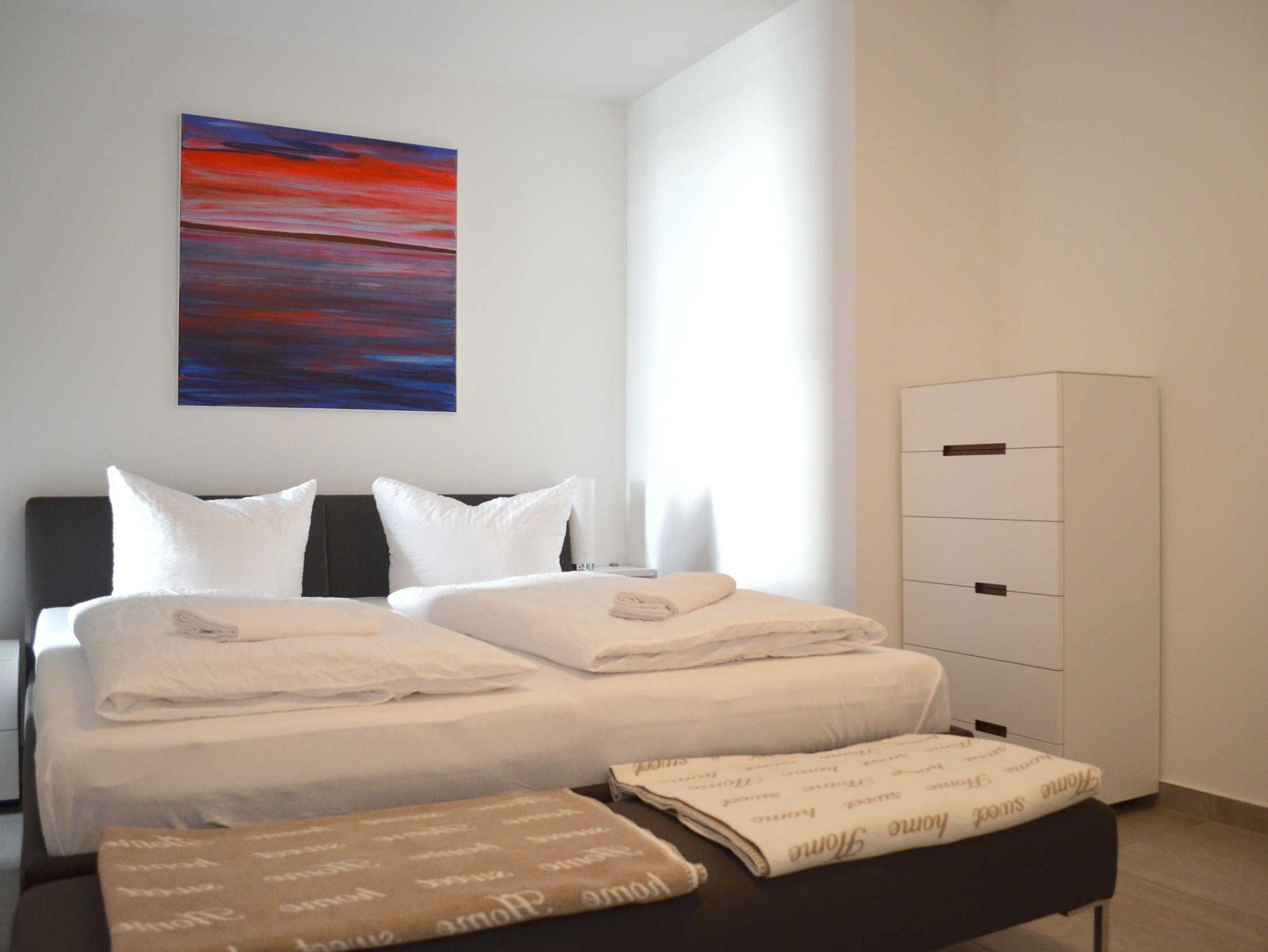 Die beiden Schlafzimmer sind mit jeweils einem gemütlichem Doppelbett (180x200m) sowie Schränken und Kommoden mit reichlich Stauraum eingerichtet und durch den intelligenten Zuschnitt der Wohnung sogar etwas voneinander separiert. Inspirierende Bilder einer irischen Künstlerin in allen Räumen sorgen für Atmosphäre und Klasse. Für Ihr Auto gibt es zudem einen geschützten, kostenfreien Tiefgaragen-Stellplatz.