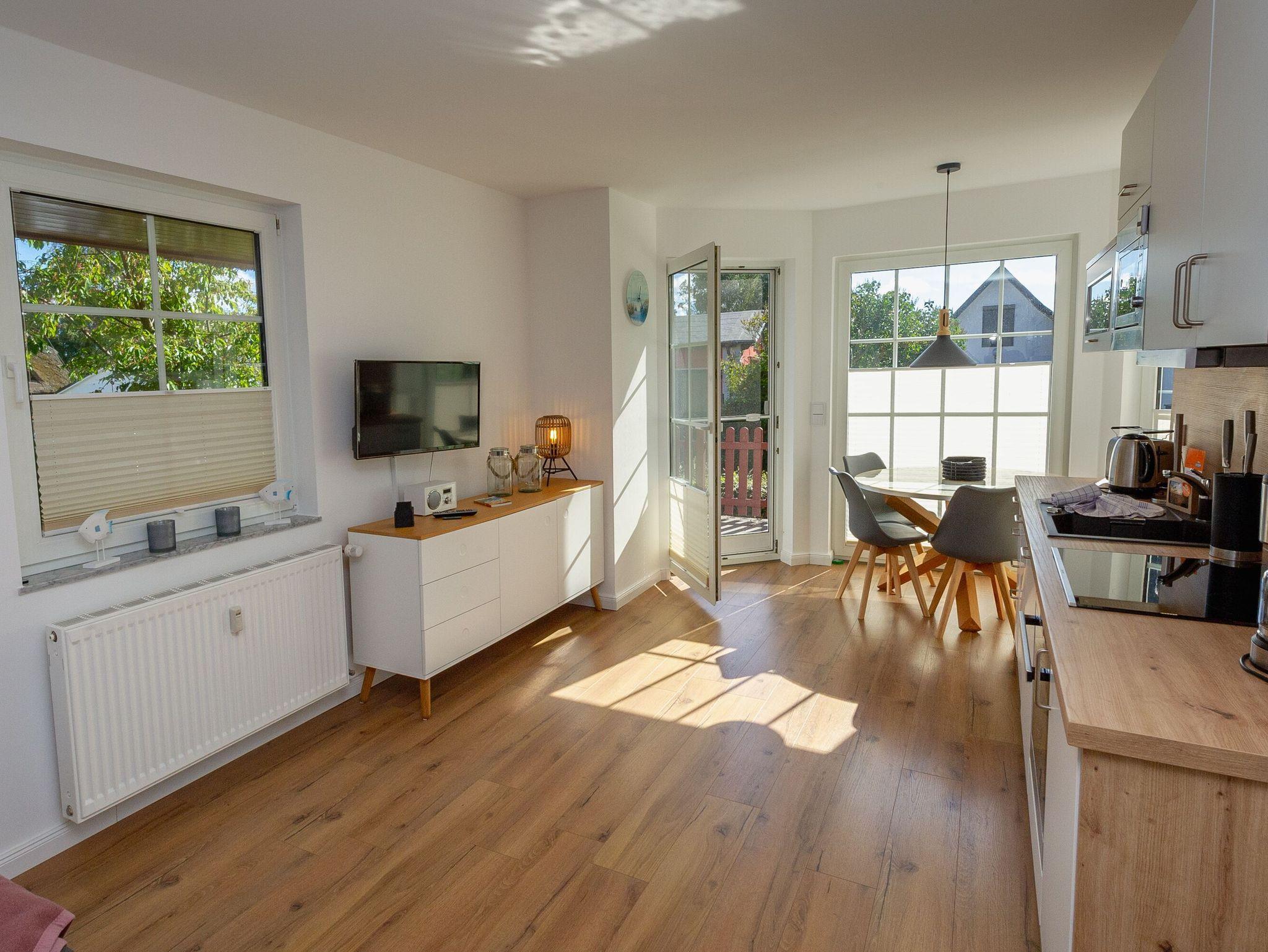 Dieses zauberhafte 2-Raum-Appartement mit rund 50 m² Wohnfläche begrüßt Sie im Erdgeschoss des reetgedeckten Hauses.