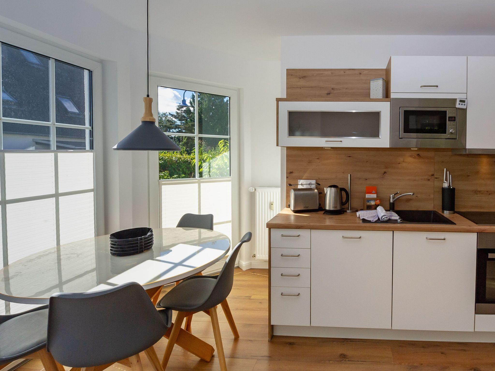 Im hell und freundlich eingerichteten Wohn-/Esszimmer stehen Ihnen u.a. eine komfortable Schlafcouch (Aufbettungsmöglichkeit für zwei Personen), ein großer SMART-TV und ein Radio mit Bluetooth-Anschluss zur Verfügung. W-LAN ist selbstverständlich ebenfalls vorhanden und kostenfrei nutzbar. Am runden Esstisch im sonnenbeschienenen Erker findet die ganze Familie Platz. Wenn das Wetter es erlaubt, können Sie auch ganz wunderbar draußen an der frischen Luft sitzen; eine große Terrasse zur Morgen- und Vormittagssonne macht es möglich.