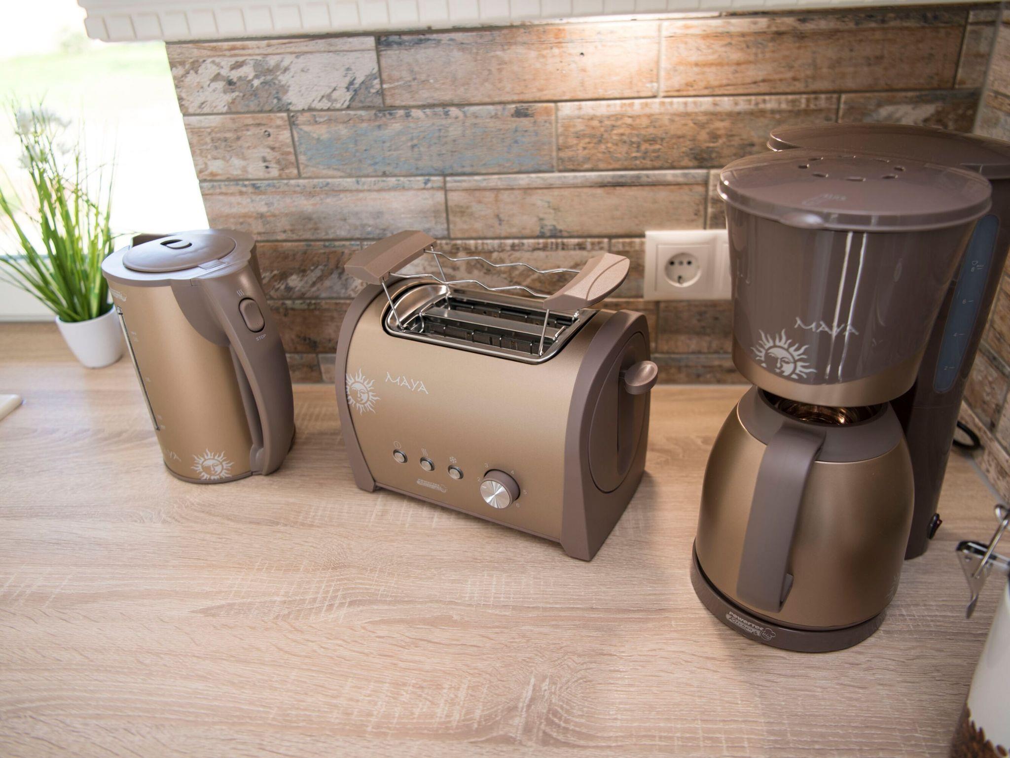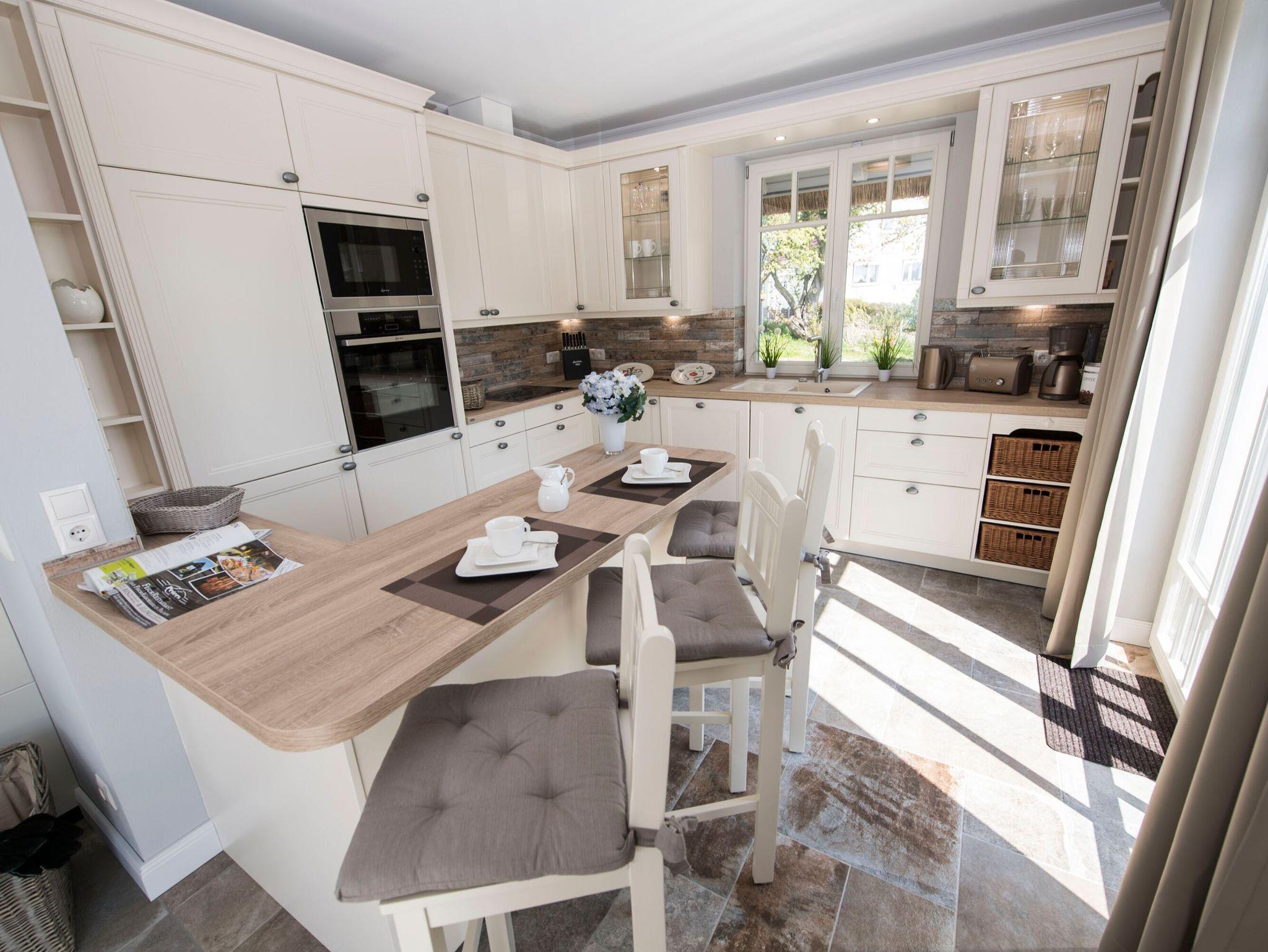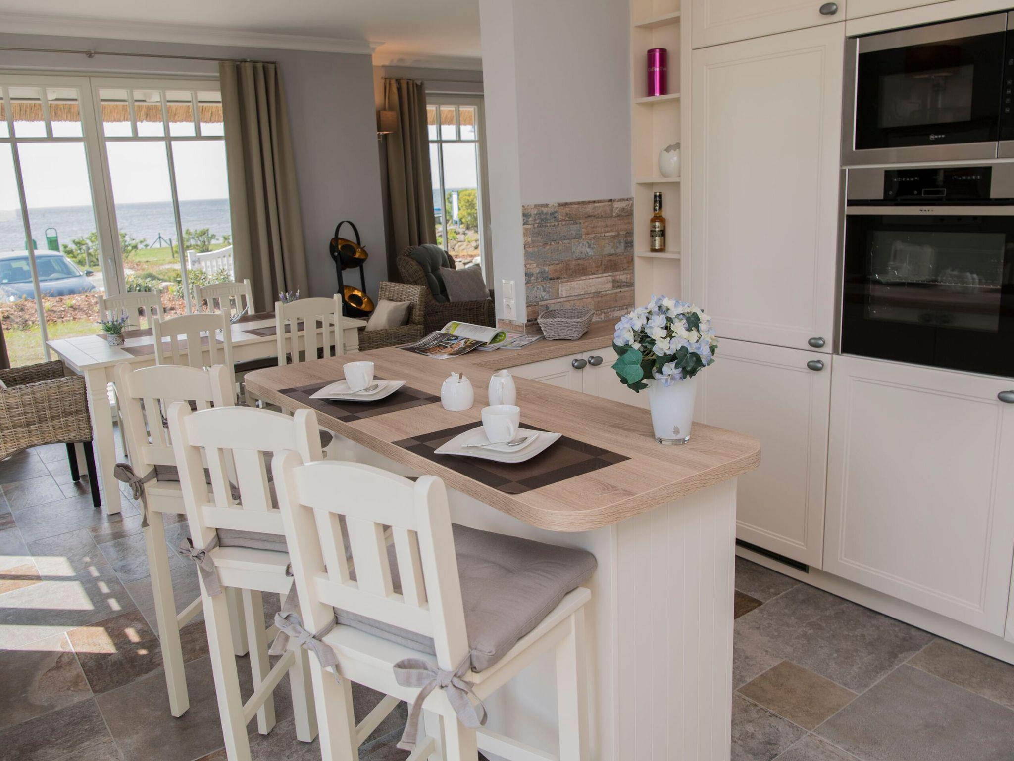Im angrenzenden Küchenbereich befindet sich eine komplett ausgestattete Küchenzeile mit einem 4-Zonen-Induktionskochfeld, Backofen, Mikrowelle, Geschirrspüler, Kühlschrank mit Gefrierfach, Kaffeemaschine, Toaster, Wasserkocher und diversem Kleininventar. Ein Küchentresen mit Hockern komplettiert die hochwertige Einrichtung.