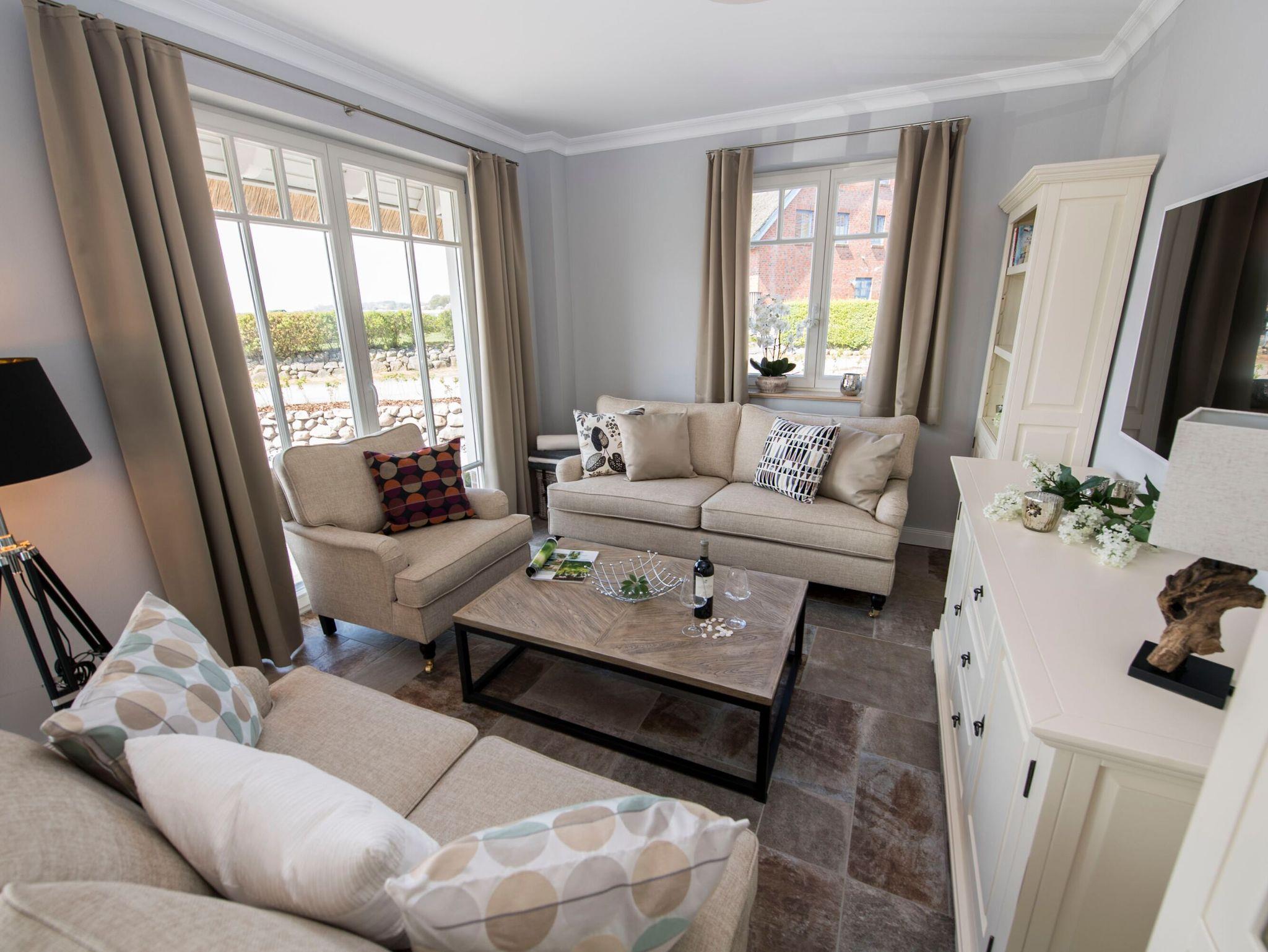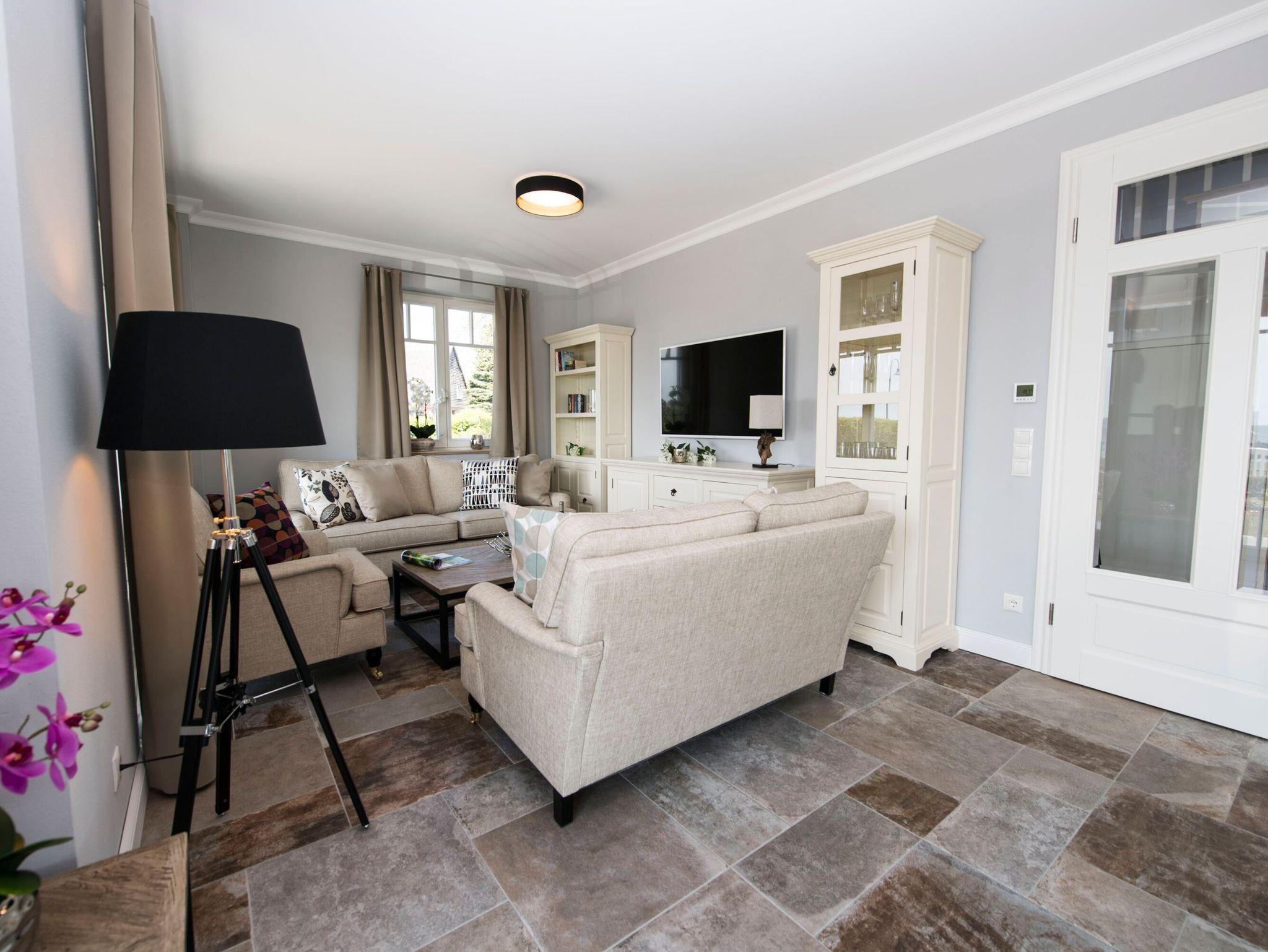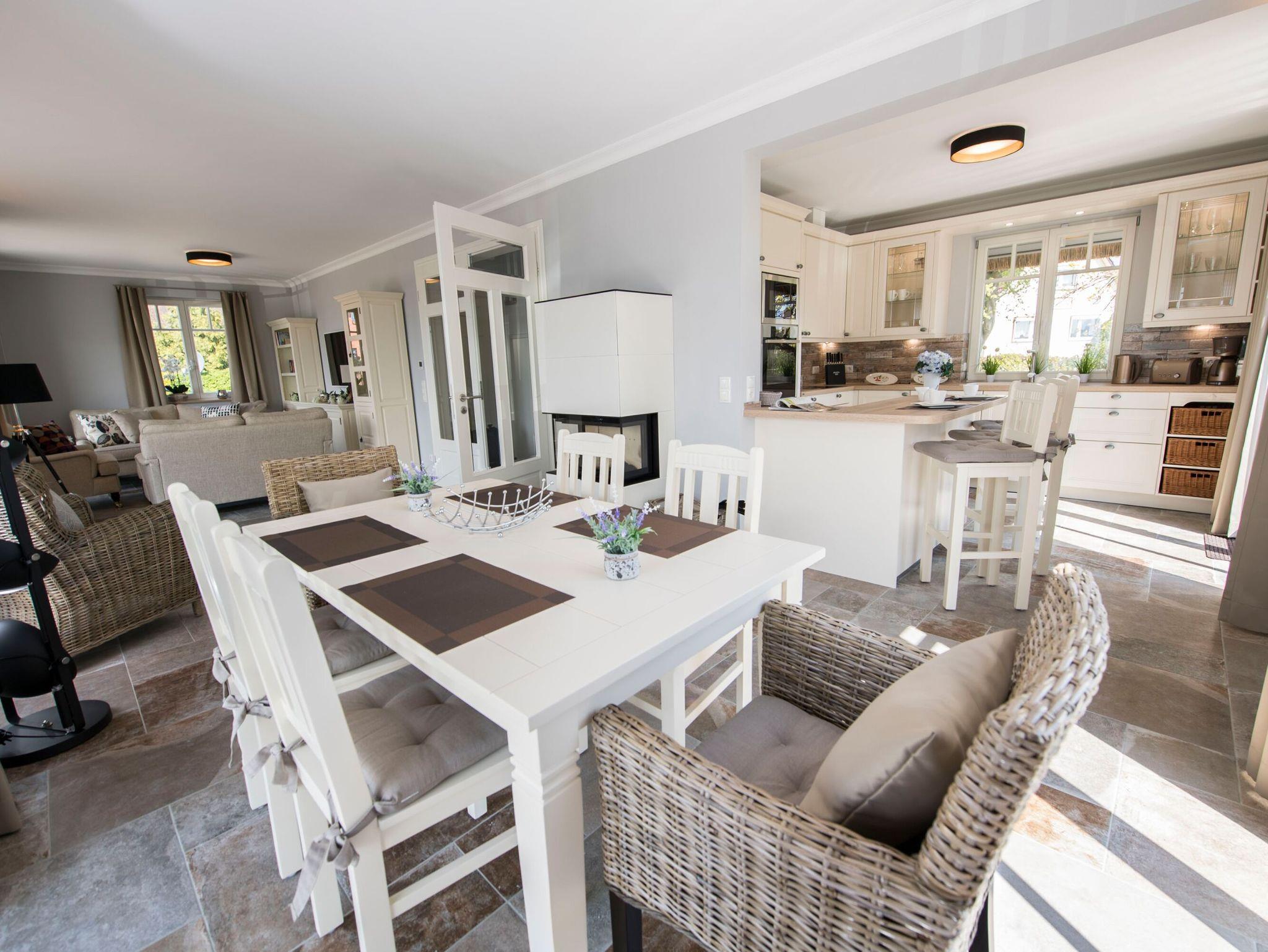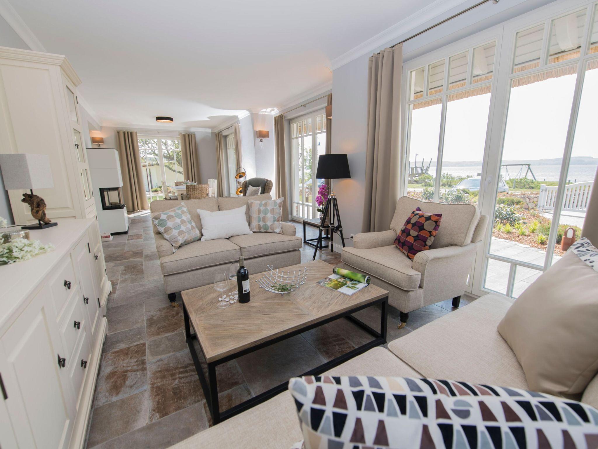 Der großzügige Wohnbereich mit Esstisch für sechs Personen und einer angrenzenden, hochwertigen Küche befindet sich im Erdgeschoss. Das Wohnzimmer ist mit einer gemütlichen Sitzecke und einem Flachbild-TV ausgestattet. In der kühleren Jahreszeit verbreitet ein prasselndes Kaminfeuer die besondere Gemütlichkeit. Zwei gemütliche Sitzgelegenheiten, platziert vor einer der großen Glasfronten laden zum Verweilen und Entspannen ein und bieten einen ungehinderten Blick auf die Weite der Hagenschen Wieck und die Zickerschen Berge.