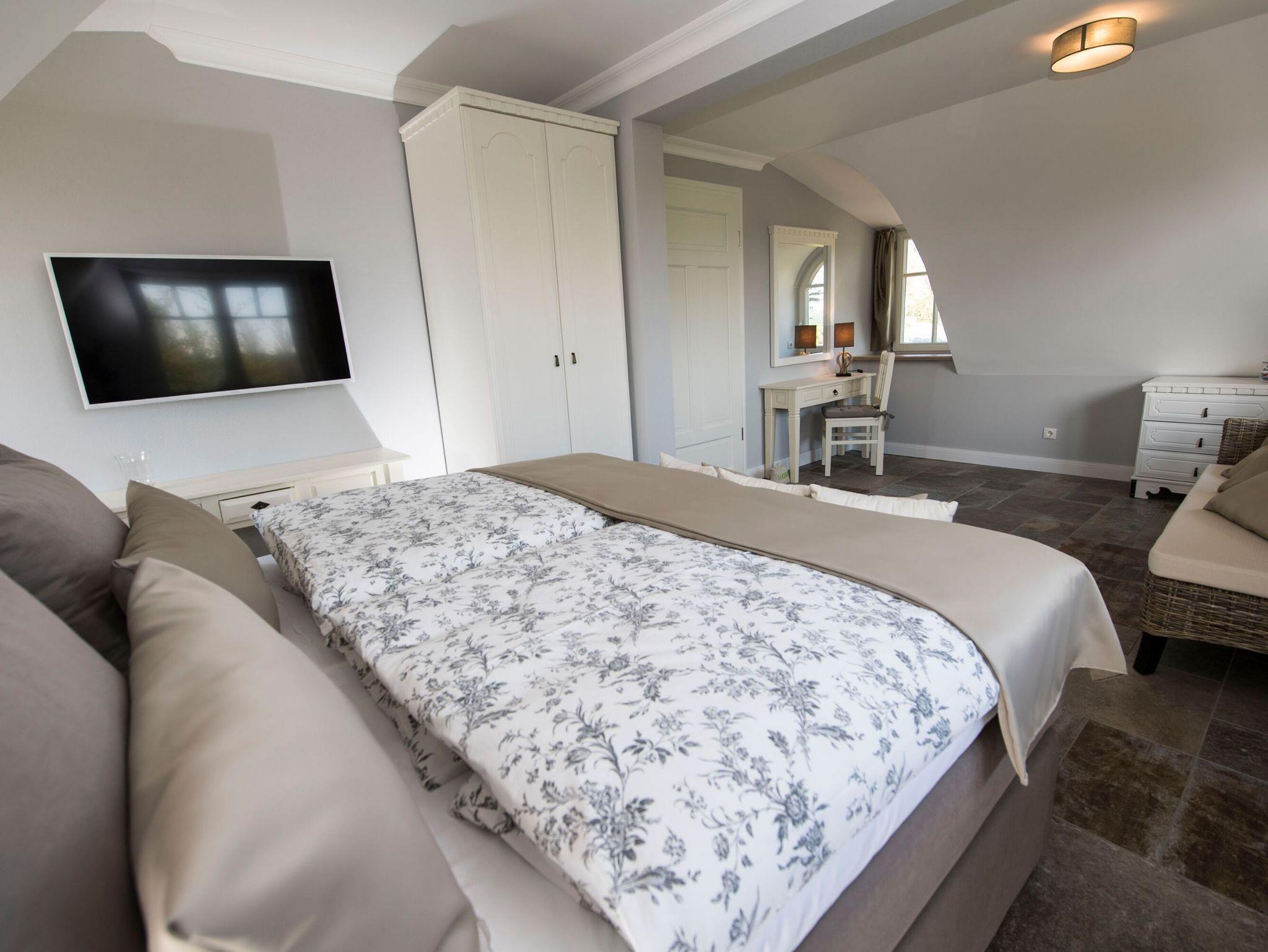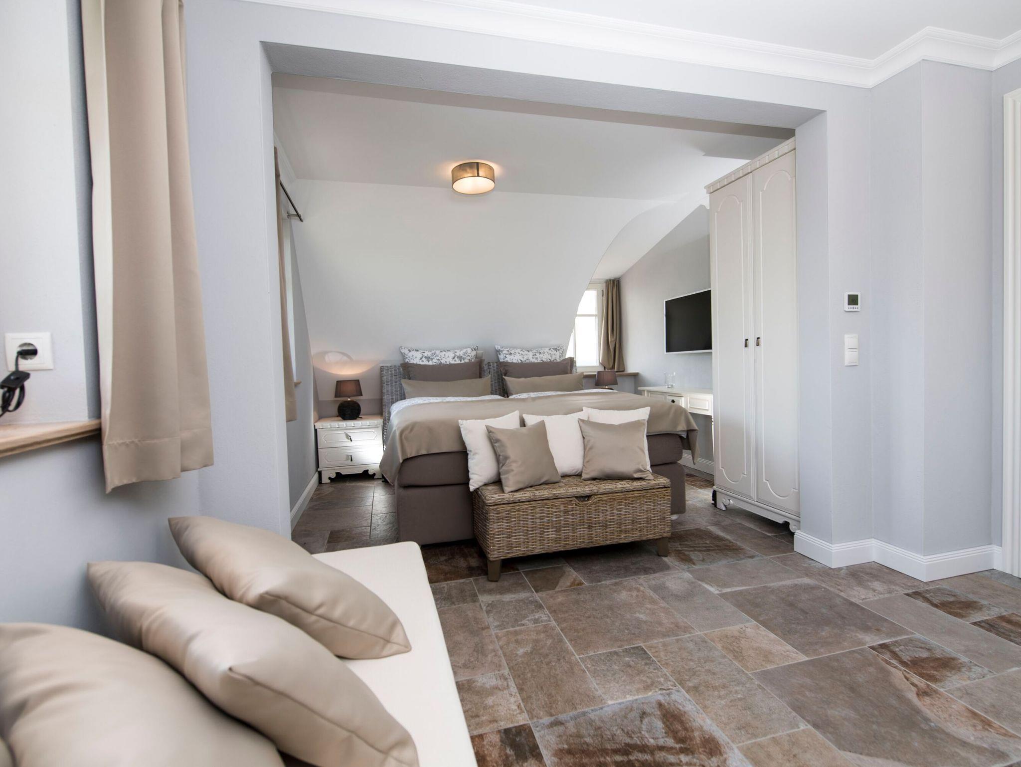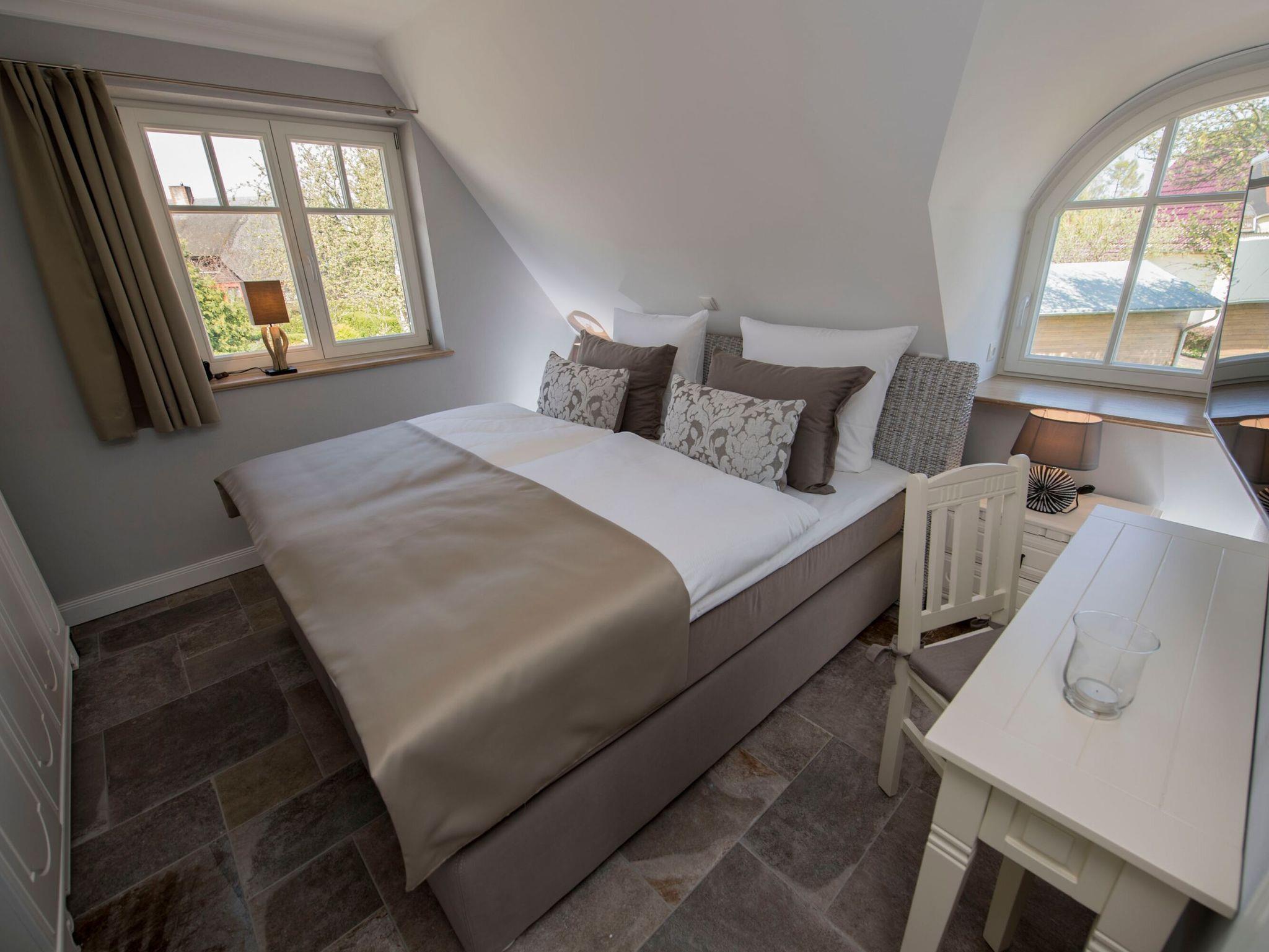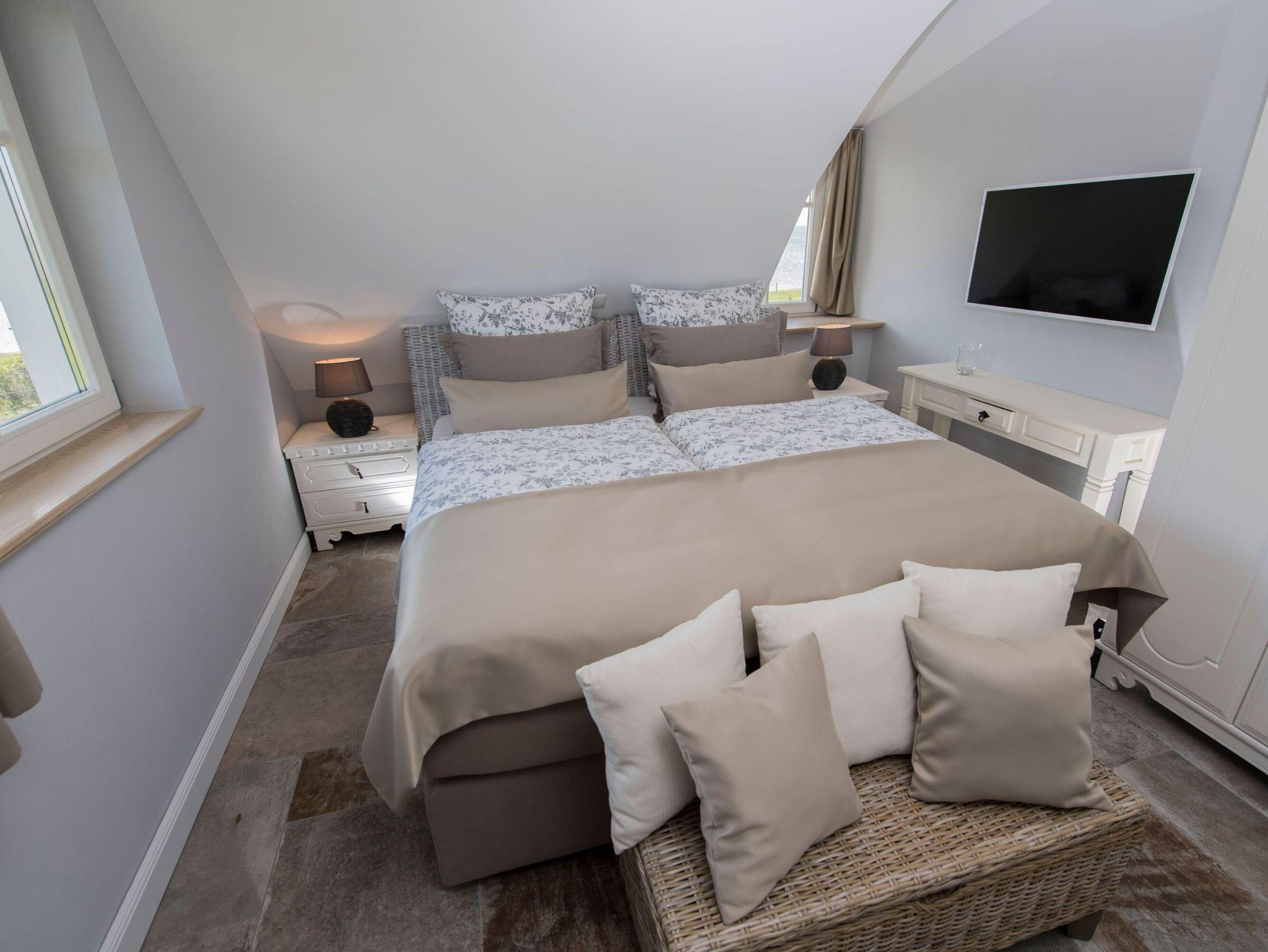 Über eine Treppe gelangen Sie in das Obergeschoss des Hauses. Hier befinden sich zwei geräumige Schlafzimmer mit jeweils einem großen, bequemen Doppelbett (1,80 m x 2,00 m) und einem eigenen Flachbild-TV. Je ein Kleiderschrank bietet ausreichend Platz für Ihre Urlaubsgarderobe. In einem der Schlafzimmer gibt es zusätzlich einen separaten Ankleidebereich, in dem eine Recamiere zum Platznehmen einlädt.