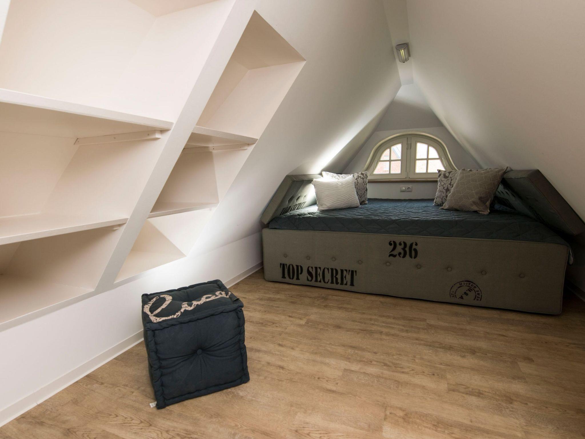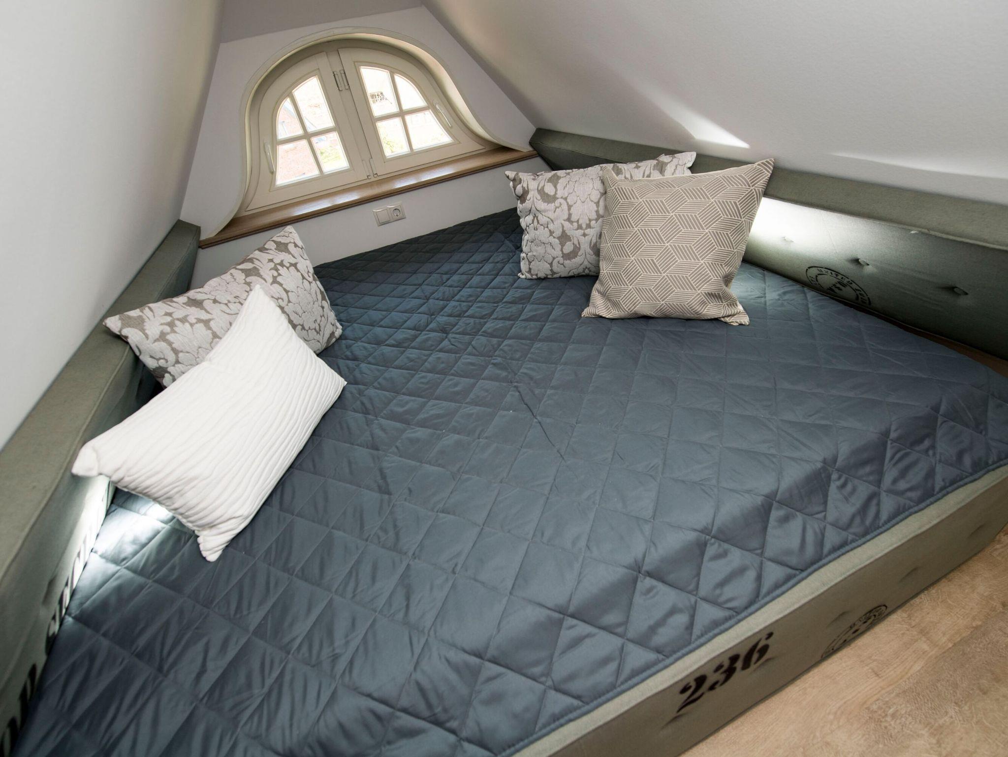 Die dritte Schlafgelegenheit mit einem einzeln stehenden Kajütenbett (ca. 1,60 x 2 m) befindet sich im ausgebauten Spitzboden des Hauses.