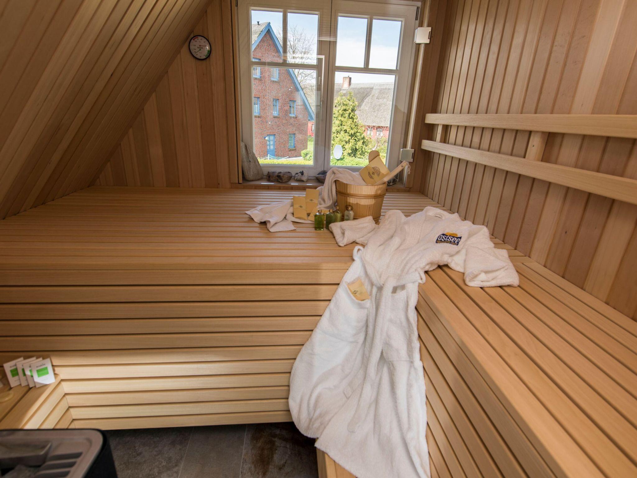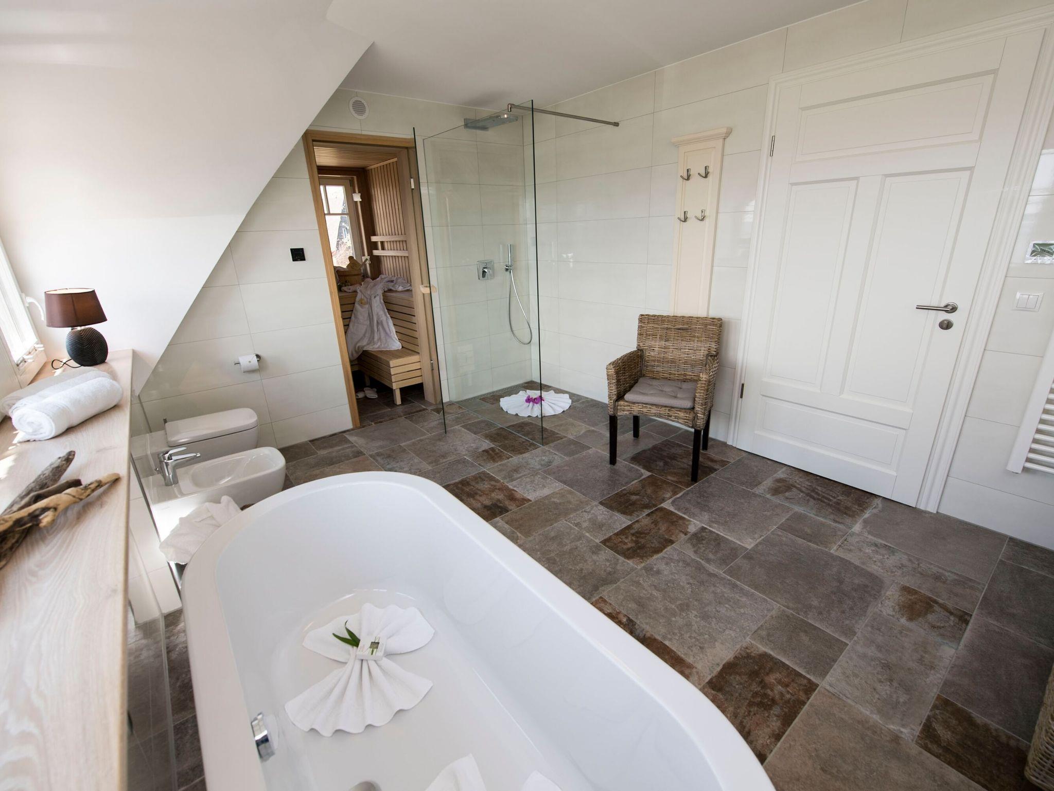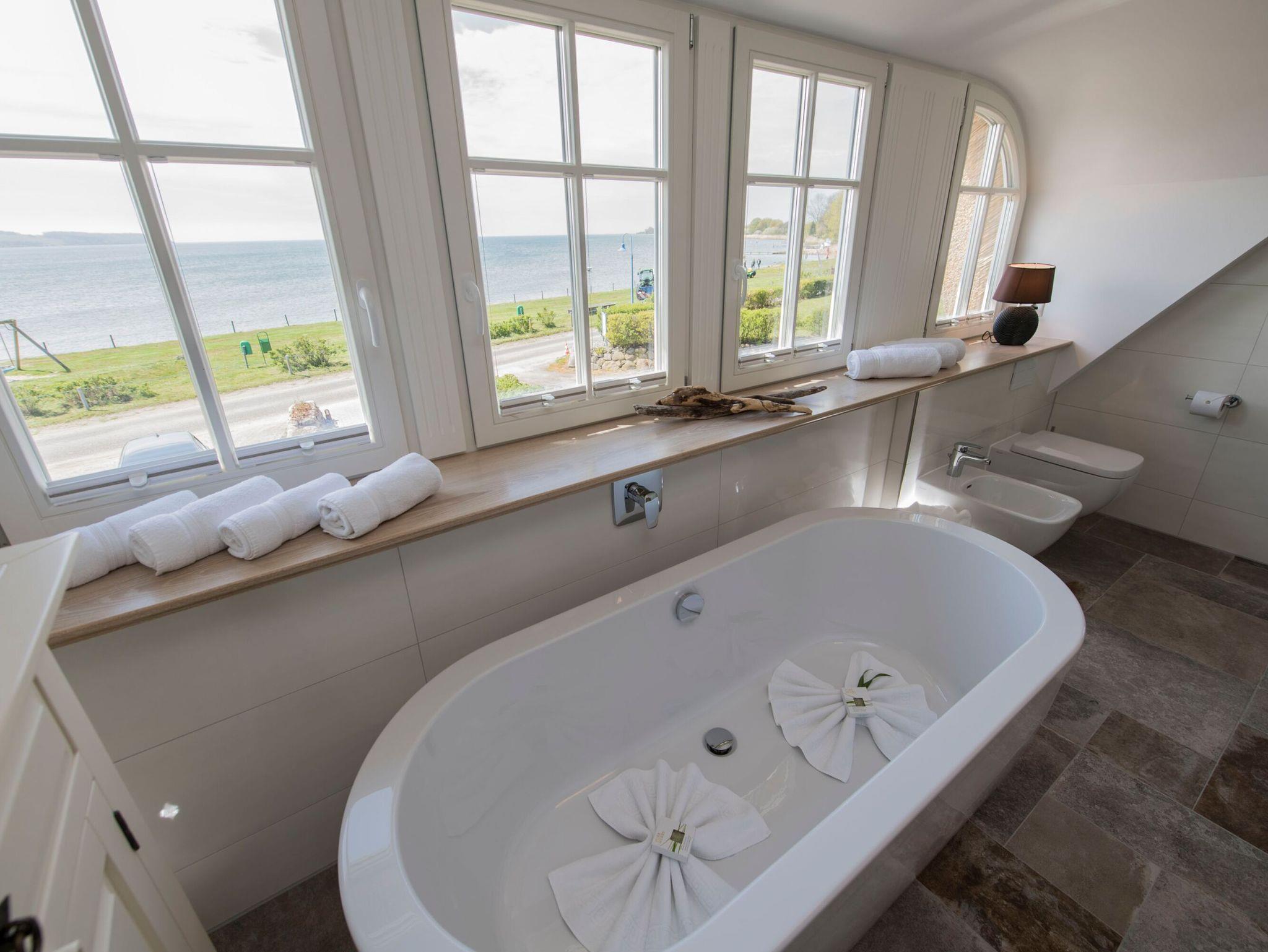 Das Highlight auf dieser Etage ist das zweite Bad dieses Hauses. Von der Badewanne aus bietet sich ein atemberaubender Blick auf die Hagensche Wieck. Hier ist Entspannung garantiert ? unabhängig vom Wechsel der Jahreszeiten. Eine große Walk-In-Dusche, ein Waschtisch, ein WC, ein Bidet sowie ein weiterer Flachbild-TV machen aus diesem Raum eine wahre Wellness-Oase. Eine Sauna, ebenfalls mit herrlichem Ausblick rundet den exklusiven Eindruck ab.