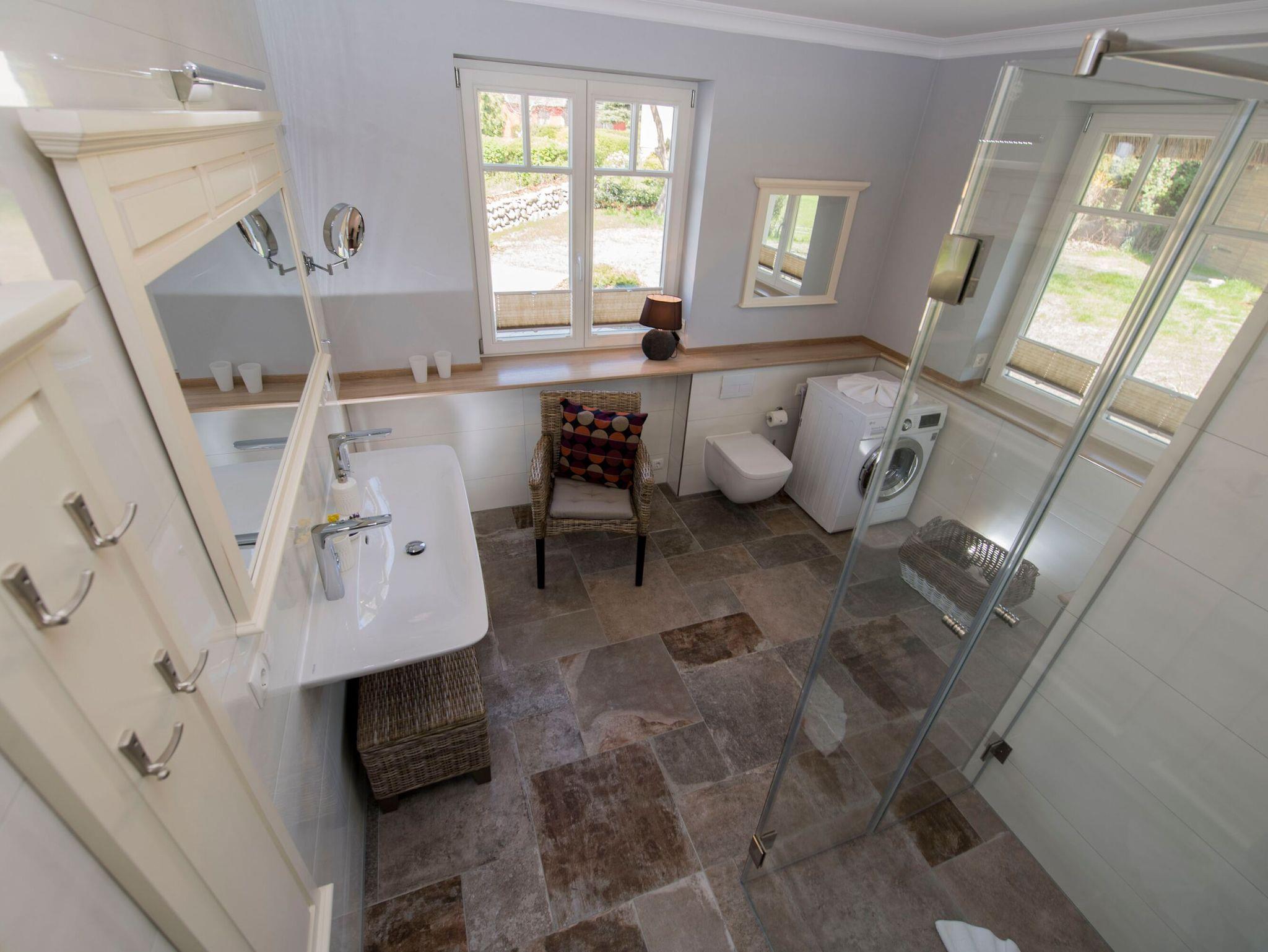 Eines der modernen Bäder ist ebenfalls im Erdgeschoss zu finden. Es verfügt über einen Waschtisch, eine Dusche und ein WC. Eine Waschmaschine ist ebenfalls vorhanden.