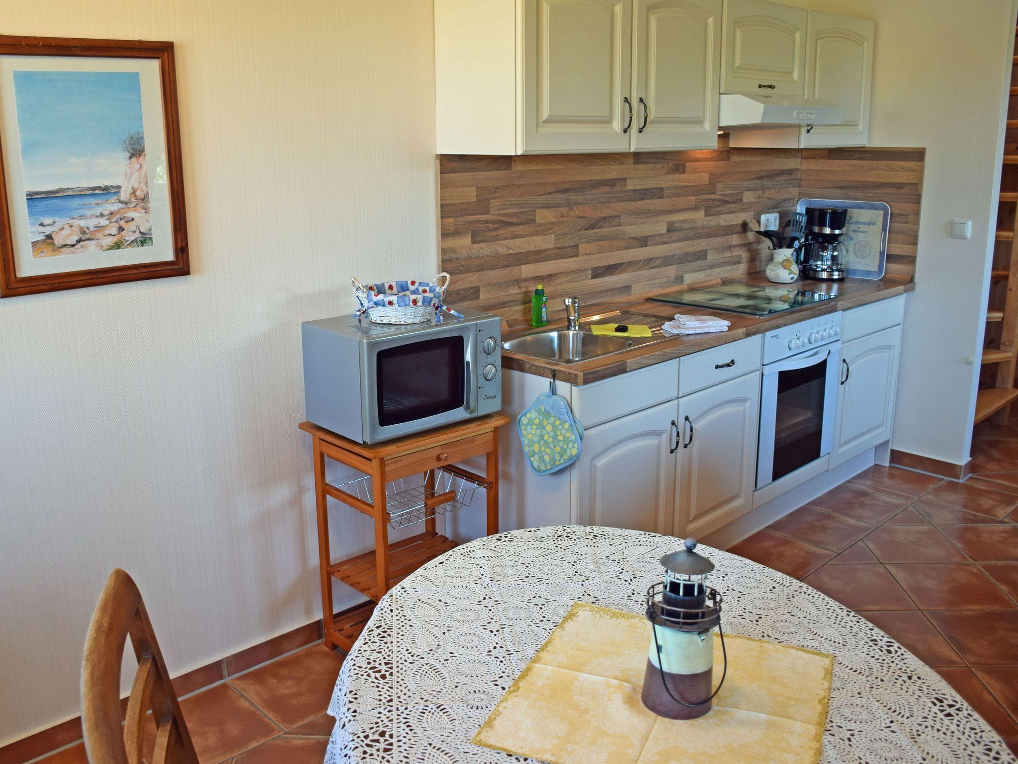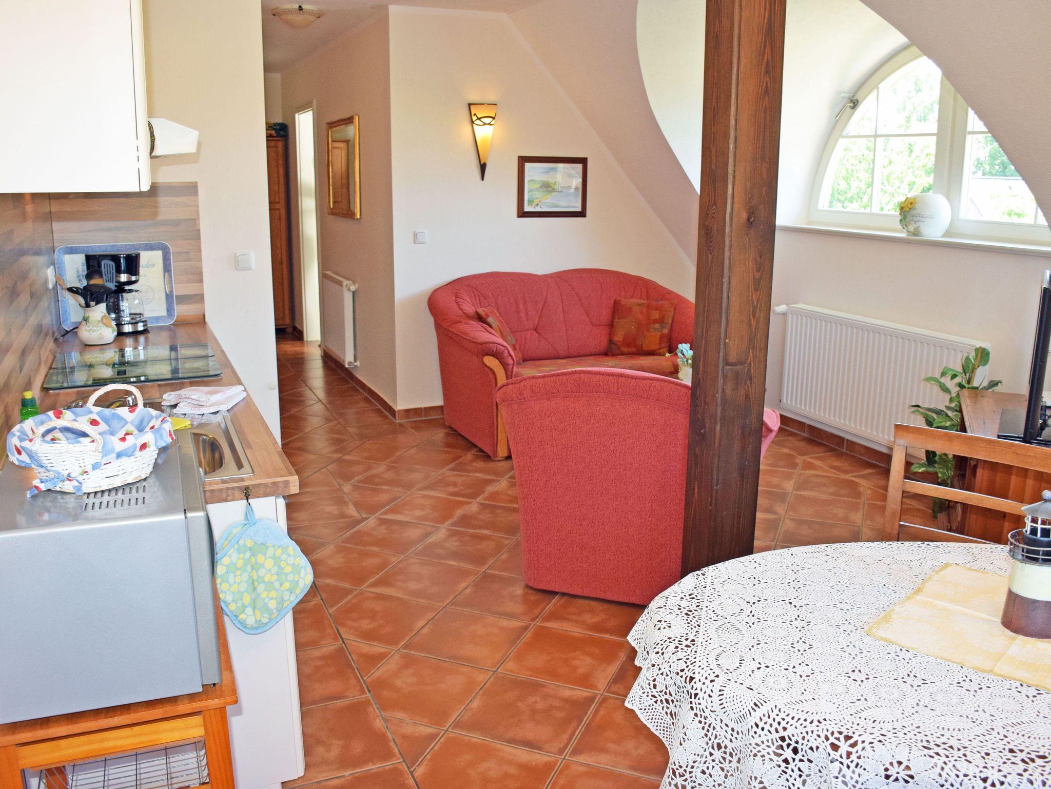 Diese großzügige und sehr liebevoll eingerichtete Maisonette Appartement verfügt über ein Wohnzimmer mit Küche und ein Schlafzimmer sowie Bad/WC und Flur. Es befindet sich im Obergeschoss des Landhus, das Schlafzimmer ist über eine Treppe bequem zu erreichen. Sehr schön sind hier die großen Gaubenfenster. Im Schlafzimmer steht ein Doppelbett. Im Wohnraum gibt es eine Couch mit Sitzgelegenheiten. Das Bad ist mit Dusche und Badewanne ausgestattet. Die komplette Einbauküche mit 4-Platten-Ceranherd, Backofen, Mikrowelle, Kaffeemaschine, Toaster, Wasser- und Eierkocher, Kühlschrank usw. lässt keine Wünsche offen. In diesem Appartement ist das Mitbringen von Kleintieren nicht möglich!