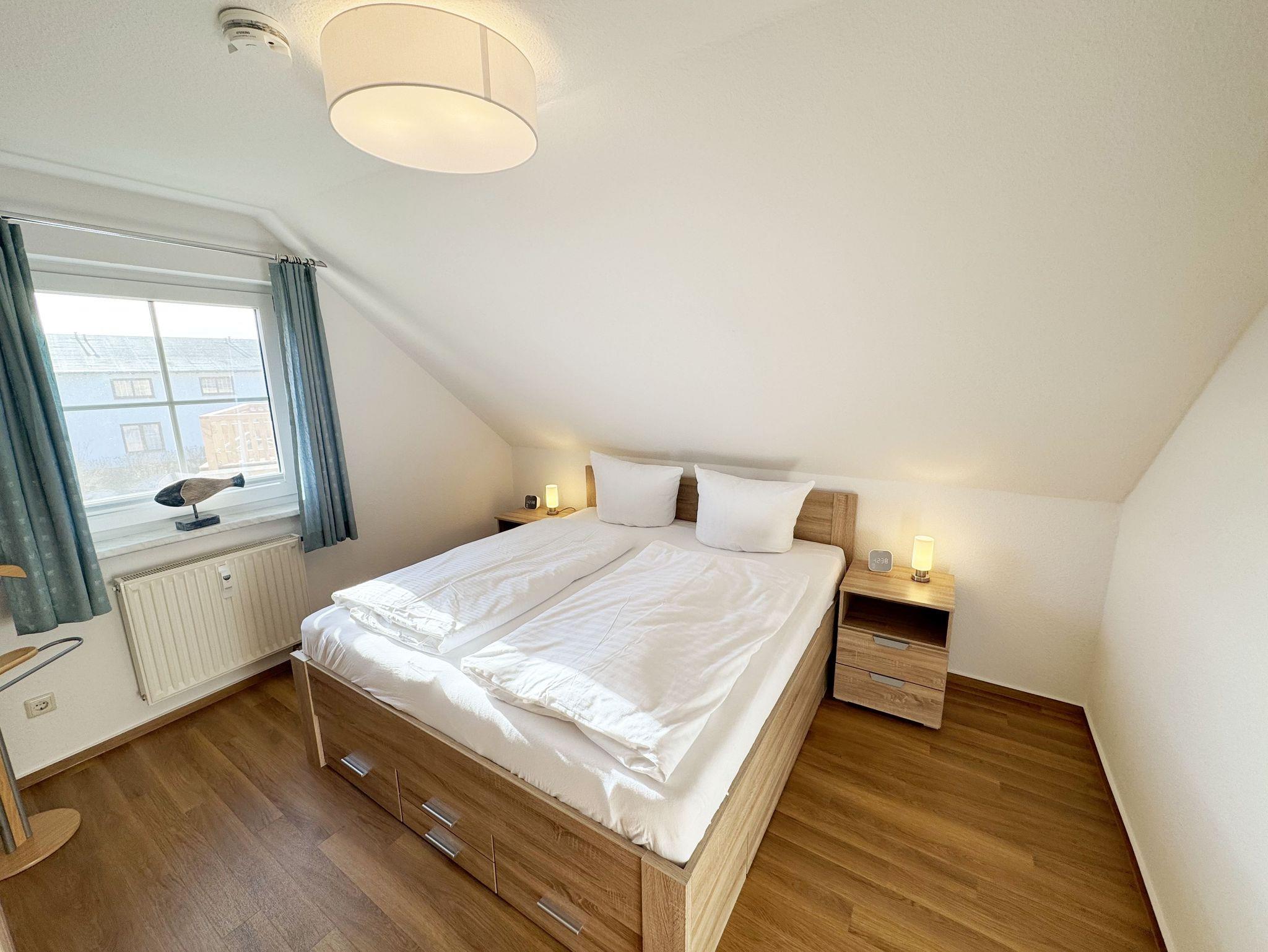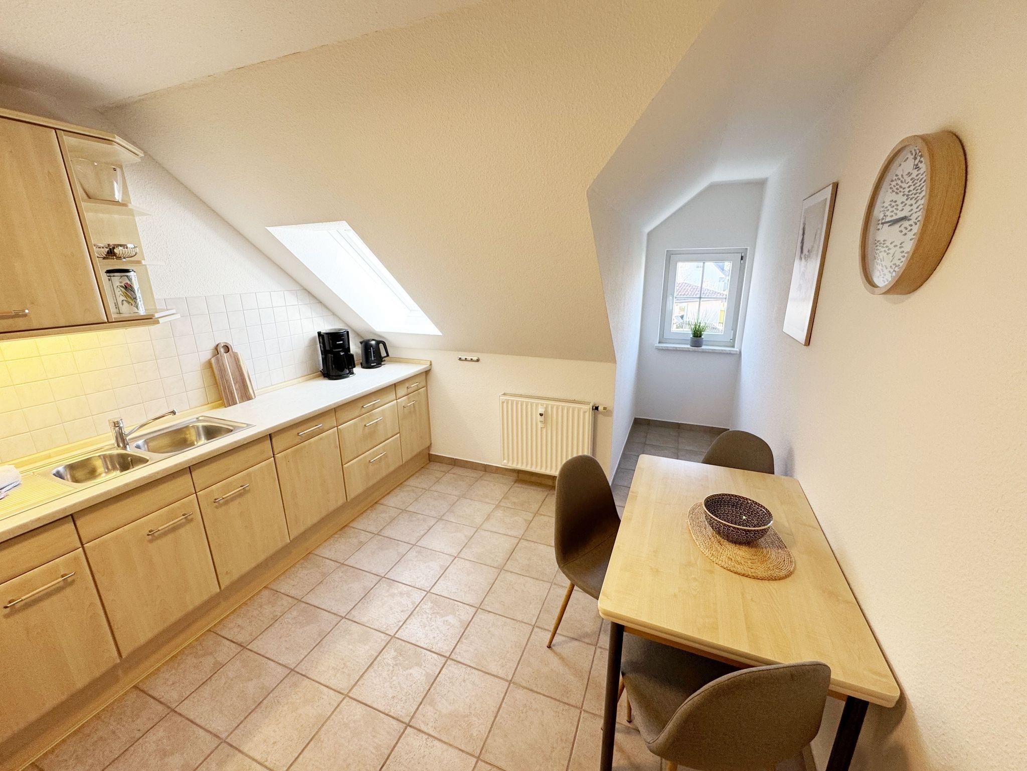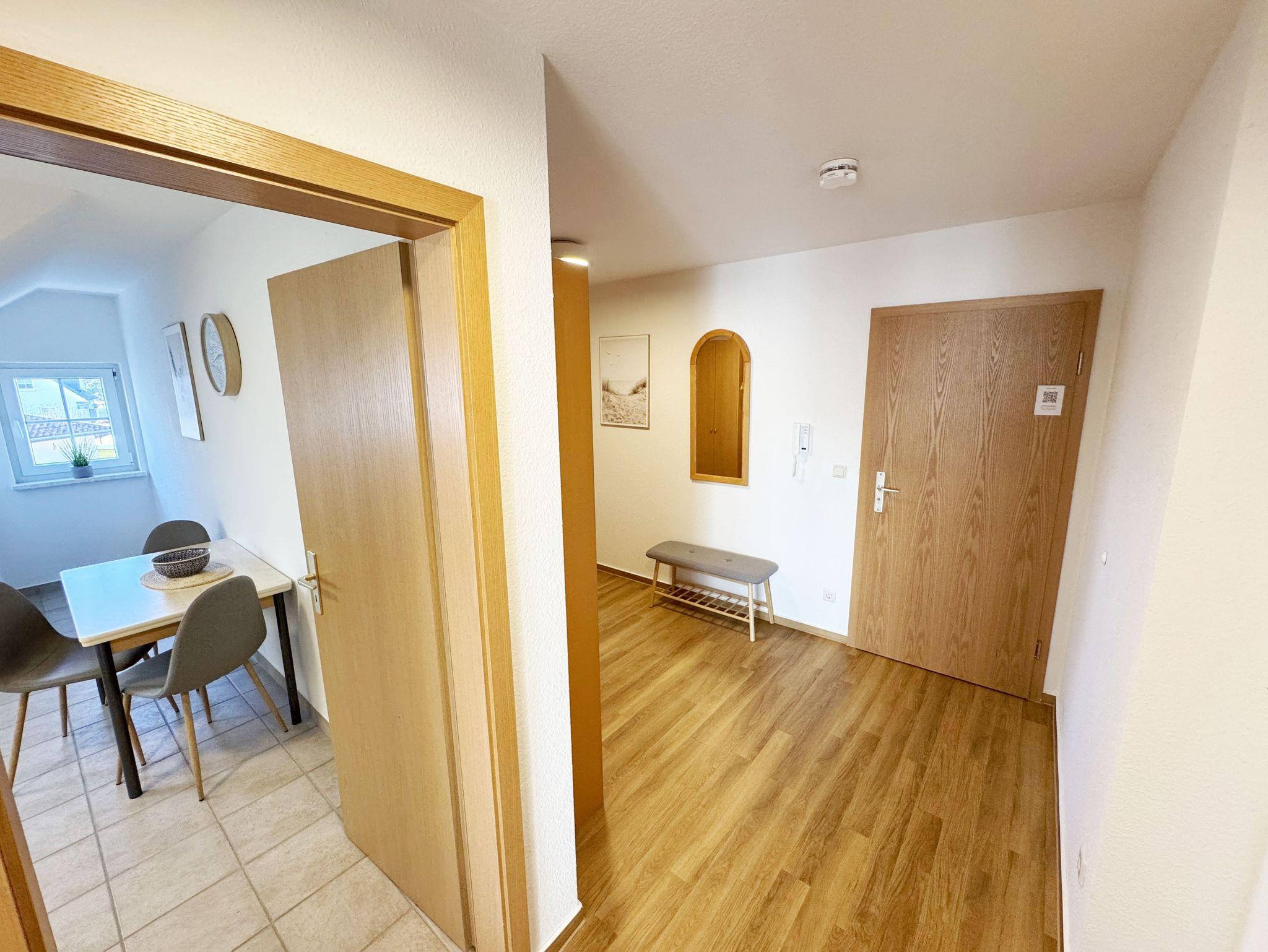 Die mit 87 m² komfortable eingerichtete Nichtraucherwohnung befindet sich in der 1. Etage und bietet ausreichend Platz für max. 4 Erwachsene + 1 Kleinkind bis 3 Jahre im Kinderreisebett. Im großzügigen Wohnbereich laden ein 3-Sitzer, 2-Sitzer, ein Sessel, ein Couchtisch, eine Leselampe, Sideboard mit DAB-Radio sowie ein TV Board mit Smart-TV zum Verweilen ein. Ein Essplatz rundet den Wohnbereich ab. Auf dem bestuhlten Balkon mit Ostausrichtung gelangen Sie vom Wohnbereich. Beide Schlafzimmer sind mit je einem Doppelbett (2,00m x 2,10m & 2,00m x 2,00m), verstellbaren Lattenrosten, Nachttischablagen, Verdunklungsmöglichkeiten, Insektenschutzgitter und einen Kleiderschrank ausgestattet. Für die Gemütlichkeit sorgt in diesen beiden Zimmern ein Teppichboden. Die separate Küche verfügt einen Kühlschrank mit Eisfach, über ein Ceranfeld, mit Abzugshaube, einen Backofen, Geschirrspüler, Kaffeemaschine, Wasserkocher, Toaster, diverse Küchenutensilien und einen kleinen Tisch mit Bestuhlung. Das Tageslicht-Bad ist mit einer Dusche, ein WC, ein Waschtisch und einen Fön ausgestattet. Im kleinen Abstellraum befinden sich Reinigungsutensilien, ein Bügelbrett und Bügeleisen sowie ein Wäscheständer. Für unsere kleinen Gäste ist ein Hochstuhl und Kinderreisebett inklusive vor Ort. Ein Parkplatz befindet sich direkt am Haus und steht Ihnen kostenfrei zur Verfügung. Ihre mitgebrachten oder geliehenen Fahrräder können Sie auf dem Grundstück abstellen. Haustiere sind nicht erlaubt. Die Erstausstattung eines Wäschepaketes (komplette Bettwäsche, 1 Duschhandtuch, 2 kleine Handtücher) können Sie bis 14 Tage vor der Anreise gegen einen Aufpreis dazu buchen oder durch eigene ergänzen. Ab 2 gebuchten Paketen erhalten Sie einmalig 1 Geschirrtuch und einen Duschvorleger dazu.