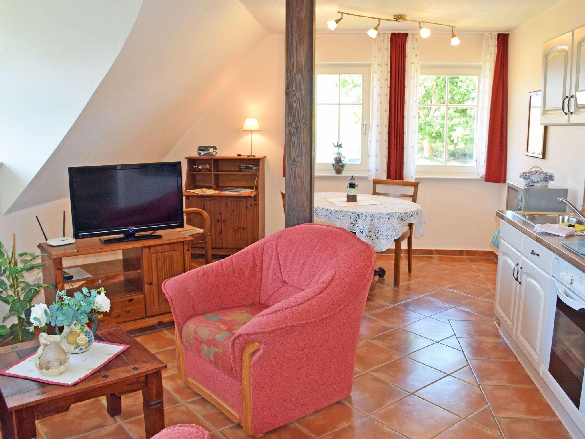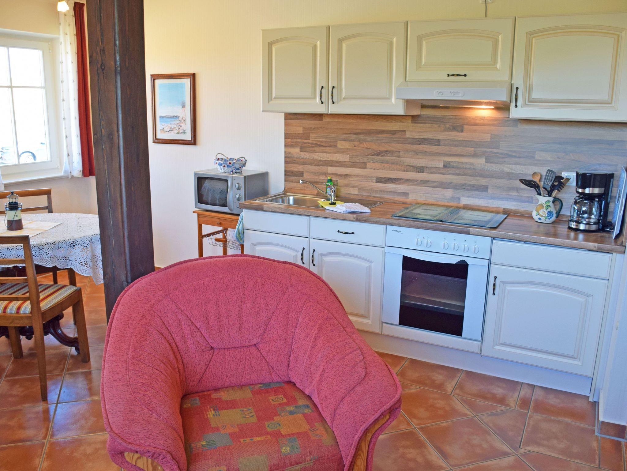 Diese großzügige und sehr liebevoll eingerichtete Maisonette Appartement verfügt über ein Wohnzimmer mit Küche und ein Schlafzimmer sowie Bad/WC und Flur. Es befindet sich im Obergeschoss des Landhus, das Schlafzimmer ist über eine Treppe bequem zu erreichen. Sehr schön sind hier die großen Gaubenfenster. Im Schlafzimmer steht ein Doppelbett. Im Wohnraum gibt es eine Couch mit Sitzgelegenheiten. Das Bad ist mit Dusche und Badewanne ausgestattet. Die komplette Einbauküche mit 4-Platten-Ceranherd, Backofen, Mikrowelle, Kaffeemaschine, Toaster, Wasser- und Eierkocher, Kühlschrank usw. lässt keine Wünsche offen. In diesem Appartement ist das Mitbringen von Kleintieren nicht möglich!