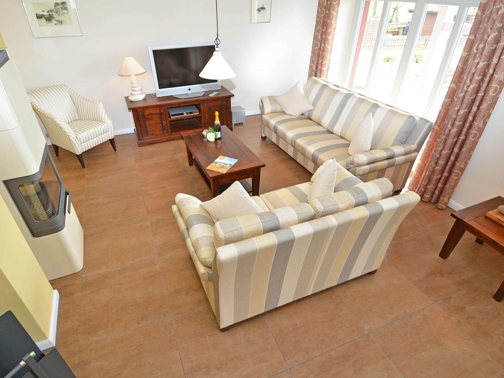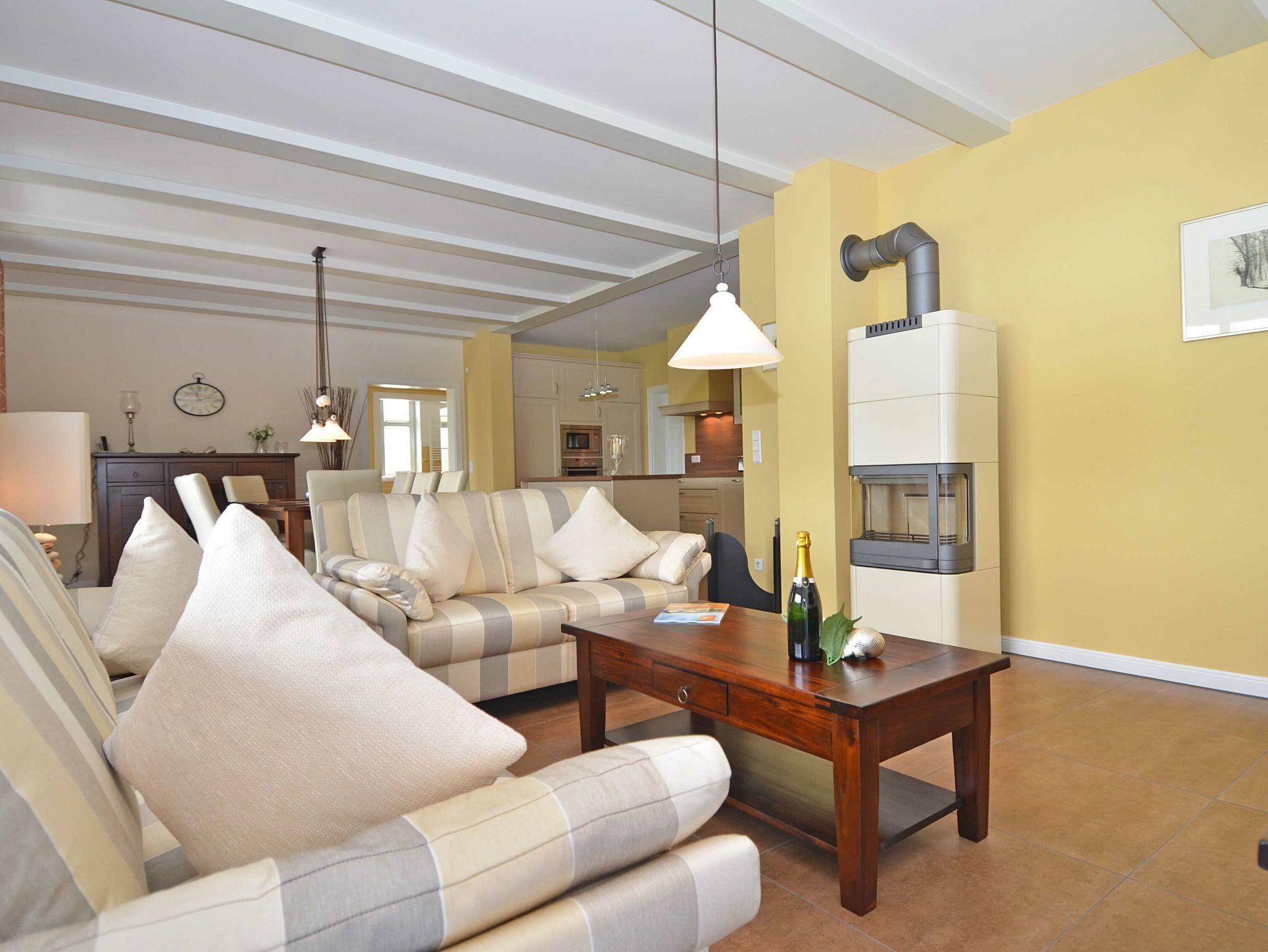In der Wohnung gibt es einen sehr geräumigen Flur, von welchem Sie in die wohnungseigene Sauna gelangen oder auch in den großen offenen, hellen Wohn-Küchen/Essbereich. Dieser ist sehr stilvoll mit Landhausmöbeln, gemütlichen Couches, einem LÖWE Flachbildfernseher und passender CD, DVD, Bluerayabspieltechnik ausgestattet. Der Sound der TV/Musikanlage wird auch Sie begeistern. Ein Internetanschluss per W-LAN und ein Festnetztelefon stehen ebenfalls zur Verfügung.
