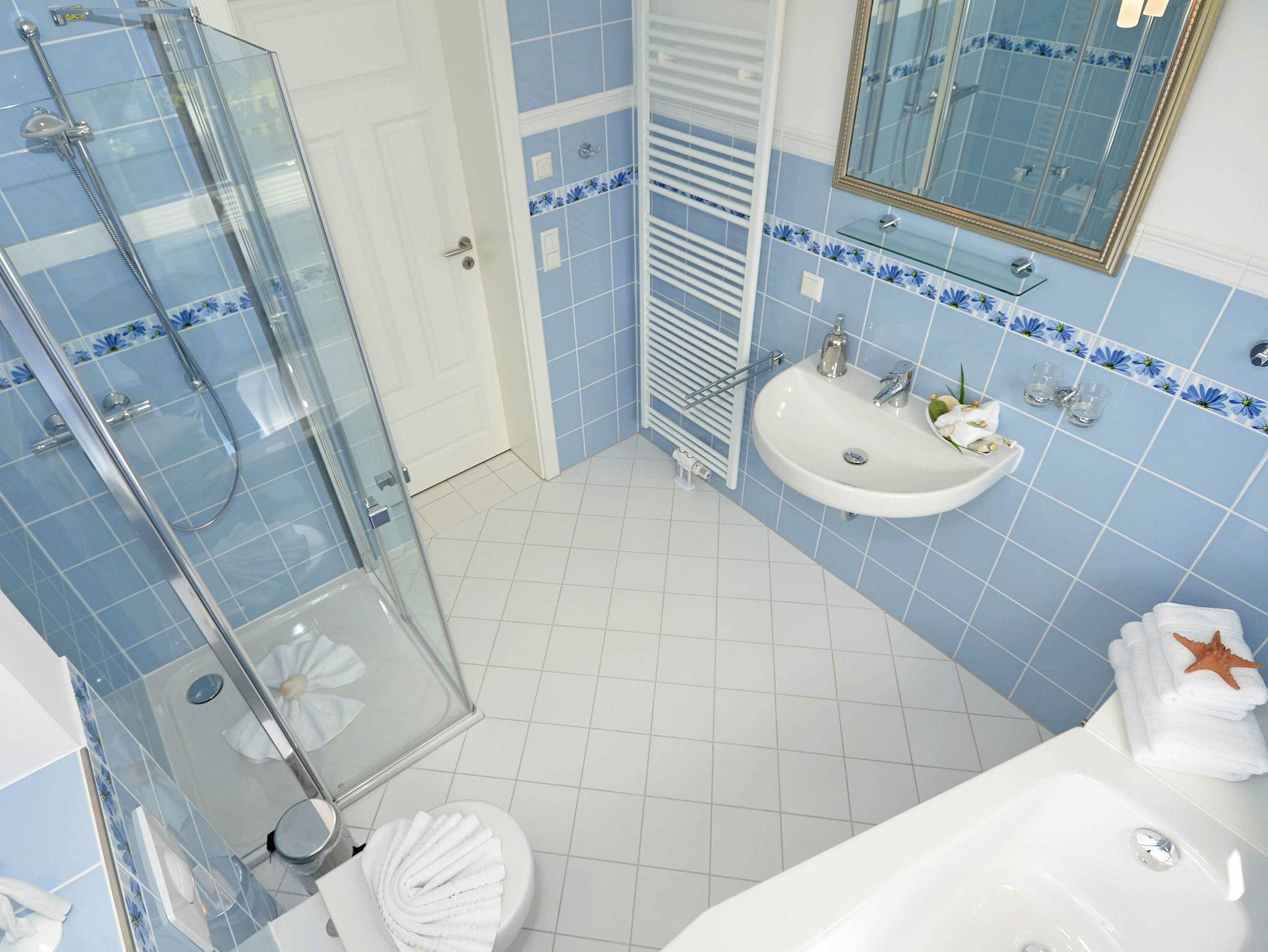 Die zwei lichtdurchfluteten Bäder sind mit Villeroy [&] Boch Fliesen gestaltet und moderner Sanitärkeramik ausgestattet mit jeweils einem großen Waschbecken, flacher Ganzglasdusche und WC. Das größere der beiden Bäder verfügt zusätzlich über eine Badewanne, das Kleinere über ein Bidet.