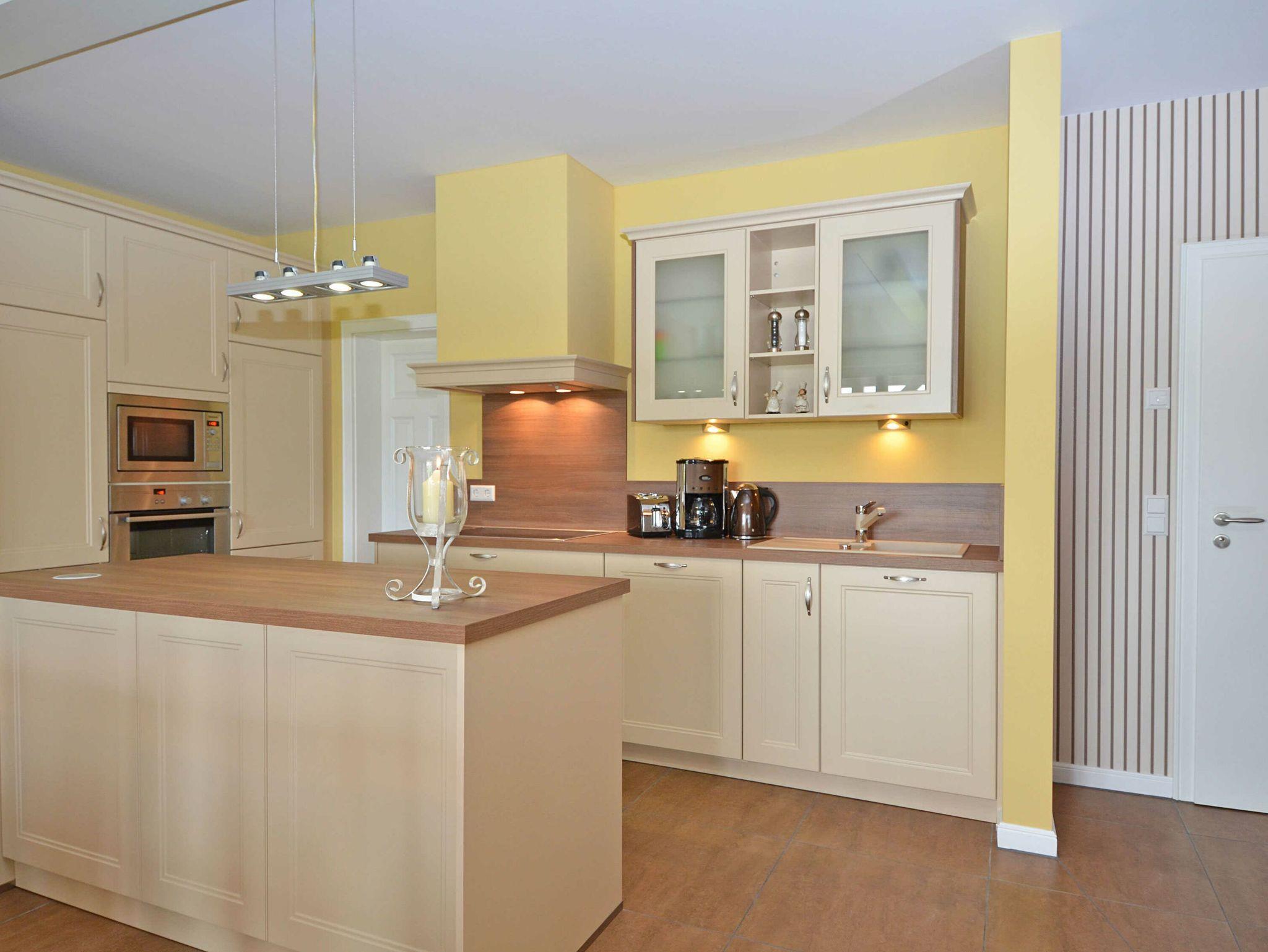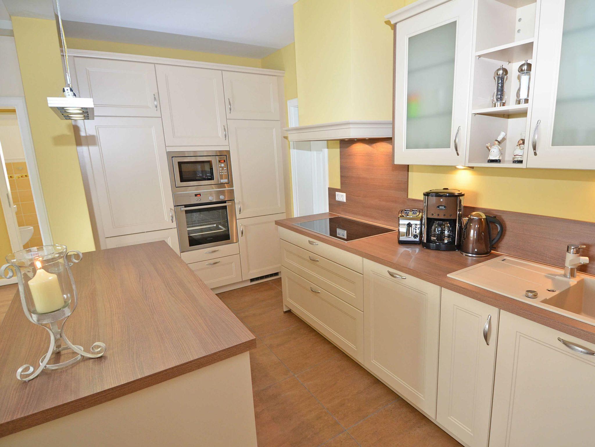 Die harmonisch im Wohnbereich integrierte, hochwertige Küche in modernster champagner-beige farbigen Optik verfügt über einen Kühlschrank mit Gefrierschrank, ein Cerankochfeld, einen Backofen, eine geräuscharme Spülmaschine, eine Mikrowelle, Kaffeemaschine, Wasserkocher, Toaster, Brot-und Wurstschneidermaschine und diverse Kleinutensilien, die die Küchenausstattung komplettieren. Die große Speisekammer bietet Ihnen ausreichend Stauraum für die Urlaubsverpflegung.