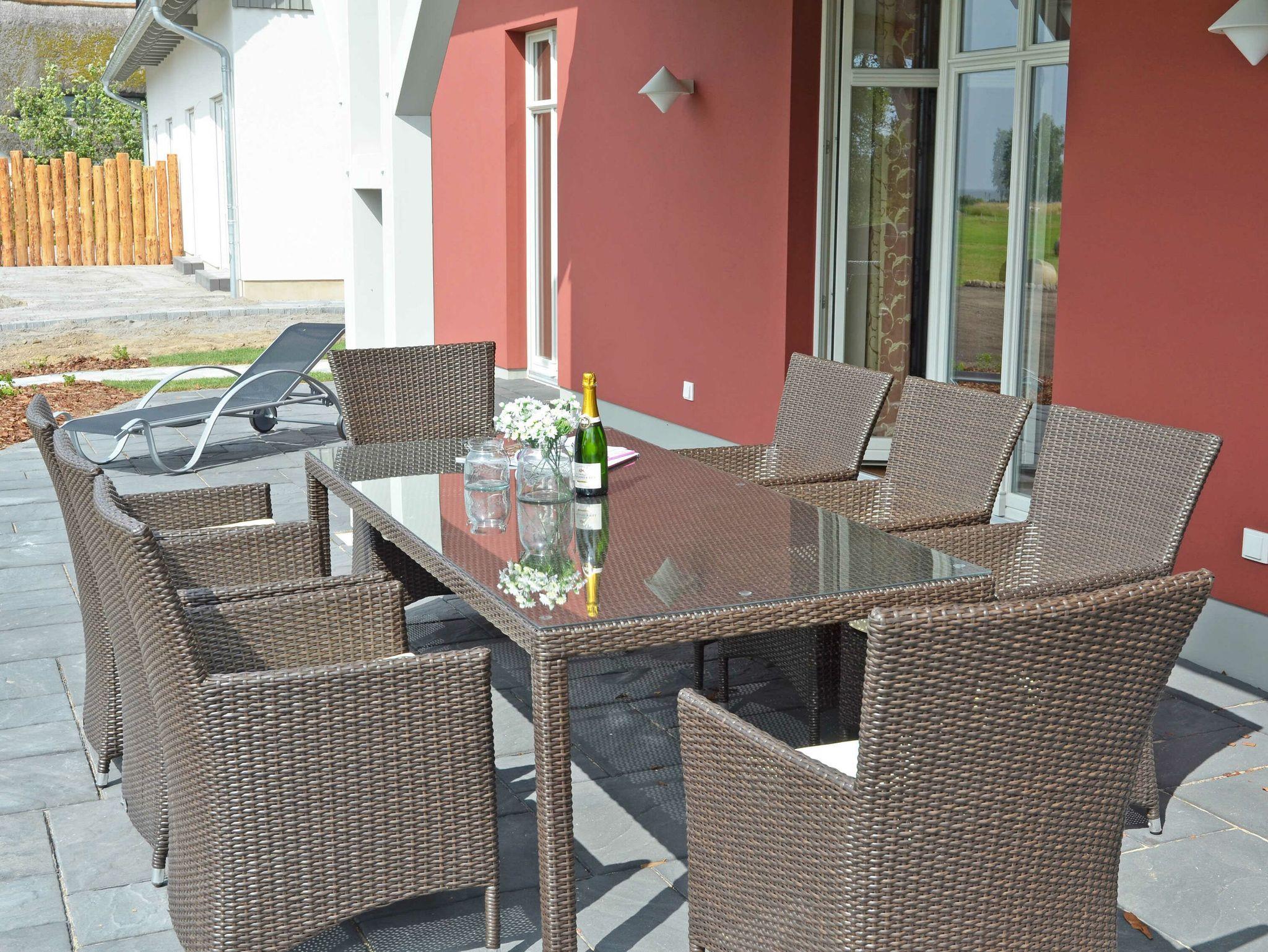 Die möblierte und teilweise überdachte Terrasse zur Süd-Westseite lädt zu entspannten Stunden ein.