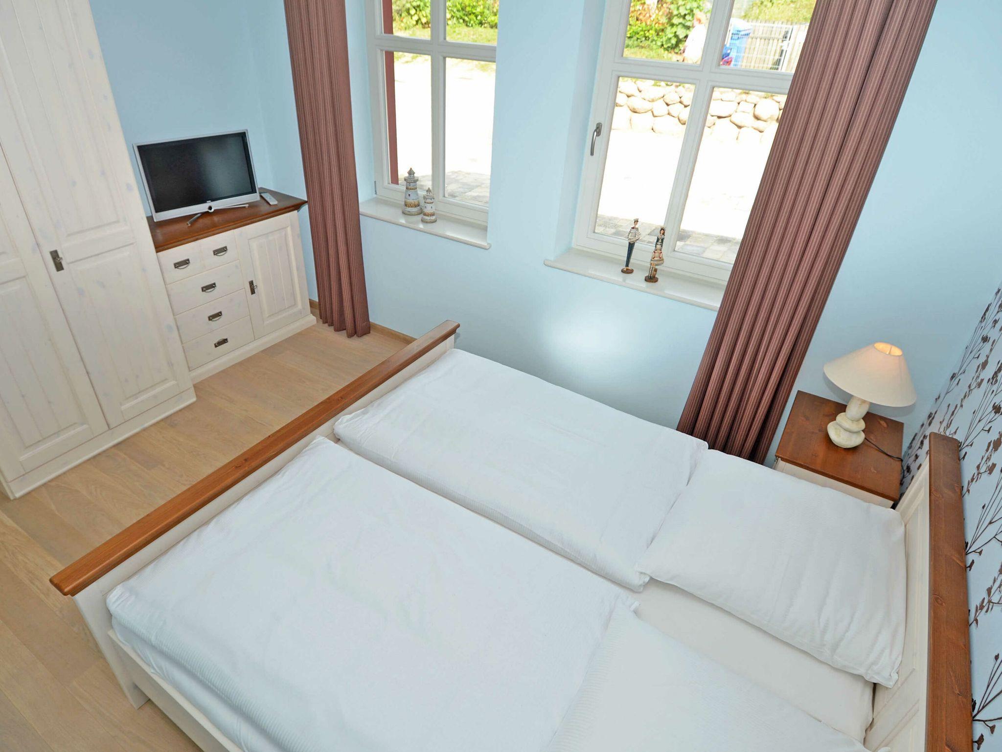 In der Wohnung gibt es insgesamt vier Schlafzimmer. Drei der Schlafzimmer sind mit je einem Doppelbett eingerichtetm, das Vierte mit einem Einzelbett, alle mit ausreichend Stauraum für Ihre Garderobe, sowie Parkett in Landhausoptik. Zwei der vier Schlafzimmer verfügen jeweils über einen weiteren Flachbild-TV von LÖWE. Die beiden rechtsseitig gelegenen Schlafzimmer verfügen über eine Türdurchgangsbreite von ca. 95 cm und sind somit für die Durchfahrt eines Rollstuhles geeignet. Speziell das Einzelschlafzimmer zur Gartenseite ist für einen Rollstuhlfahrer besonders gut nutzbar. Das nebenan liegende Bad hat ebenfalls eine vergrößerte Türöffnung und eine flache Duschtasse.