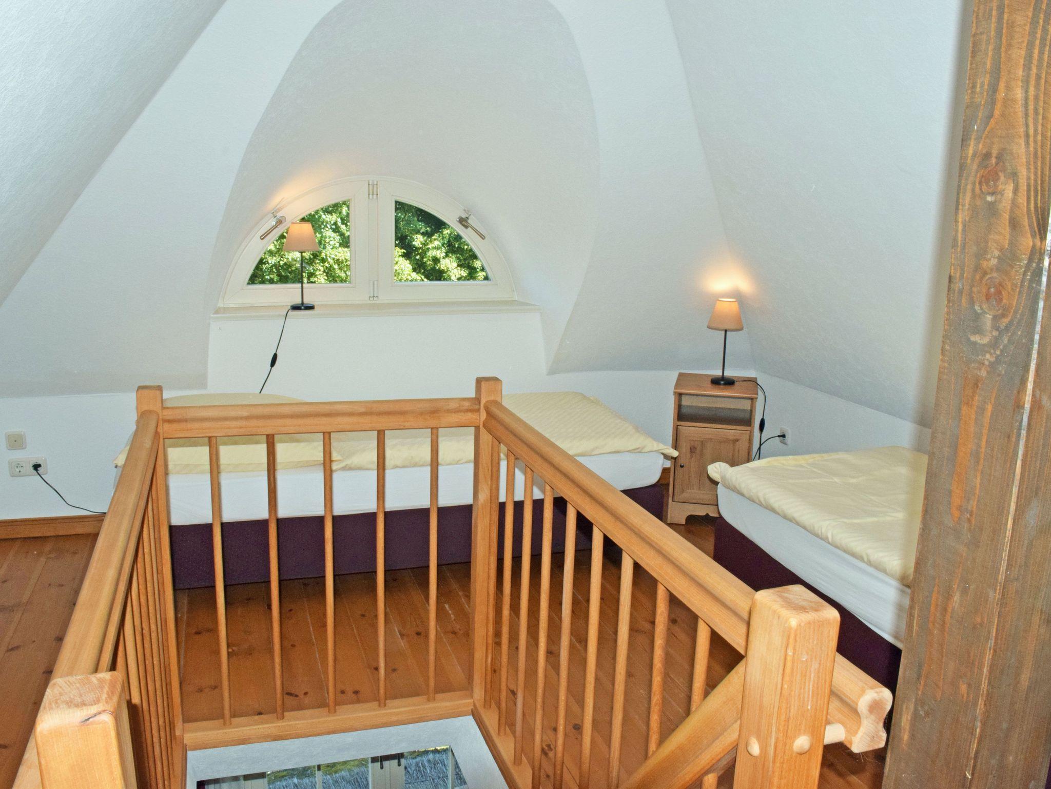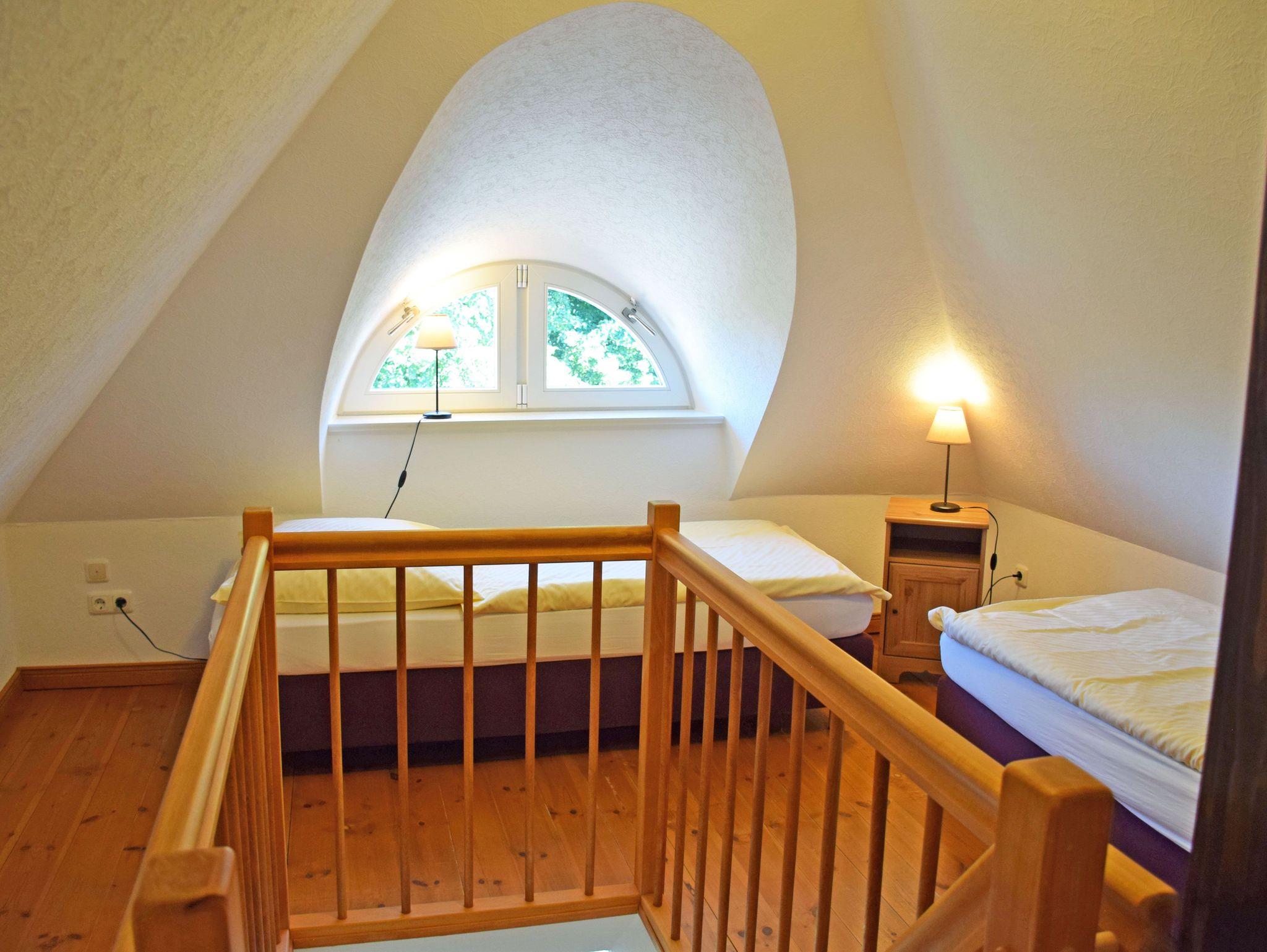 Dieses sehr liebevoll eingerichtete Maisonette Appartement verfügt über ein Wohnzimmer mit Küche und ein Schlafzimmer sowie Bad/WC und Flur. Die Wohnung liegt im Obergeschoss des Landhus, das Schlafzimmer ist über eine Treppe bequem zu erreichen. Im Schlafzimmer stehen zwei Einzelbetten. Im Wohnraum gibt es eine Sitzgruppe. Das Bad ist mit einer Dusche ausgestattet. Die komplette Einbauküche mit 4-Platten-Ceranherd, Backofen, Mikrowelle, Kaffeemaschine, Toaster, Wasser- und Eierkocher, Kühlschrank usw. lässt keine Wünsche offen.