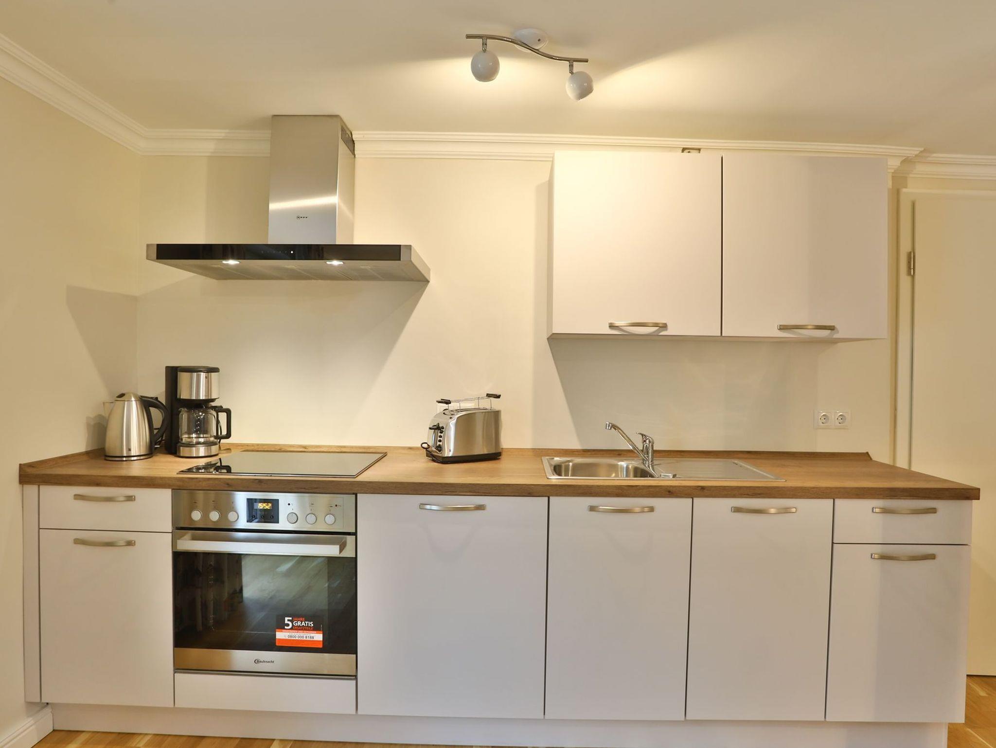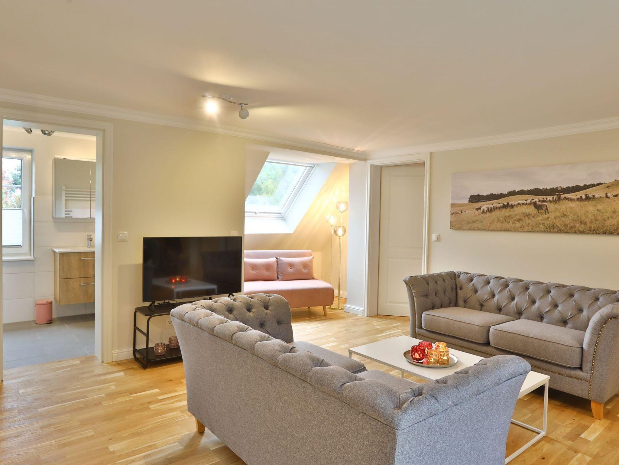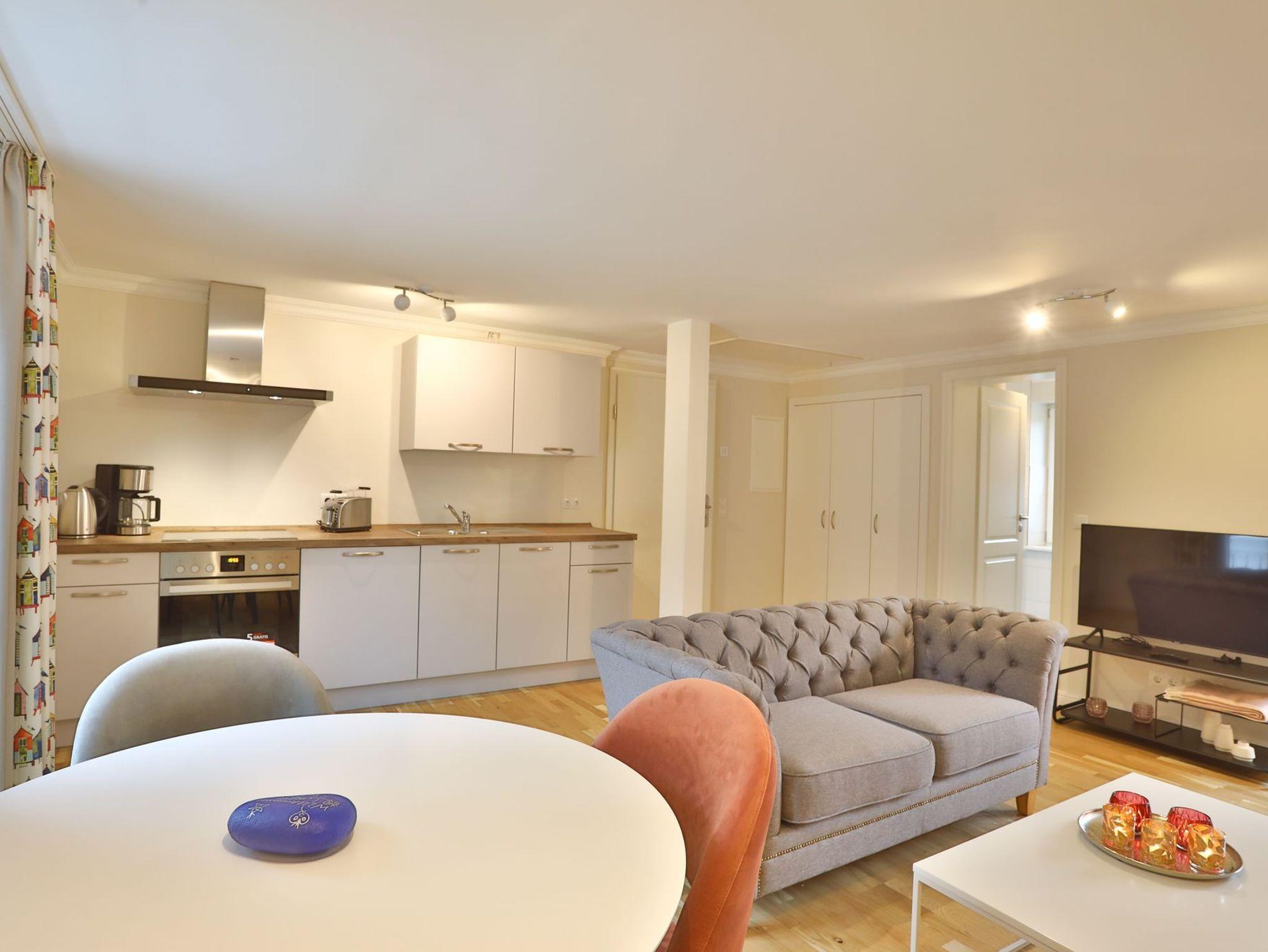 Die Wohnung Schafberg verfügt über einen gemütlichen, modernen Wohn- und Essbereich mit Flatscreen TV, ein Schlafzimmer und ein Badezimmer mit Dusche. In der vollausgestatteten Küchenzeile mit Induktionskochfeld und Geschirrspüler befindet sich zusätzlich zum Wasserkocher und der Filterkaffeemaschine eine Nespressokapselmaschine. Vom gemütlichen Wohn- oder Schlafzimmer aus gelangen Sie auf einen großzügigen, südausgerichteten Balkon mit Blick Richtung Reethus Rotbuche und seitlichem Wiesenblick.