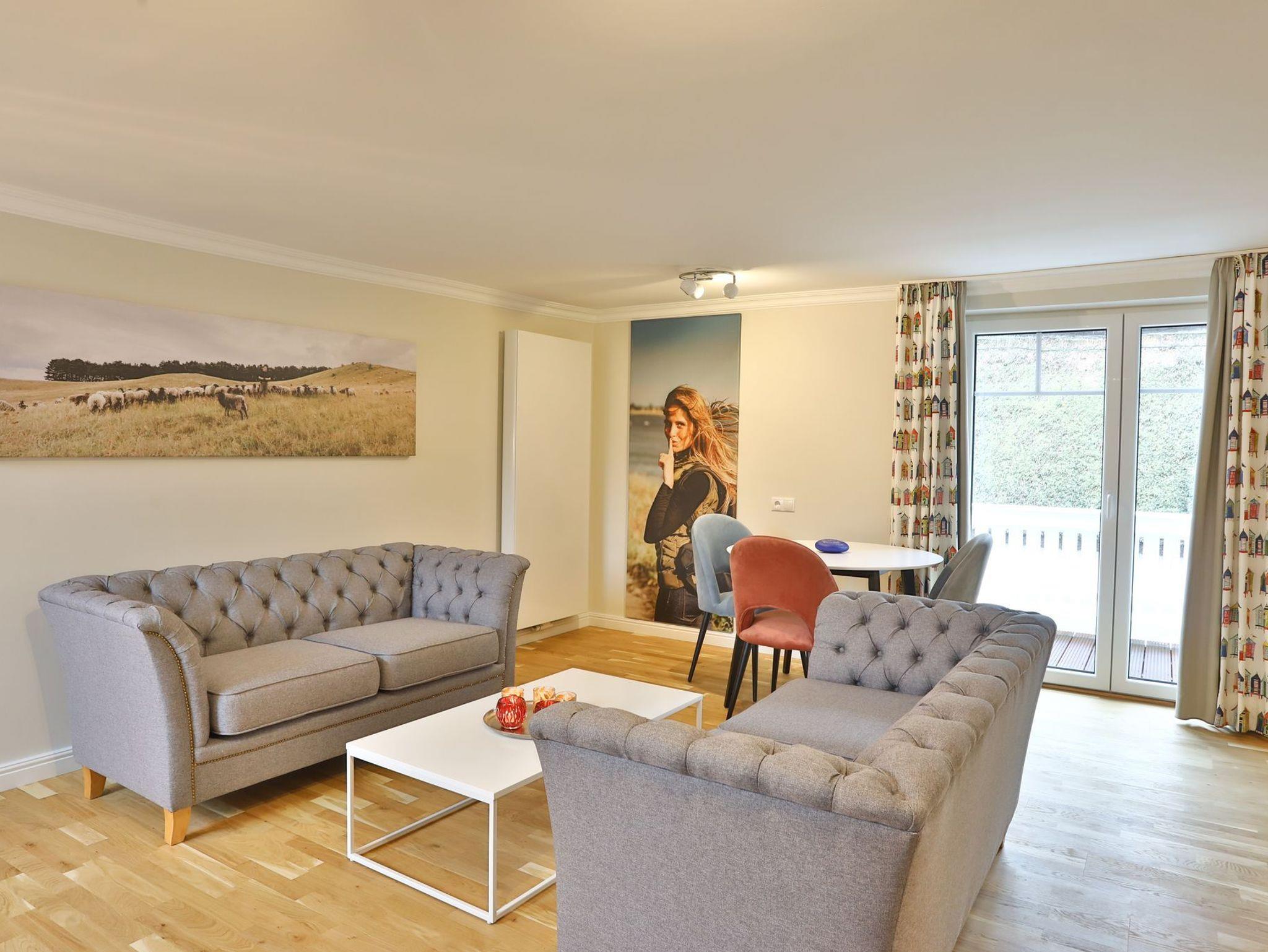 Die Wohnung Schafberg verfügt über einen gemütlichen, modernen Wohn- und Essbereich, ein Schlafzimmer und ein Badezimmer. Vom Wohn- oder Schlafzimmer aus gelangen Sie auf einen großzügigen, südausgerichteten Balkon mit Blick Richtung Reethus Rotbuche und seitlichem Wiesenblick.