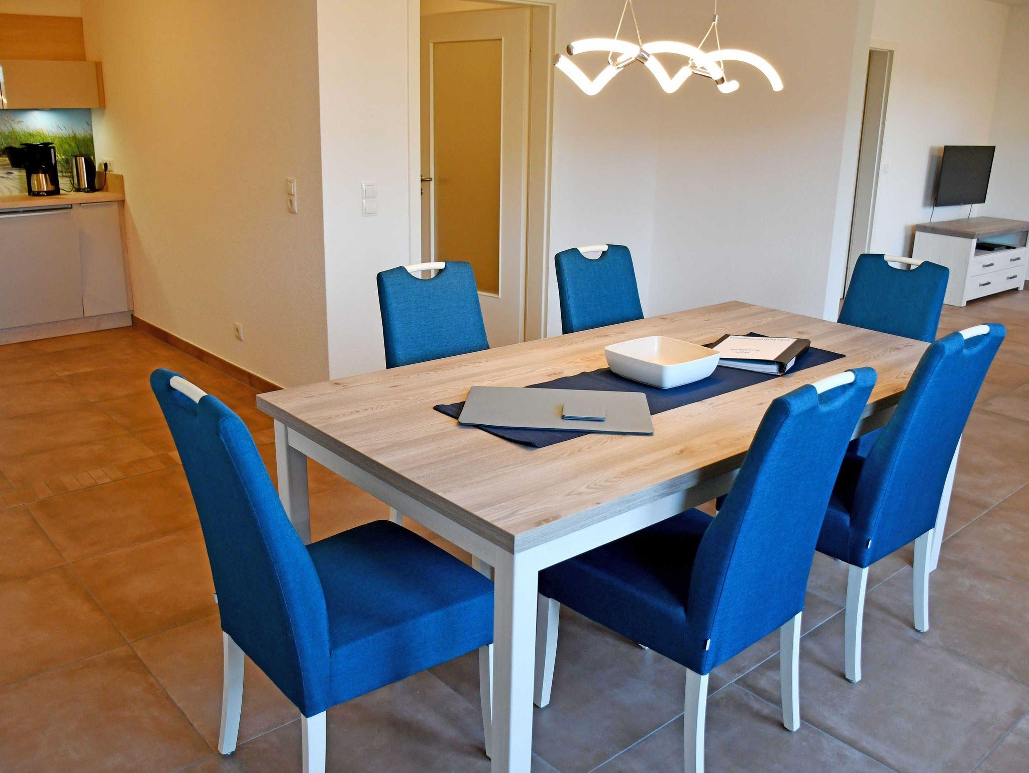Im kombinierten Wohn- und Esszimmer wartet die gemütliche Sofalandschaft mit Couchtisch und ein modernes Flachbild-TV-Gerät auf Sie zum Relaxen. Hier steht auch ein großer Esstisch mit sechs Stühlen. Kochfreunde werden in der neuen, hellen und modernen offenen Küche mit hochwertigen Markengeräten wie Backofen, Cerankochfeld mit Abzugshaube, Mikrowelle, Kühlschrank mit Gefrierfach und Geschirrspüler voll auf Ihre Kosten kommen.