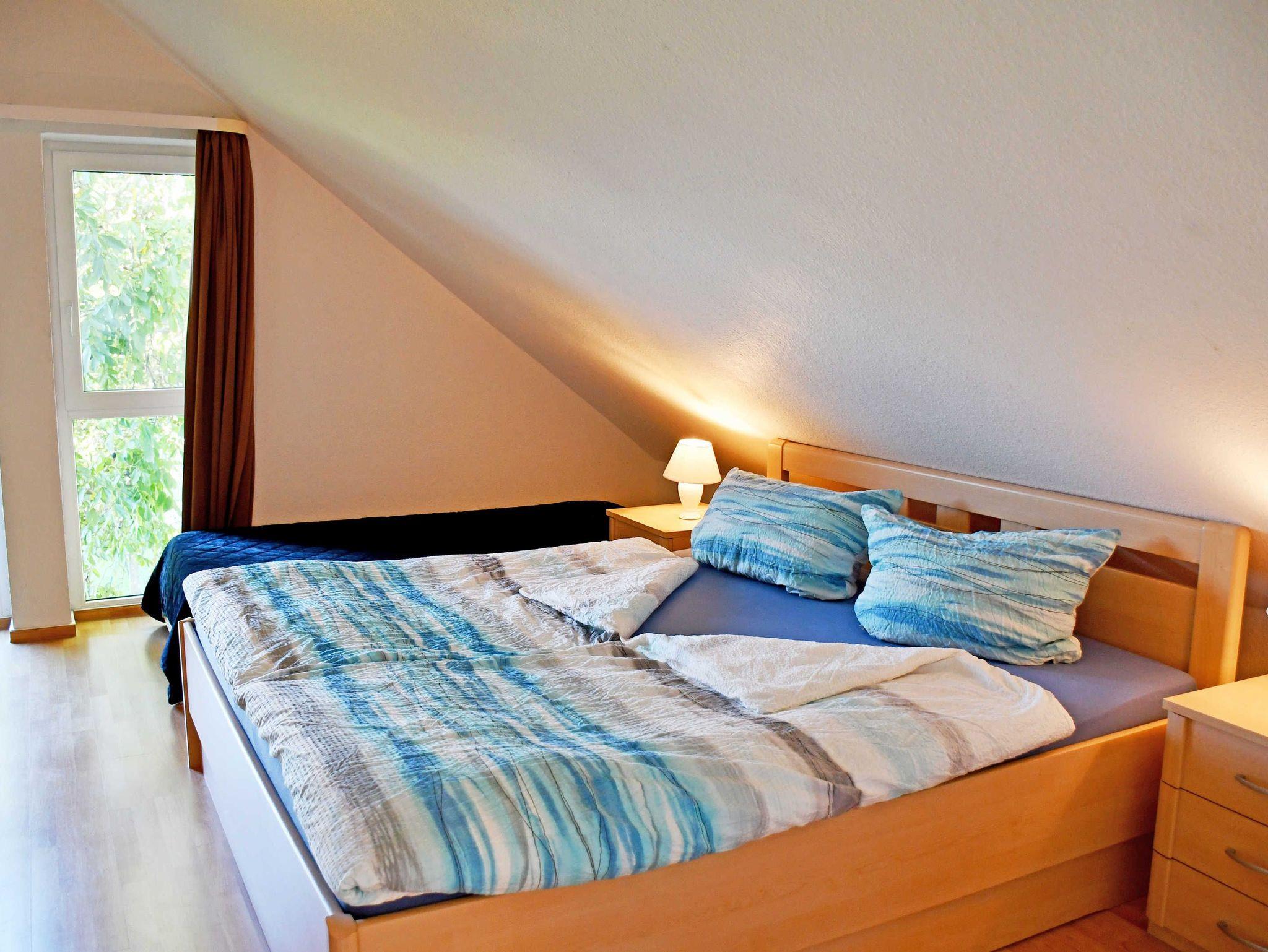 Die Komfortable Ferienwohnung verfügt über 1 separates Schlafzimmer mit Doppelbett (.cm x .cm), Einzelbett (.cm x .cm), Nachttischen mit Beleuchtung sowie einem großzügigen Kleiderschrank. Die Bodentiefen Fenster sind mit Vorhängen verdunkelbar. Bei Ihrer Anreise liegen frische Handtücher bereit und die Betten sind bereits mit Bettwäsche bezogen.