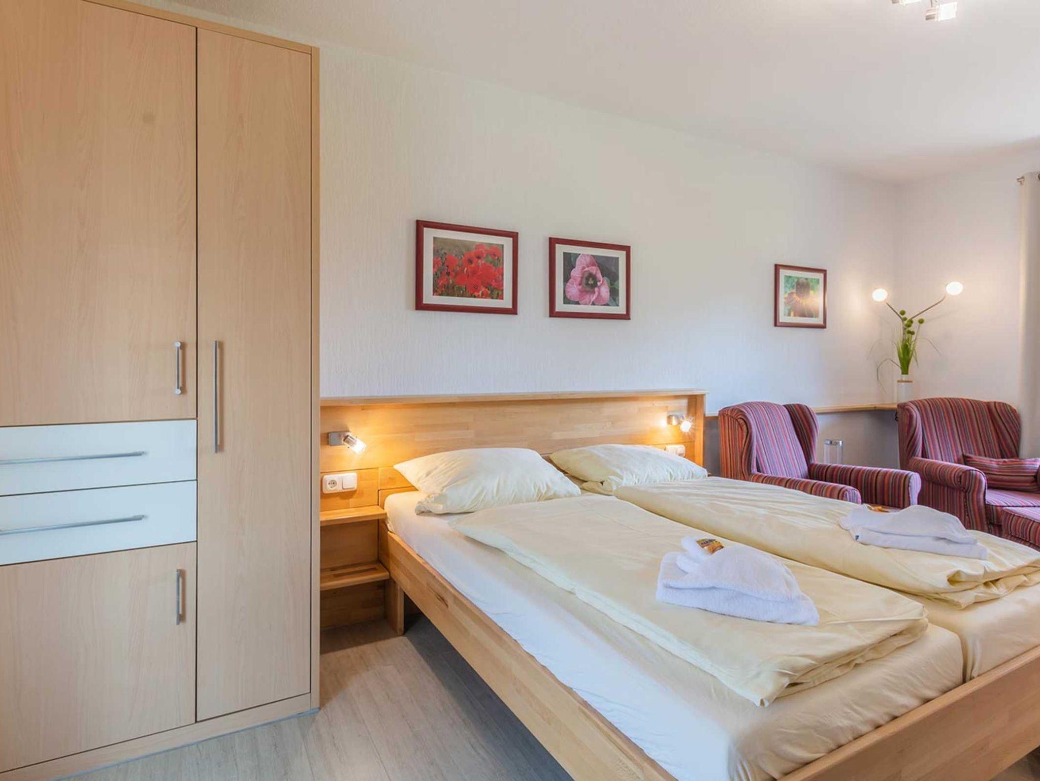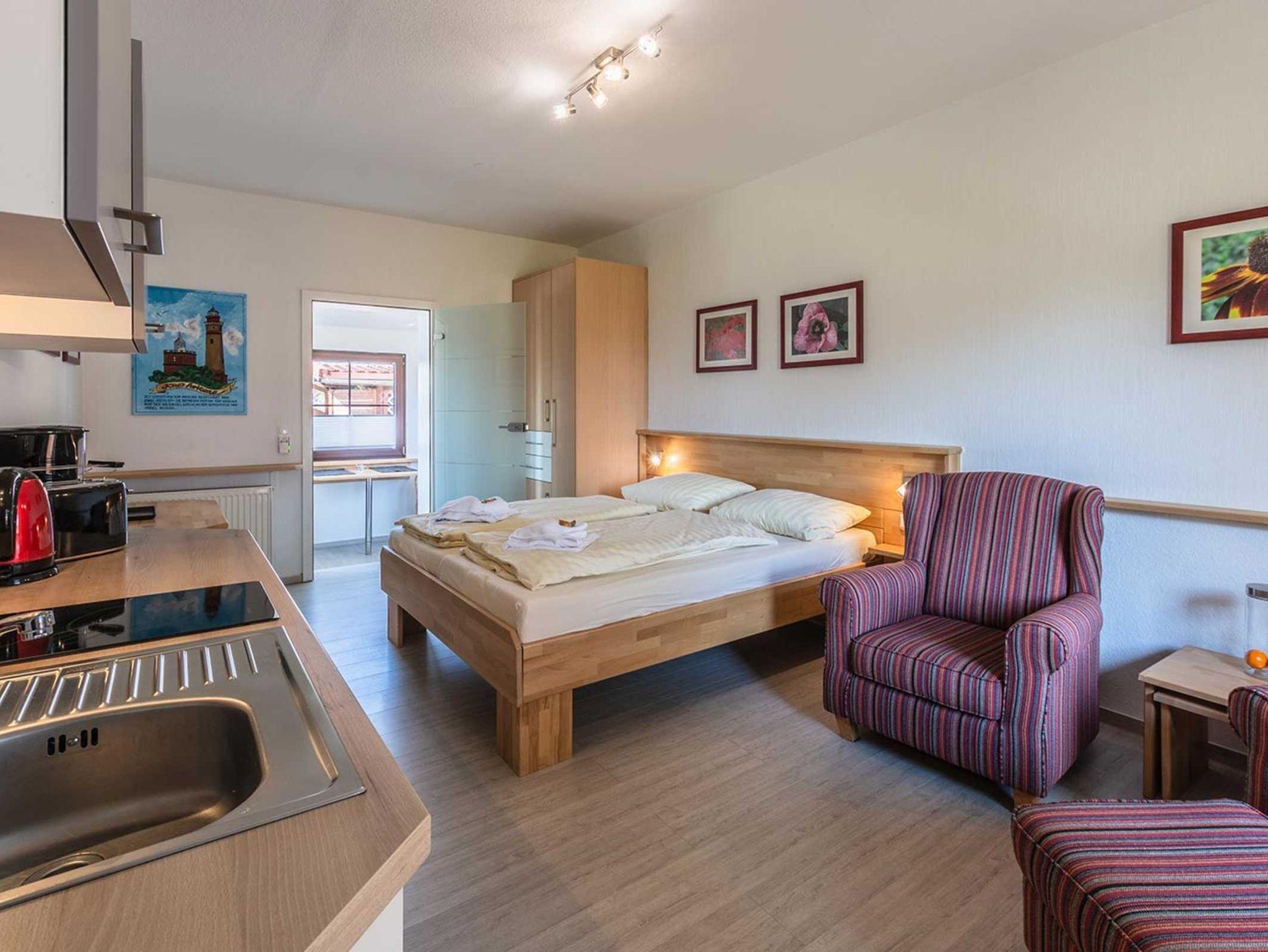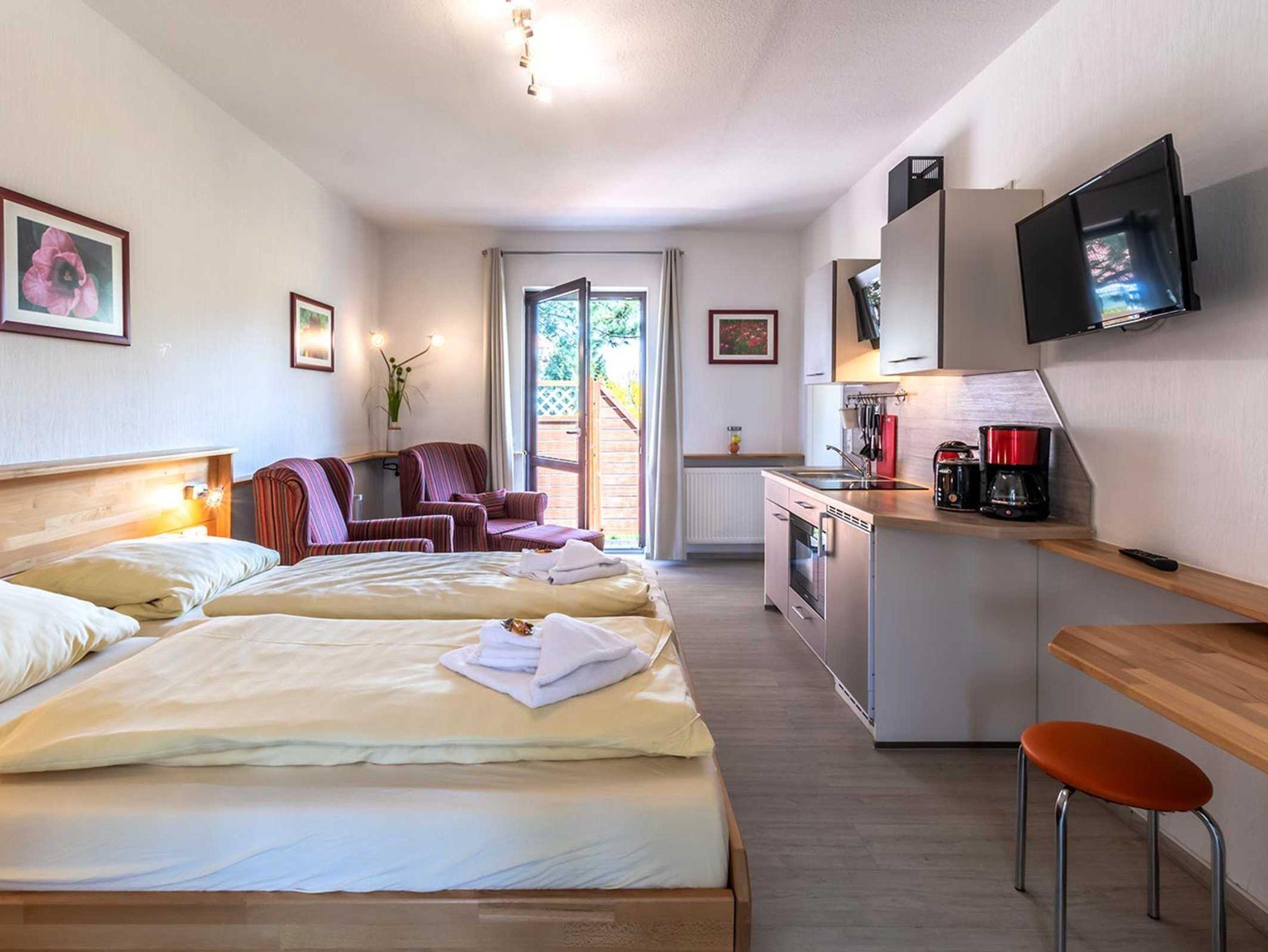 Diese schön eingerichtete 1-Raum Ferienwohnung (Nichtraucher) für bis zu 2 Personen ist ca. 29 m² groß und befindet sich in der linken Haushälfte im Erdgeschoss. Sie wurde komplett neu renoviert und ist hochwertig eingerichtet.