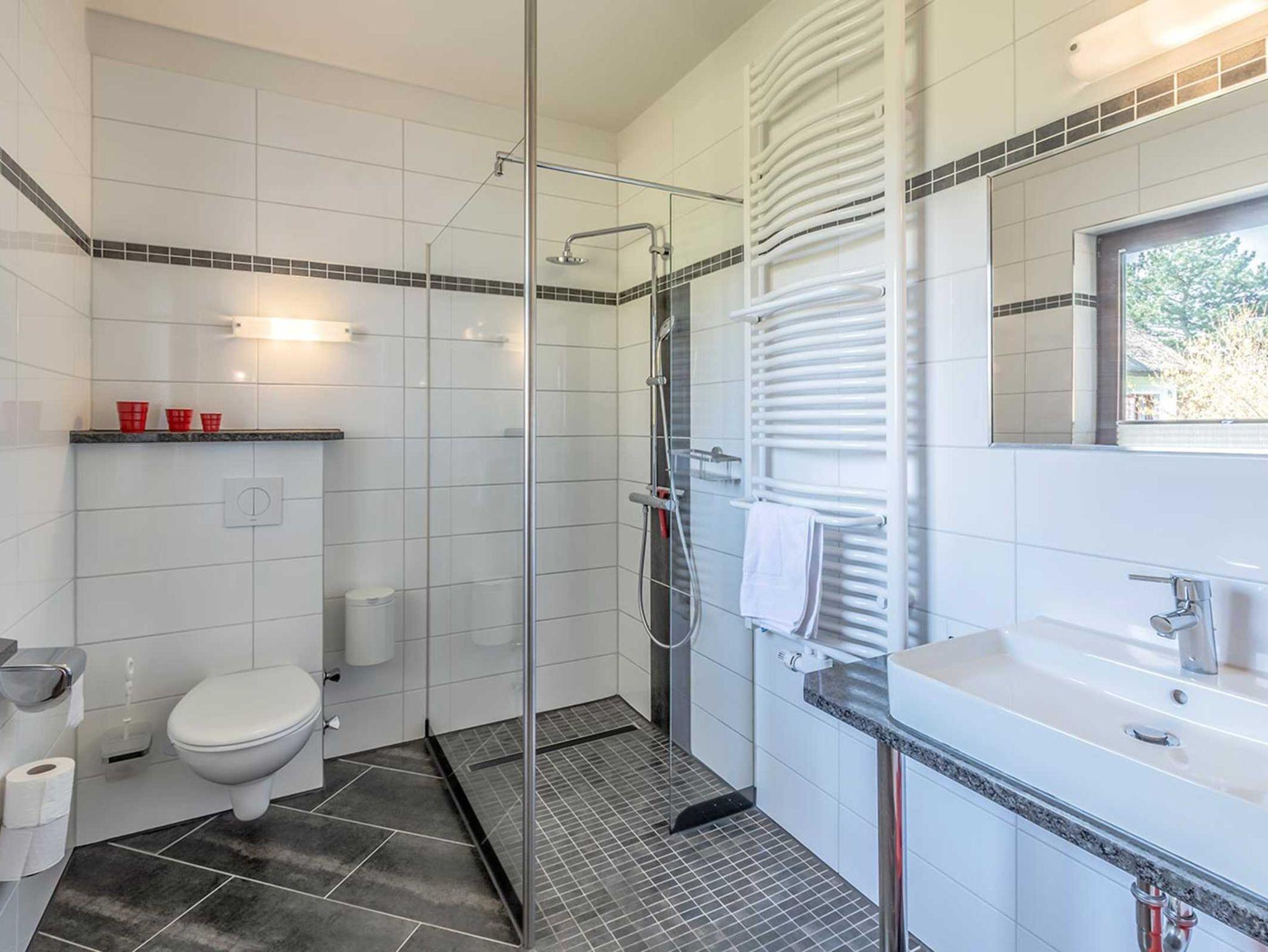 Das Badezimmer (mit Fenster) verfügt über eine Dusche, Waschtisch, WC, Handtuchtrockner und einen Fön.