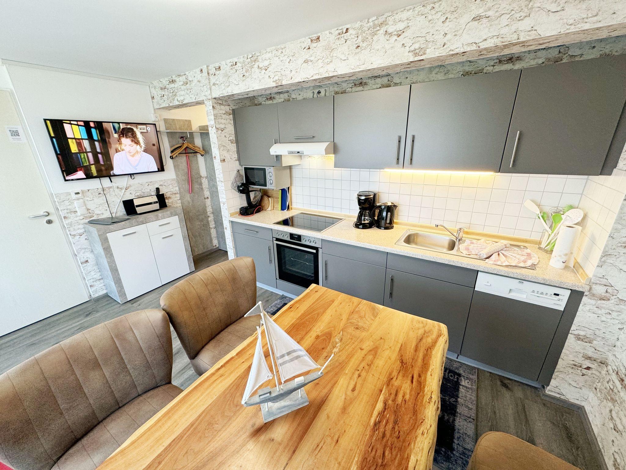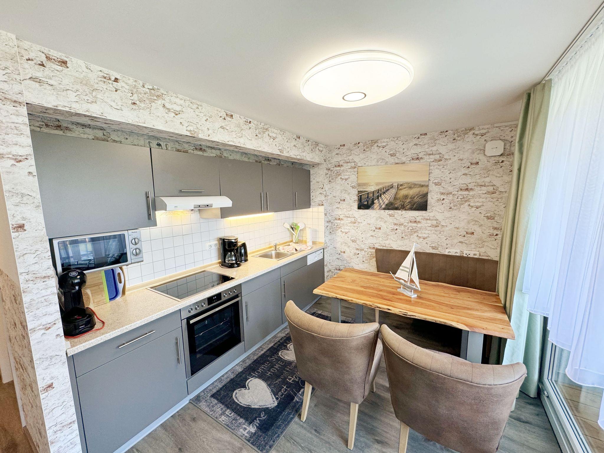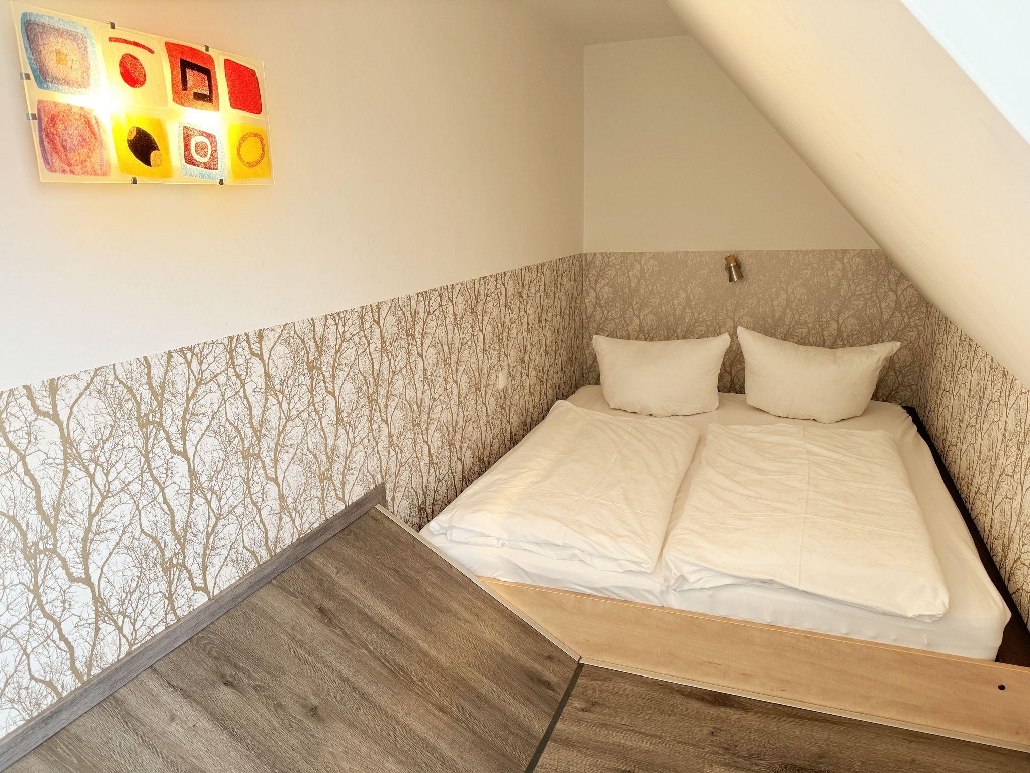 Die gut geschnittene Nichtraucherwohnung Nr.06 befindet sich im Obergeschoß des Hauses. Mit Ihren ca. 50 m² Wohnfläche mit Balkon und direktem Blick über die großzügige hauseigene Freifläche auf den Bodden, bietet sie ausreichend Platz für max. 2 bis 4 Erwachsene + 1 Kleinkind bis 3 Jahre im Kinderreisebett. Die Wohnung wurde komplett renoviert und mit einem hochwertigen PVC freiem Vinyl verlegt. Die offene und vollausgestattete Küchenzeile mit einem 4 Zonencerankochfeld, Geschirrspüler, Backofen, Kühlschrank mit Gefrierfach, Mikrowelle, Toaster, Wasserkocher, Kaffeemaschine, Dolce Gusto Maschine sowie kleinen Küchenhelfern wird mit einem gemütlichen Essplatz komplettiert. Vom Küchenbereich gelangen Sie auf den überdachten und bestuhlten Balkon (Süd/Ost). Bei schönem Wetter können Sie auch hier Ihre Mahlzeiten, mit einem wundervollen Natur- und Boddenblick genießen. Im ersten Schlafzimmer erwartet Sie ein großes Doppelbett mit Einzelmatratzen (1,80m x 2,00m), Nachttischablagen mit Leselampen, Smart-TV, einen geräumigen Kleiderschrank und Safe für Ihre Wertsachen und ein Sideboard für Ihre Wäsche sowie Ablage. Für einen erholsamen Schlaf sorgen Verdunklungsgardinen und Insektenschutzgitter. Das zweite Schlafzimmer verfügt ebenfalls über ein Doppelbett mit Einzelmatratzen (1,80m x 2,00 m), Leselampe und 17 Zoll LED-TV. Eine Hifi Microanlage mit CD-Player, MP3, UKW-Funktion, USB und Bluetooth mit NFC, ein DAB-Radio sowie ein inklusiver WLAN-Anschluss runden den technischen Bereich ab. Das große Tageslicht-Bad ist mit einem WC, einer ebenerdigen Dusche, einem Waschtisch, Fön, Kosmetikspiegel, einem großen Wandspiegel, Handtuchheizkörper und einem Ablageregal ausgestattet. Ein Haustier ist gegen eine Gebühr ein gern gesehener Gast. Da Haustiere erfahrungsgemäß Ihre eigenen Sachen lieben, bringen Sie hier bitte Schlafkörbchen, Wasser- und Fressnapf mit. Sollte Ihnen doch einmal Strandsand ins Haus geraten oder etwas runterfallen, ist jede Wohnung mit einem Staubsauger und anderen Reinigungsgeräten ausgestattet. Für Ihre Fahrräder finden Sie am Giebel des Hauses (unter Whg 5) einen Fahrradständer zum Anschließen. Die Grünfläche des Hauses lädt zu geselligen Abenden mit weiteren Hausgästen ein. Ein Standgrill steht für unsere Gäste im Gartenhaus zur Verfügung. Bitte beachten Sie jedoch, dass das Grillen auf den Holzterrassen aus brandschutztechnischen Gründen nicht erlaubt ist. Hier finden Sie aber ausreichend Platz auf dem Außengelände, welches auch über einen kleinen Kinderspielplatz, Sandkiste und einer Tischtennisplatte verfügt. Ein PKW-Stellplatz (Nr.06) steht Ihnen inklusive am Haus zur Verfügung. Die Erstausstattung eines Wäschepaketes (komplette Bettwäsche, 1 Duschhandtuch, 1 kleines Handtuch, 1 Duschvorleger) können Sie bis 14 Tage vor Anreise gegen einen Aufpreis dazu buchen oder durch eigene ergänzen.1 Geschirrhandtuch gehört zu jedem Aufenthalt dazu.