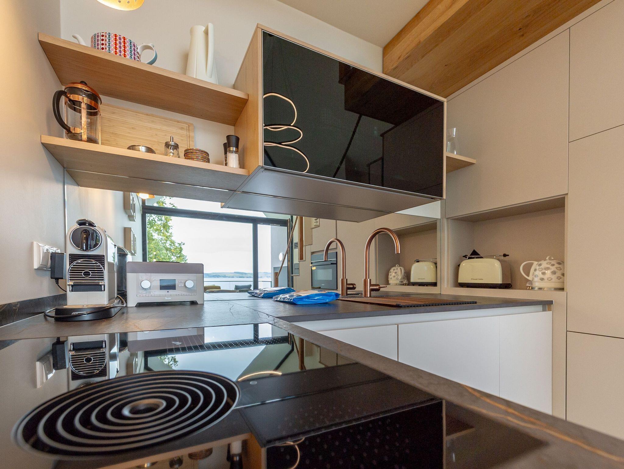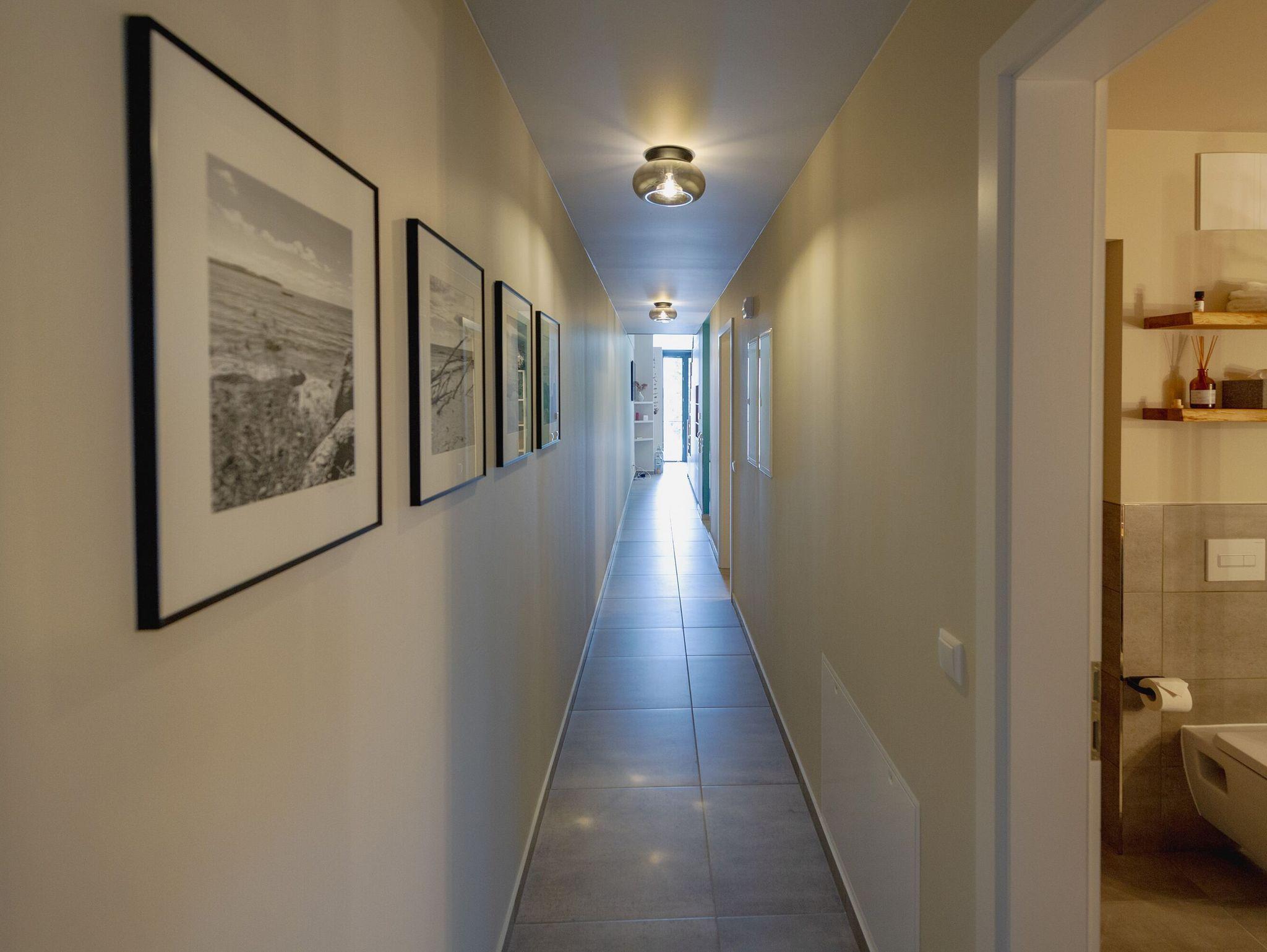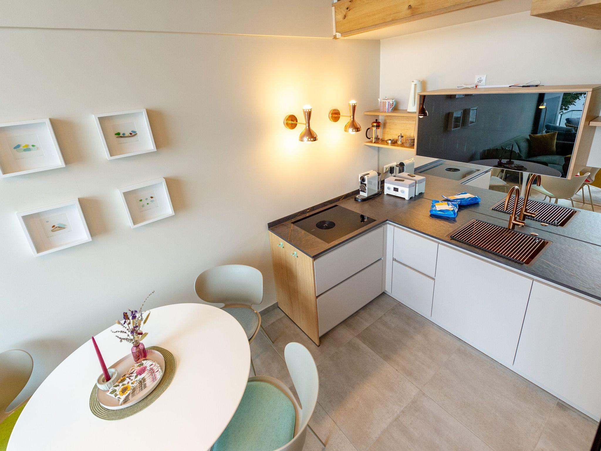 Ihr Zuhause auf Zeit besteht aus einem kombinierten Wohn-/Esszimmer mit integrierter Küche, einem Schlafzimmer mit einem 1,80m breiten Boxspringbett, einer offenen, abdunkelbaren Galerie mit ausklappbarem 1,60m breitem Boxspring-Schlafsofa und Schreibtisch, sowie einem Badezimmer mit Dusche/WC und Sauna, einem separaten Schrankzimmer und einer Terrasse mit Lounge-Möbeln. Sie erreichen die Wohnung im Obergeschoss des Hauses über ein paar Stufen direkt von der Straße aus. Die moderne Einbauküche ist mit allem ausgestattet, damit Sie sich bequem selbst bekochen können, Wellenrauschen inklusive.