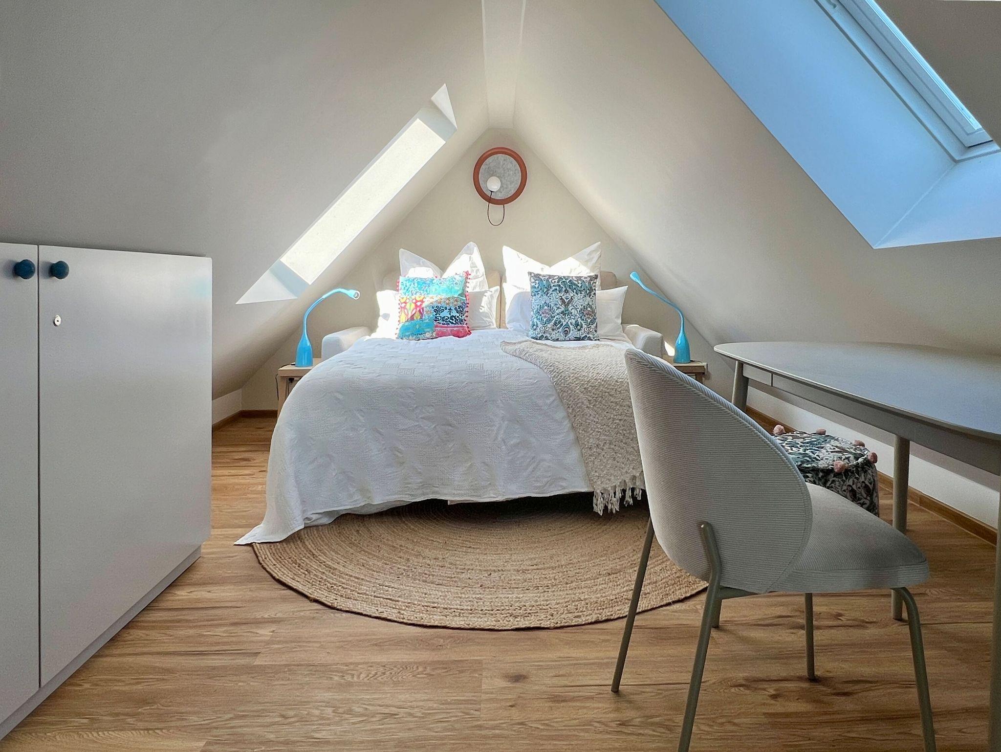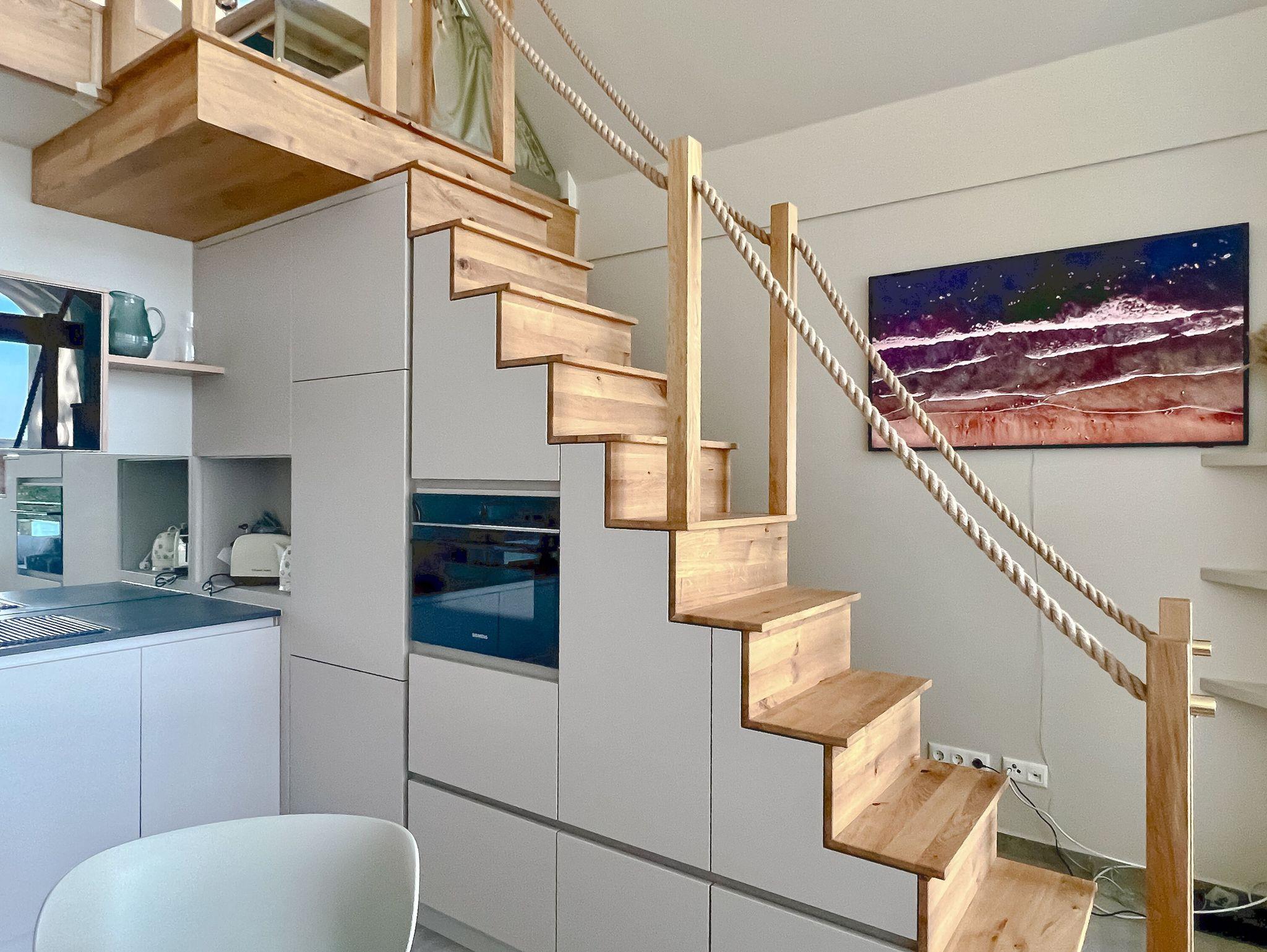 *ACHTUNG: Die Treppe zur Galerie entspricht nicht den DIN-Normen und ist nicht kindgerecht! Deshalb wird die Wohnung ausschließlich an Erwachsene bzw. Gäste mit Kindern ab 12 Jahren und unter Ausschluss einer Haftung vermietet.