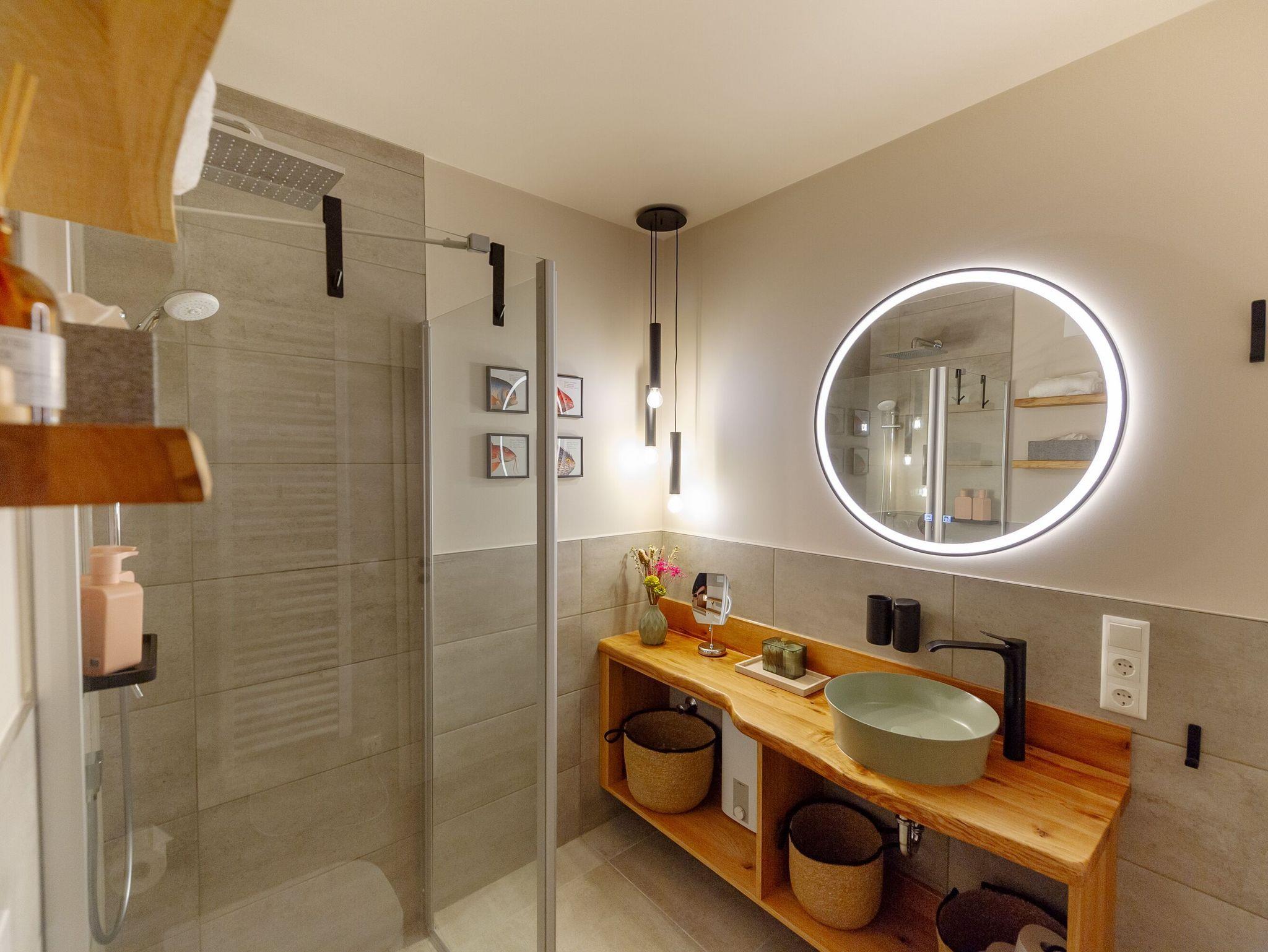 Ihr Zuhause auf Zeit besteht aus einem kombinierten Wohn-/Esszimmer mit integrierter Küche, einem Schlafzimmer mit einem 1,80m breiten Boxspringbett, einer offenen, abdunkelbaren Galerie mit ausklappbarem 1,60m breitem Boxspring-Schlafsofa und Schreibtisch, sowie einem Badezimmer mit Dusche/WC und Sauna, einem separaten Schrankzimmer und einer Terrasse mit Lounge-Möbeln. Sie erreichen die Wohnung im Obergeschoss des Hauses über ein paar Stufen direkt von der Straße aus. Die moderne Einbauküche ist mit allem ausgestattet, damit Sie sich bequem selbst „bekochen“ können, Wellenrauschen inklusive.