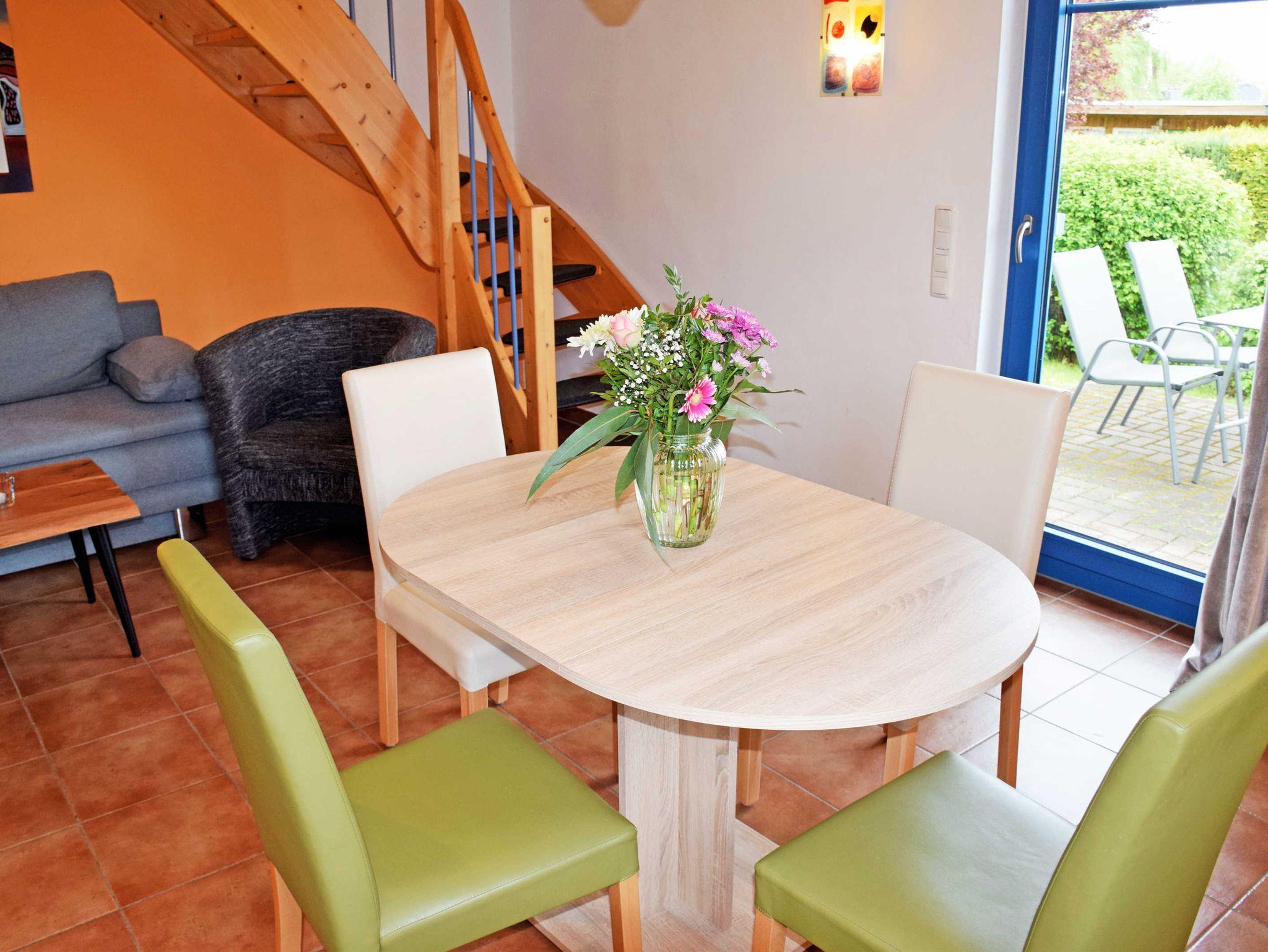 Im Erdgeschoss befinden sich ein Wohn- und Essbereich mit moderner Einbauküche, einem Esstisch mit Stühlen sowie einer Couchgarnitur, modern. Flachbild-TV und Radio. Die moderne Küchenzeile ist mit Herd, Backofen, Kaffeemaschine, Toaster, Wasserkocher und Kühlschrank komplett ausgestattet. Vom Wohnbereich aus gelangt man auf die Terrasse mit Gartenmöbeln und in den Gemeinschafts-garten.