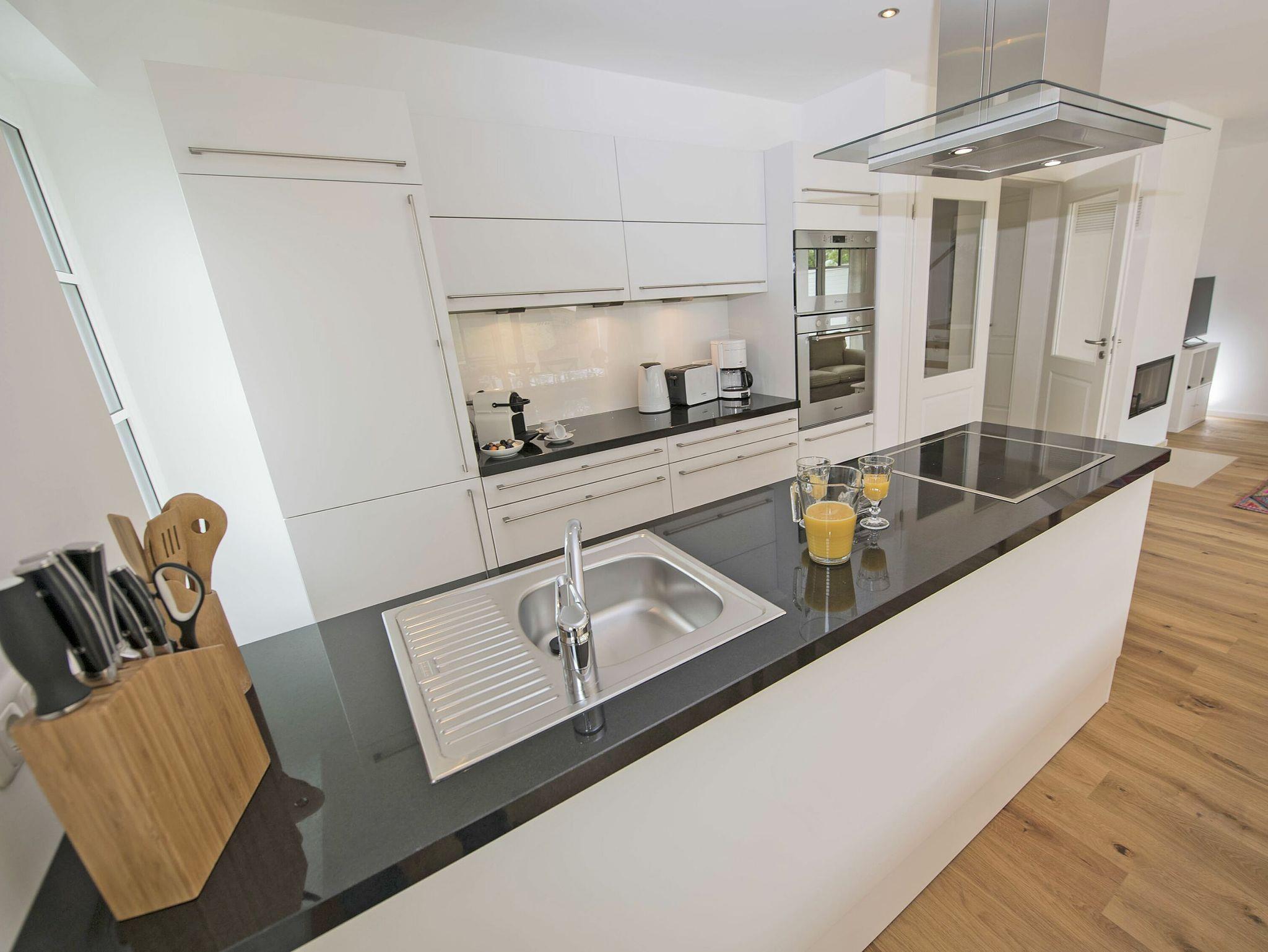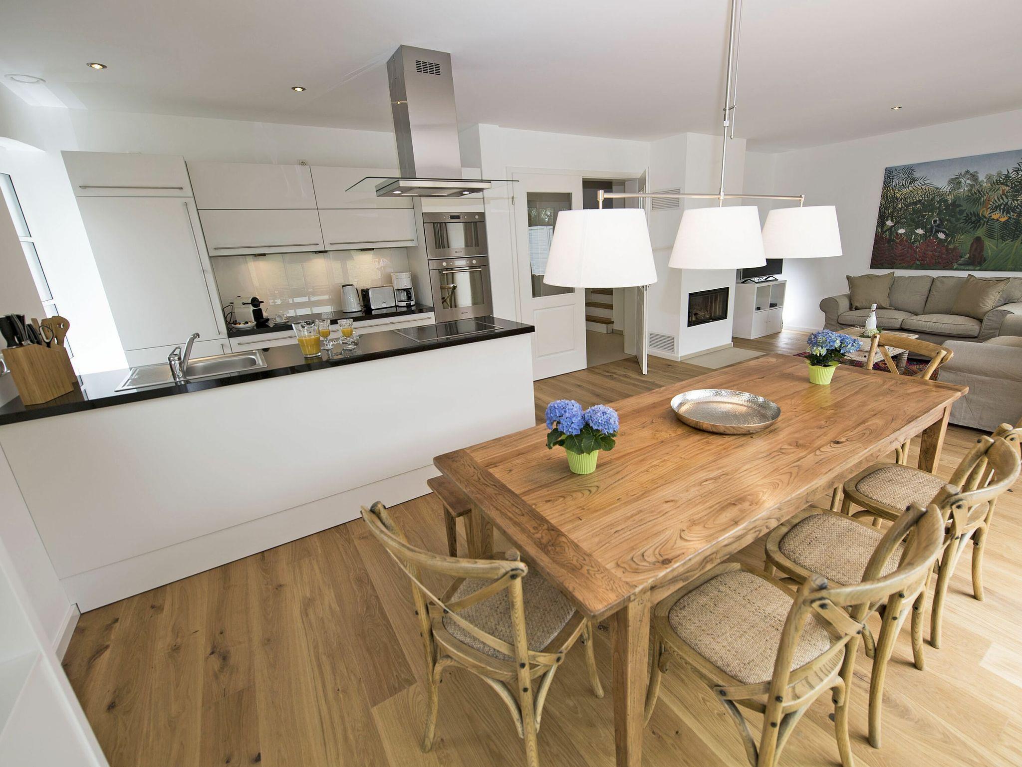 Die harmonisch im Wohnbereich integrierte Küchenzeile mit einem Backofen, einer Mikrowelle, einem Geschirrspüler, einem großen Kühlschrank mit Gefrierfach, einer Kaffeemaschine, einer Krups-Nespresso-Maschine für Kaffeespezialitäten, Toaster, Wasserkocher und diversen Kleininventar lässt das Herz jeden Hobbykochs höher schlagen. Eine freistehende Kochinsel und ein großer Ulmenholztisch mit 5 Stühlen und Sitzbank rundet das Wohnküchenflair ab.