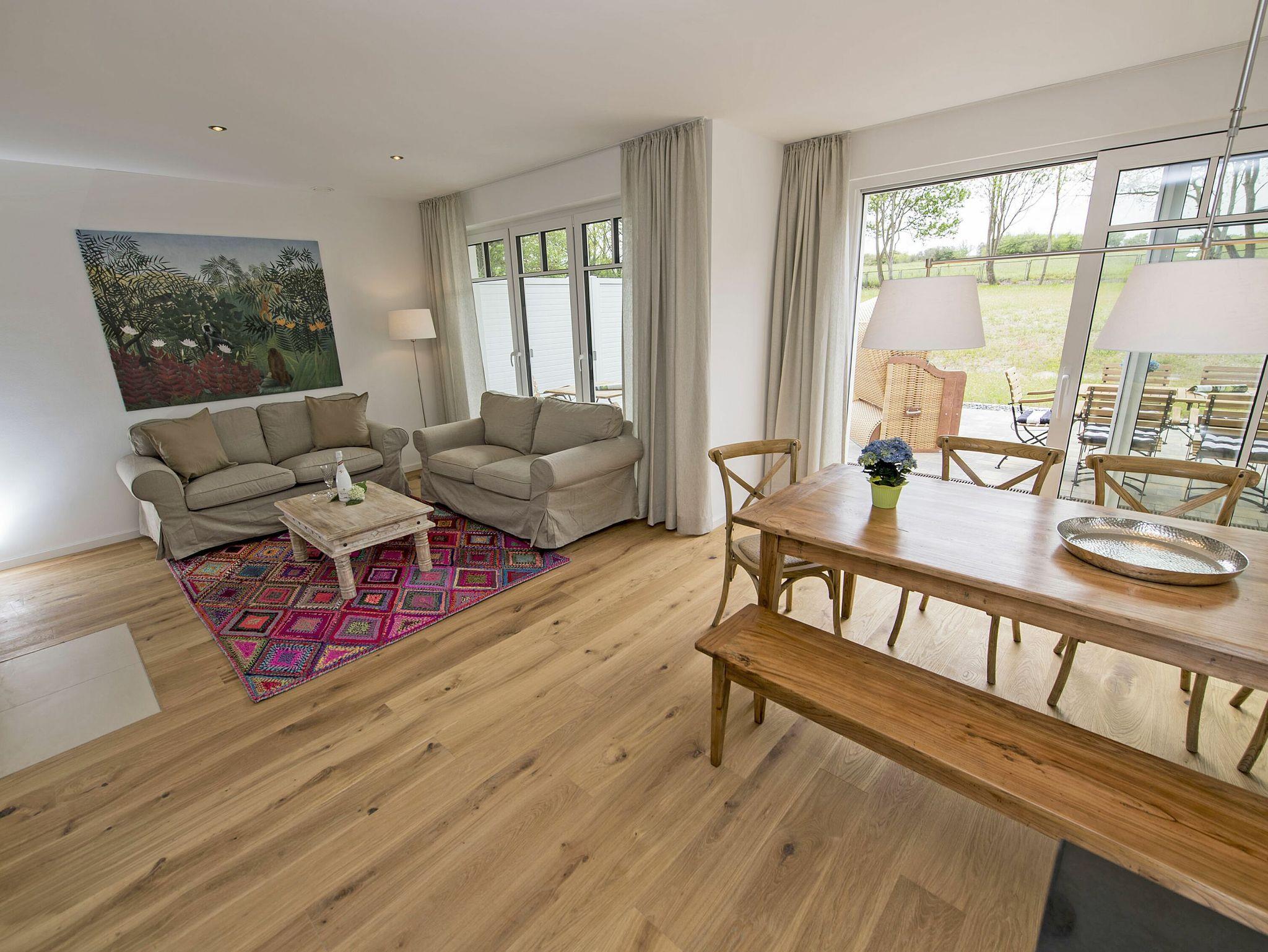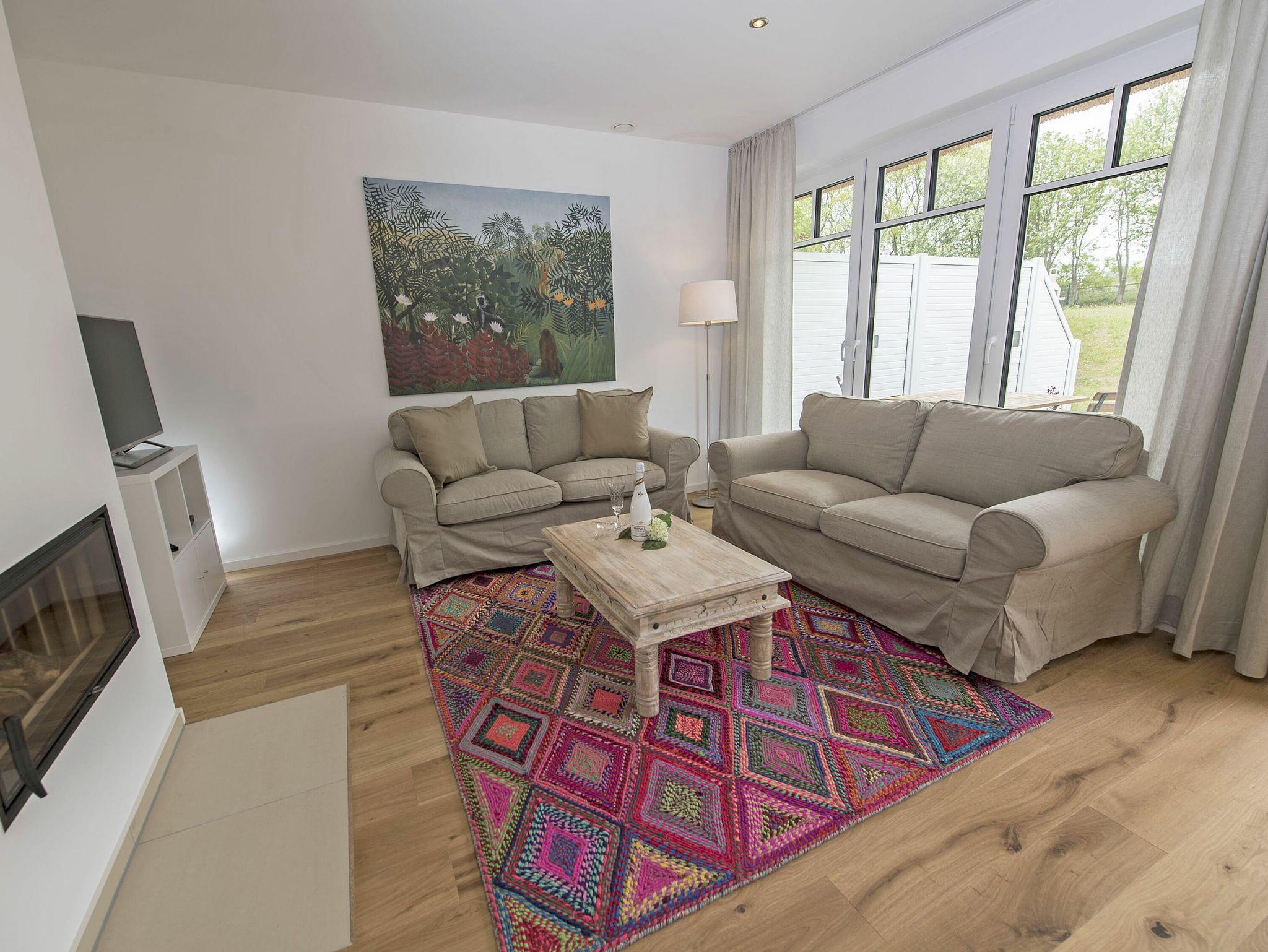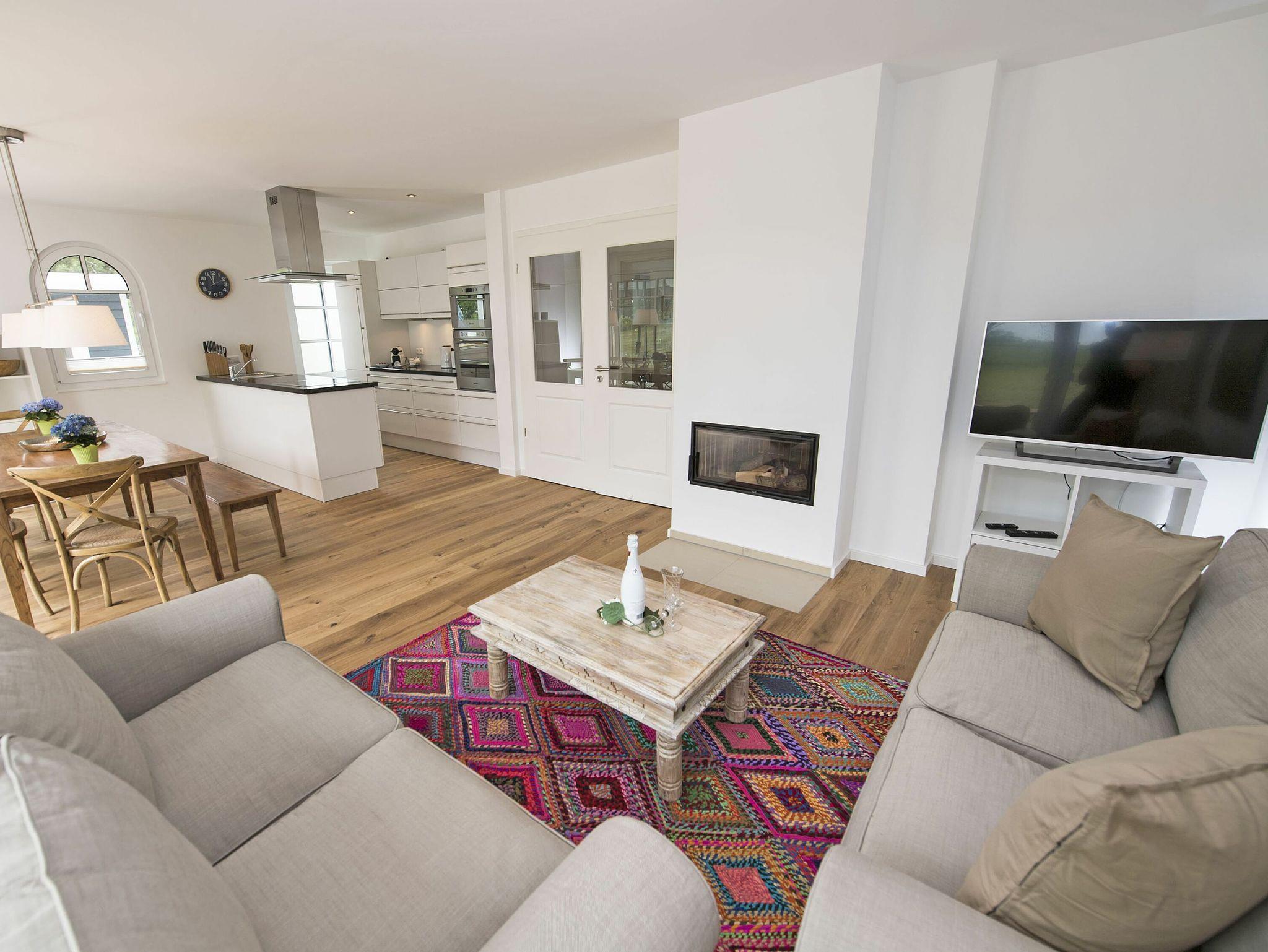 Der großzügige und lichtdurchflutete Wohn- und Essbereich mit direktem Blick ins Naturschutzgebiet befindet sich im Erdgeschoss. Das Wohnzimmer ist mit zwei gemütlichen Sofas und einem Flachbild-TV mit DVD/CD-Player ausgestattet. In den kühleren Jahreszeiten verbreitet der im Wohnzimmer eingebaute Kamin eine besonders behagliche Atmosphäre.