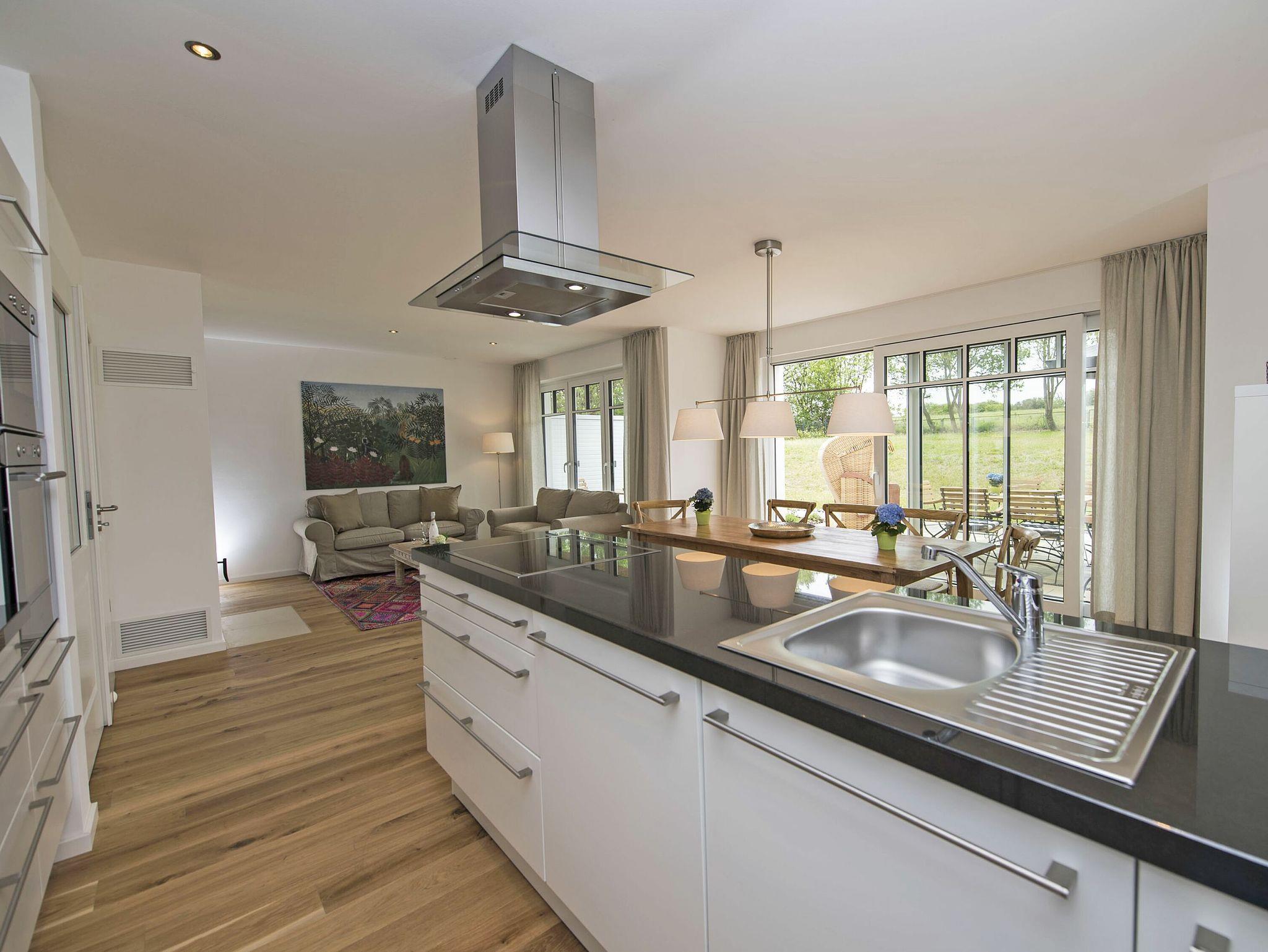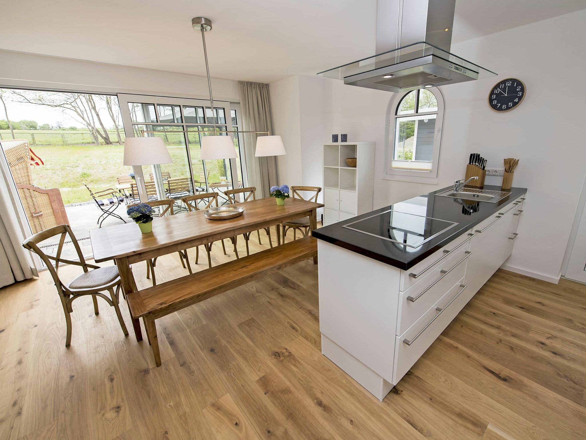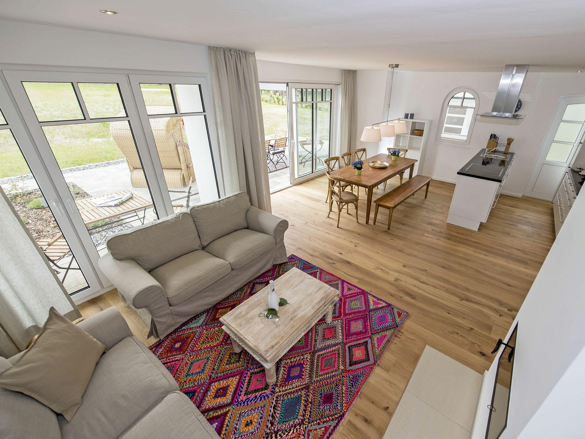 Der großzügige und lichtdurchflutete Wohn- und Essbereich mit direktem Blick ins Naturschutzgebiet befindet sich im Erdgeschoss. Das Wohnzimmer ist mit zwei gemütlichen Sofas und einem Flachbild-TV mit DVD/CD-Player ausgestattet. In den kühleren Jahreszeiten verbreitet der im Wohnzimmer eingebaute Kamin eine besonders behagliche Atmosphäre.