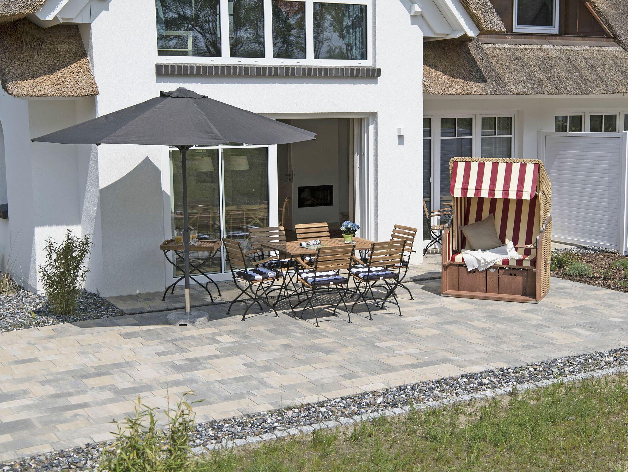 Die großzügige eigene Terrasse ist nach Süden ausgerichtet. Entspannen Sie im komfortablen Strandkorb und genießen Sie den herrlichen Blick auf den gemeinschaftlich nutzbaren Garten mit Grillplatz und auf das dahinterliegende Naturschutzgebiet. Die Terrasse ist weiterhin mit einem Sonnenschirm, einem großen (130x80 cm) und einem kleinen Terrassenholztisch (80x80 cm) mit passenden Stühlen bestens ausgestattet.