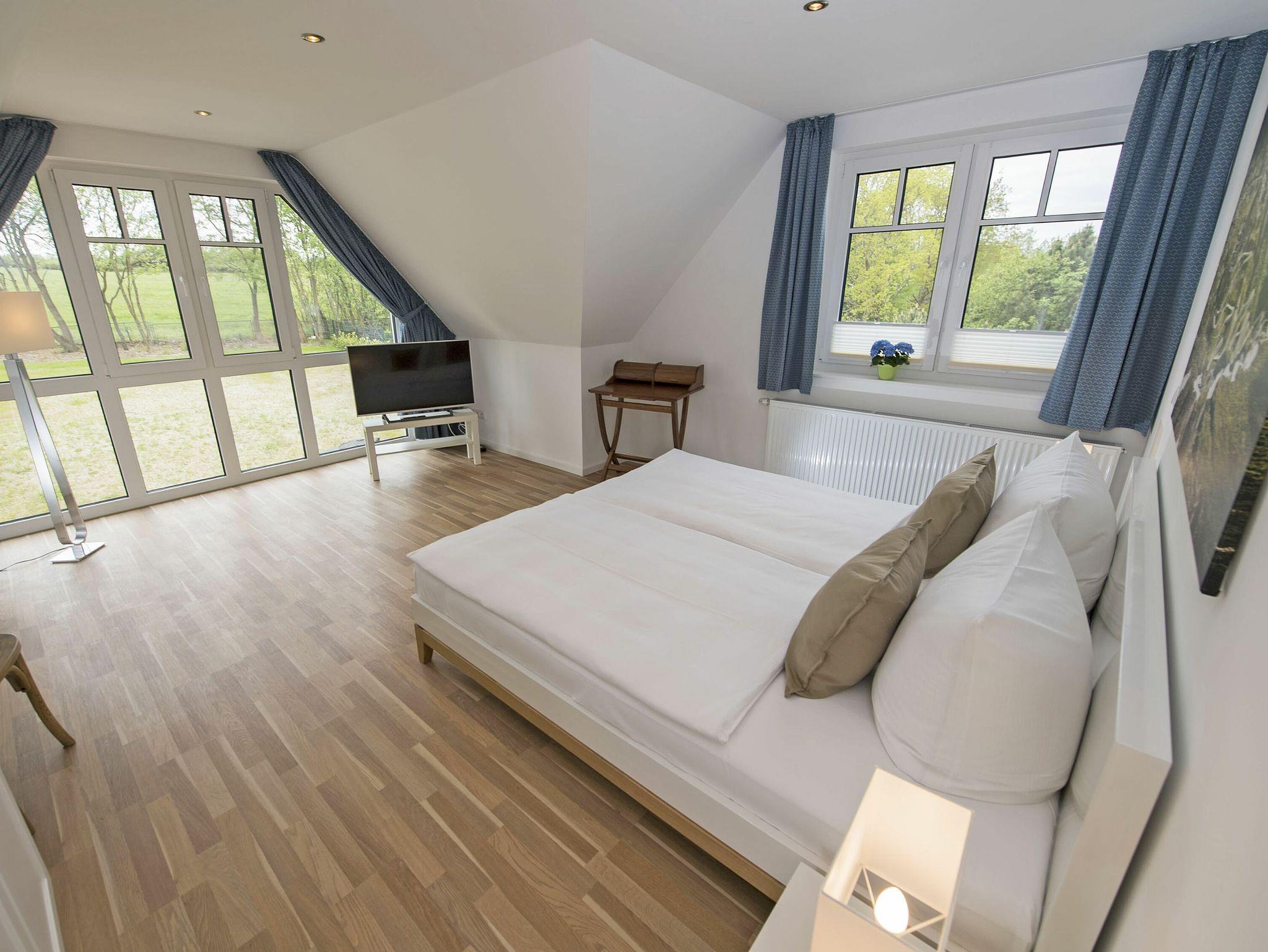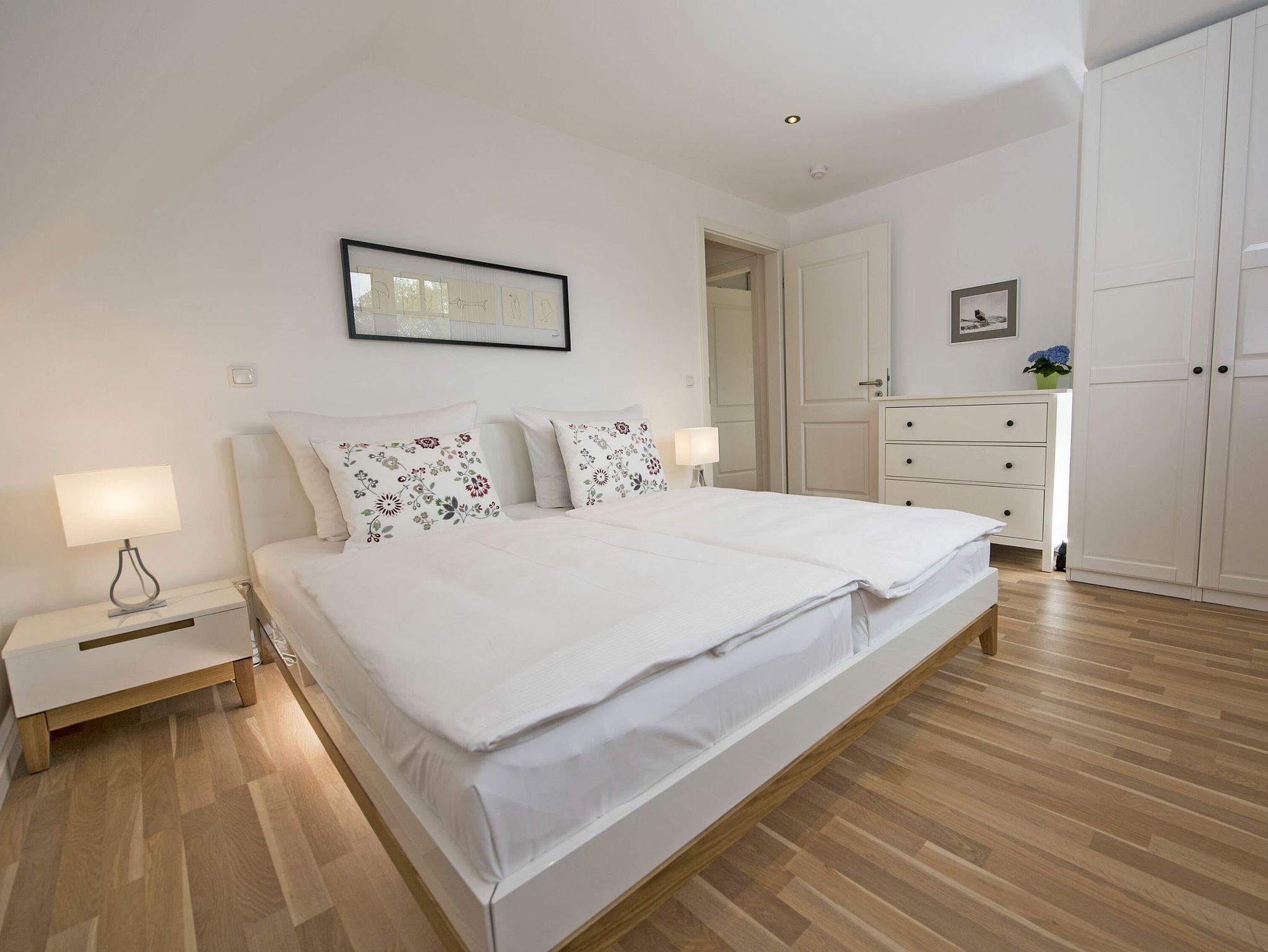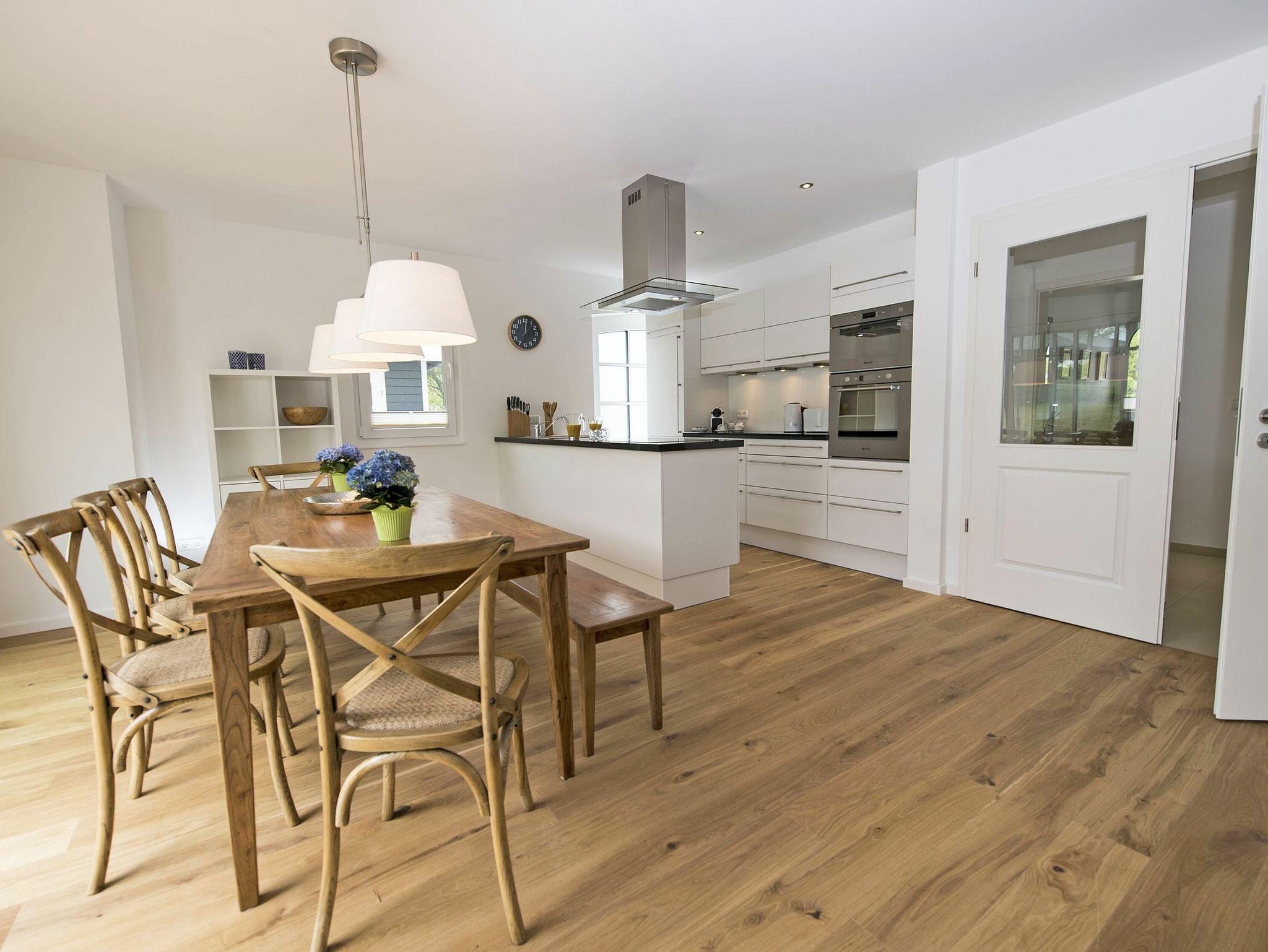 Die rechte Reethaushälfte verfügt über 135 m² Wohnfläche auf zwei Ebenen verteilt mit einem großzügigen Wohn- und Essbereich, drei komfortablen Schlafzimmern, einem großen Badezimmer, zwei Gäste-WC´s sowie einer privaten Sauna mit Dusche. Zusätzlich verfügt die Haushälfte über einen ausgebauten Spitzboden mit zwei weiteren Schlafgelegenheiten.