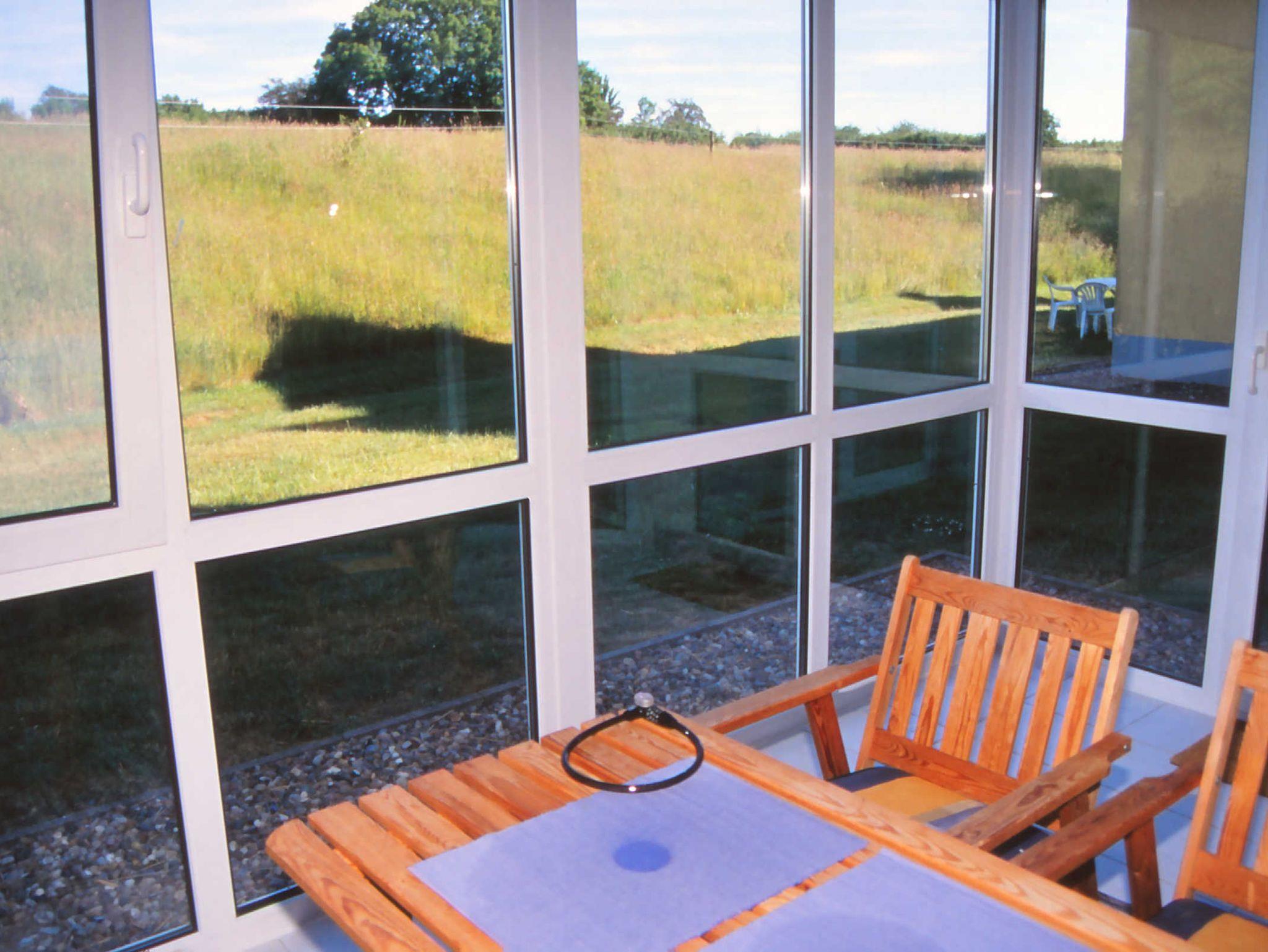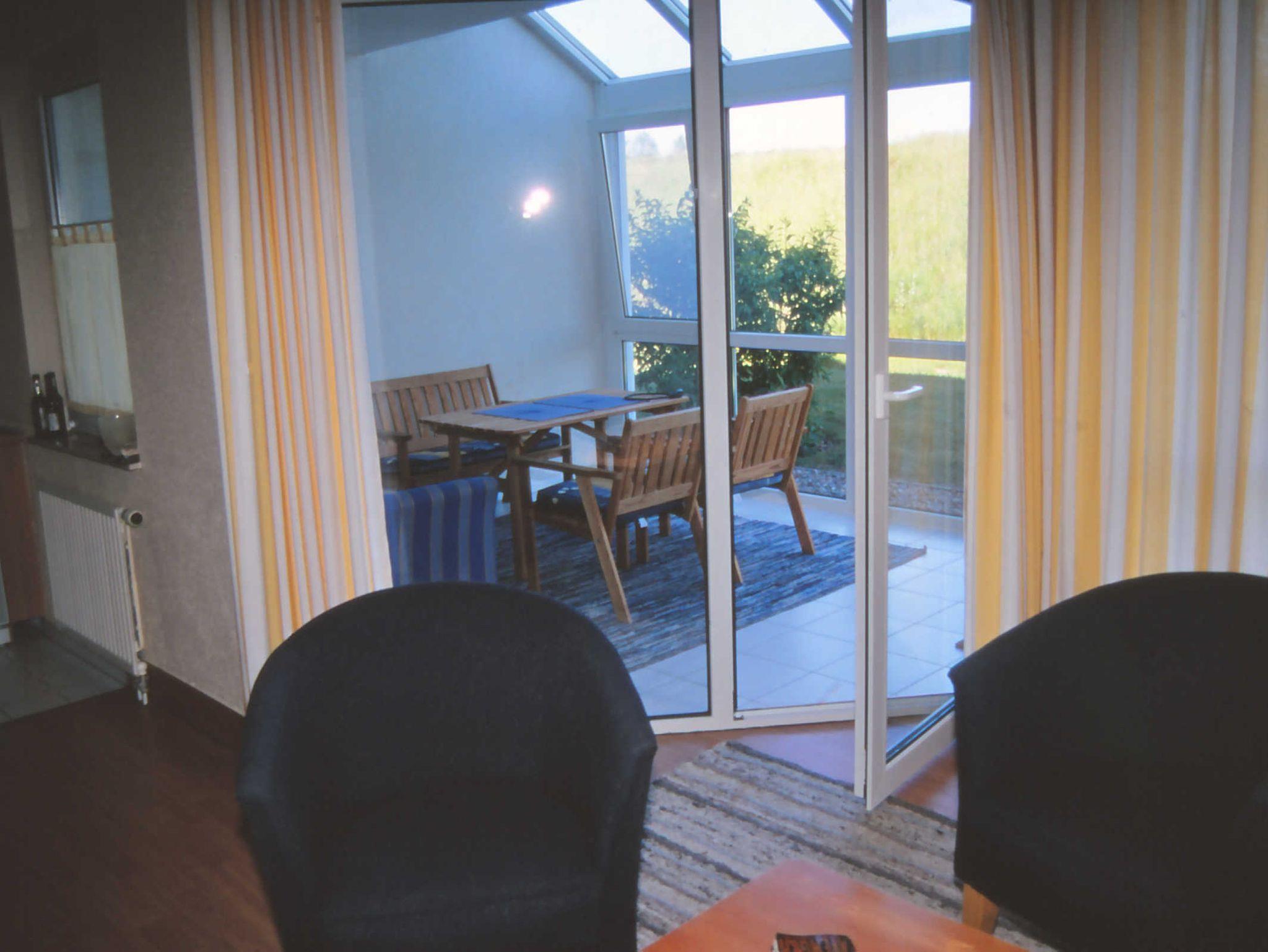 Der Wintergarten ist mit Sitzmöbeln ausgestattet und davor kann man sich auch in die Sonne setzen.