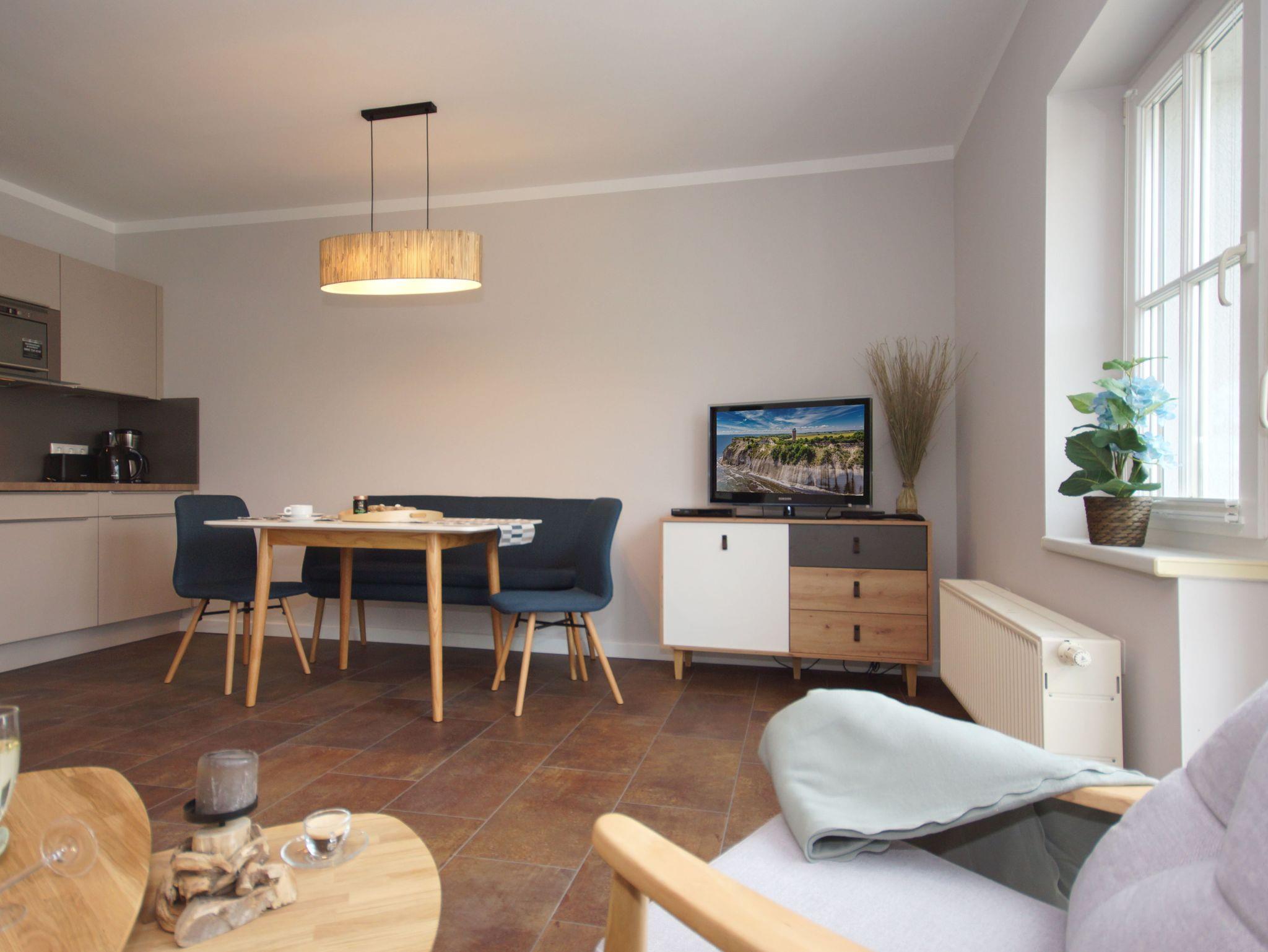 Die modern und liebevoll eingerichtete Wohnung 8 im Haus Seeblick verfügt über einen separaten Schlafbereich, einen hellen Wohnbereich mit offener Küchenzeile, sowie ein Badezimmer mit Dusche und WC. Sie umfasst ca. 48qm. Der komfortable Wohnbereich mit einer Couch (Aufbettungsmöglichkeit 1,40m x 1,90m) + Couchtisch, einen Sessel, eine Stehlampe sowie eine Kommode mit Flachbild-TV bietet Ihnen einen gemütlichen Ort zum Ausklingen der erlebnisreichen Tage auf der Halbinsel Mönchgut. Angrenzend befindet sich eine offene, voll ausgestattete Küchenzeile mit Spülmaschine, Kühlschrank mit Eisfach, Dunstabzugshaube, Wasserkocher, Kaffeemaschine, Nespresso Maschine, Toaster, Induktionsfeld, Mikrowelle und ein Essplatz. Direkt nebenan befindet sich das gemütliche Schlafzimmer, das mit einem Kleiderschrank und einem Doppelbett (1,80m x 2,00m) ausgestattet ist. Ein weiterer Flachbild-TV rundet den Raum ab. Das innenliegende und freundliche Badezimmer bietet Ihnen eine Dusche, ein WC, ein Fön, ein Kosmetikspiegel und ein Waschplatz mit dazugehörigem Spiegel. Für unsere kleinen Gäste steht ein Hochstuhl sowie ein Kinderreisebett (ohne Bett Inlett/inkl. Matratze) zur Verfügung. Auch ein 4-Beiner ist mit seinem eigenen Schlafplatz gegen eine Gebühr ein gern gesehener Gast. Ein eigener Strandkorb (01.April - 31.Oktober) steht zum Entspannen im Freien direkt am Bodden zur Verfügung. Eine Fahrrad-Unterstellmöglichkeit steht Ihnen und allen Gästen des Hauses zur gemeinschaftlichen Nutzung kostenfrei zur Verfügung. Ihr PKW-Stellplatz befindet sich knapp 100m vom Haus entfernt und ist für Sie inklusive. Die Erstausstattung eines Wäschepaketes (komplette Bettwäsche, 1 Duschhandtuch, 2 kleine Handtücher) können Sie bis 14 Tage vor Anreise gegen einen Aufpreis dazu buchen oder durch eigene ergänzen. Ab 2 gebuchten Paketen erhalten Sie einmalig 1 Geschirrhandtuch und 1 Duschvorleger hinzu.