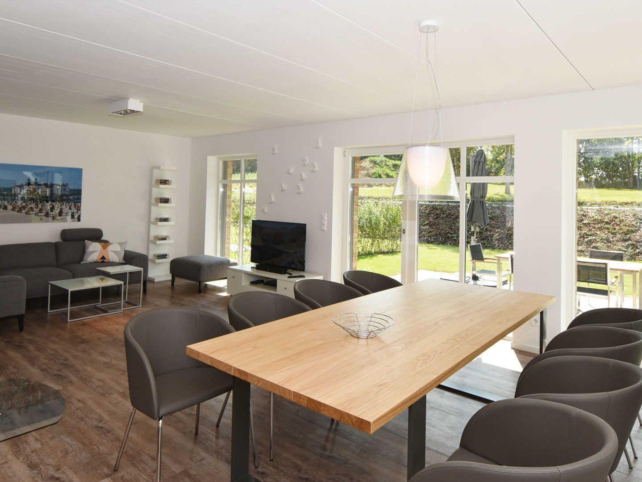 In den Obergeschossen befinden sich 2 Balkone, 3 Schlafzimmer mit insgesamt 6 Betten und ein Arbeitszimmer mit Schreibtisch und Boxspring Schlafcouch für 2 Personen. Im Wohnbereich erwartet Sie ein Kamin, großer Flachbildschirmfernseher mit Soundbar und Blu Ray Player, ein großer Esstisch für 8 Personen und eine offene Küche mit sehr guter Ausstattung. Vom Esstisch im Erdgeschoss und den Schlafzimmern im Obergeschoß mit Balkon schauen Sie in den weitläufigen Garten. Die Villa ist mit insgesamt 4 Bädern ausgestattet. Im Erdgeschoss finden Sie ein Bad mit Sauna, Dusche und WC. In den oberen Etagen befinden sich noch drei weitere Bäder - eins davon mit zusätzlicher Badewanne. Vom großen Bad im Obergeschoß haben Sie einen Blick auf die Ostsee. Den nahegelegenen Sandstrand erreichen Sie zu Fuß in weniger als 5 Minuten.