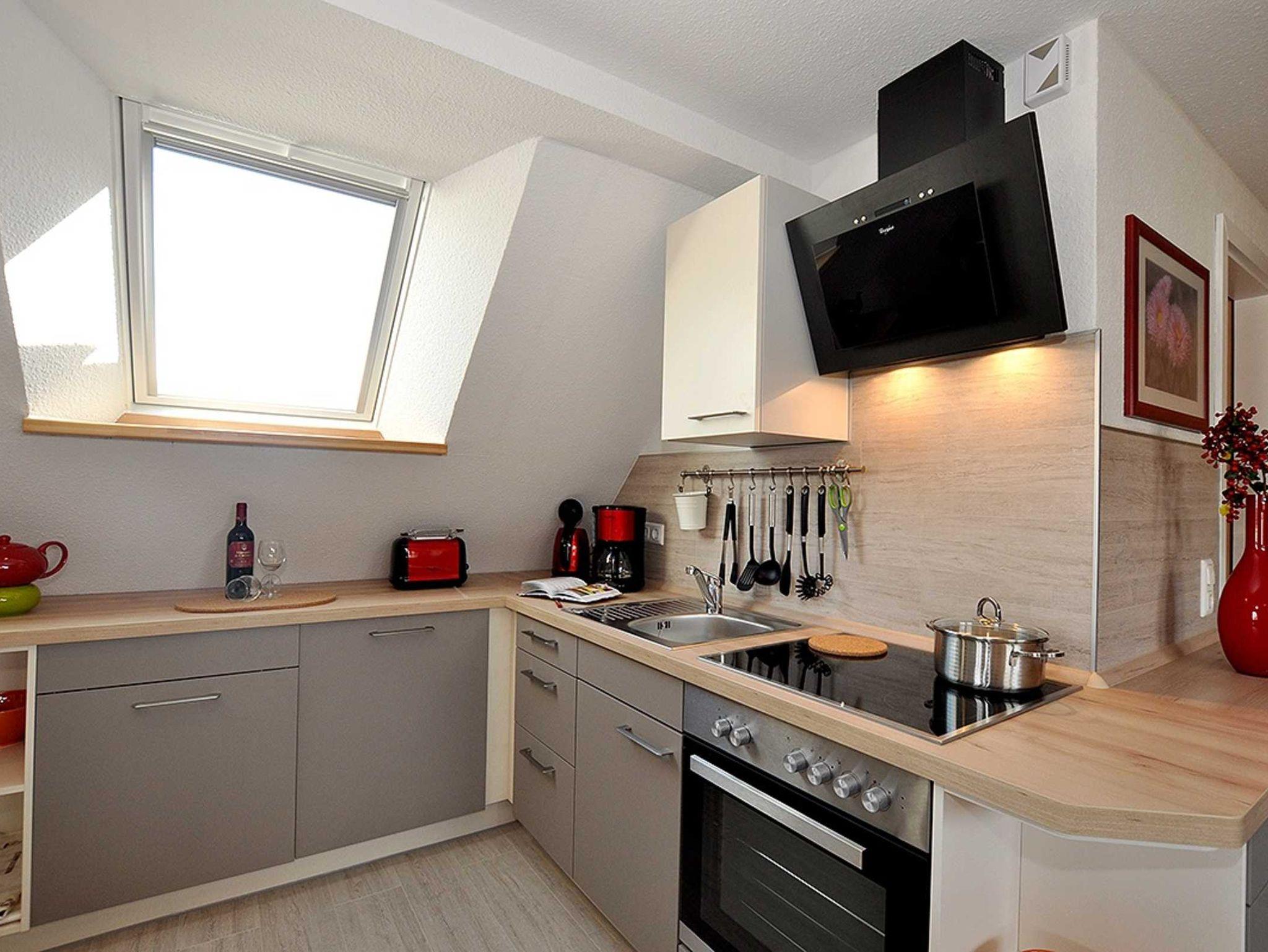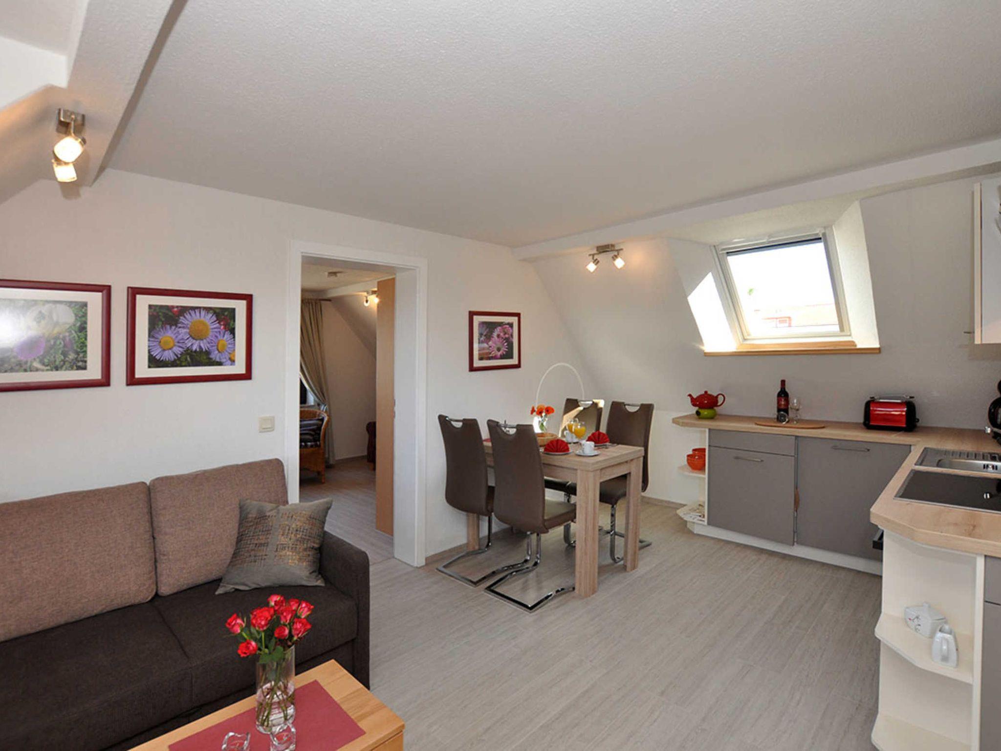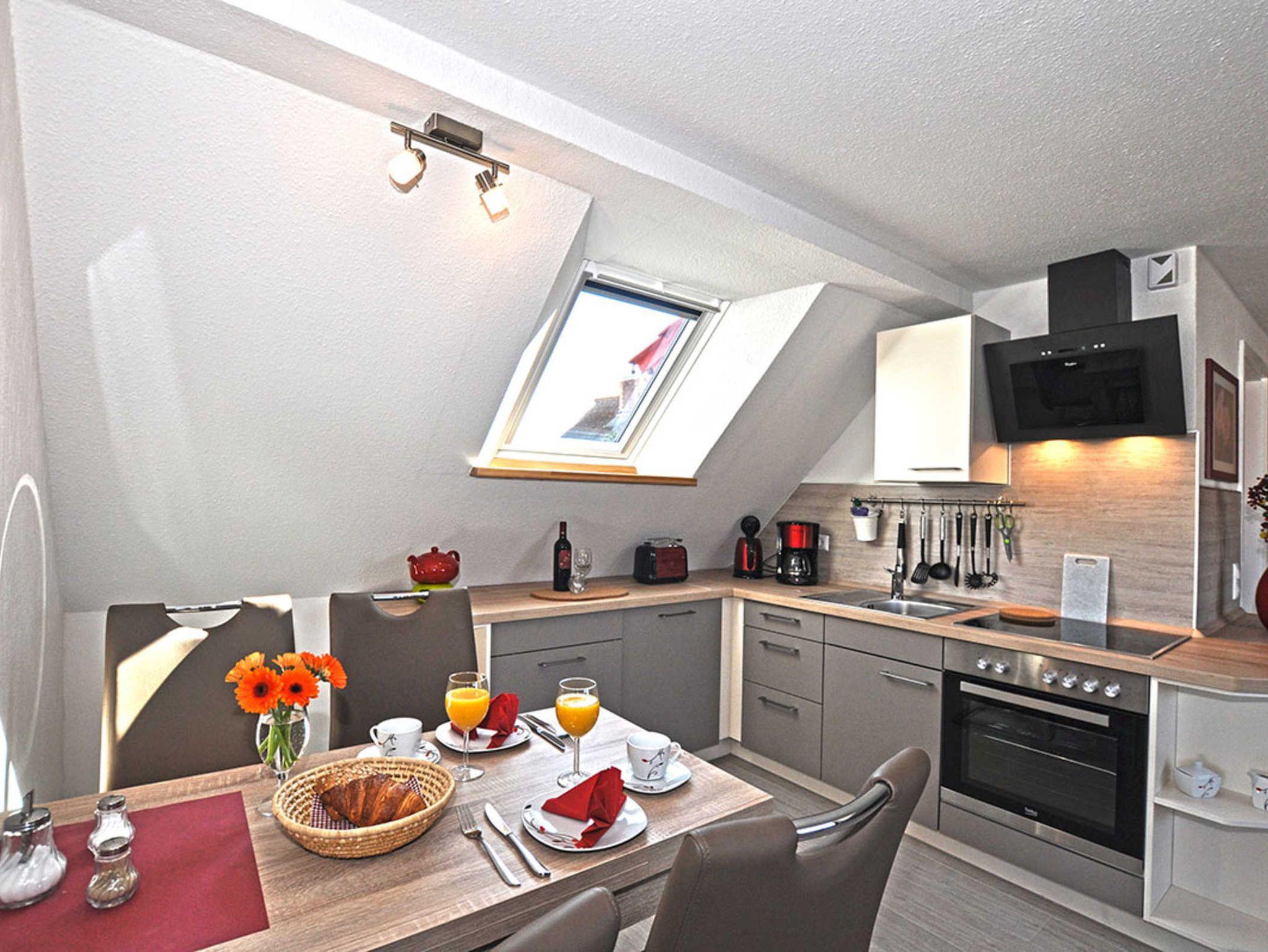 Die offene Küche bietet alles, was Sie für einen entspannten Urlaub benötigen. Sie ist mit einem 4-Felder Ceranherd mit Backofen, Kühlschrank mit Gefrierfach, Spülmaschine, Kaffeemaschine, Toaster und sämtlichen Küchenutensilien bestens ausgestattet. Dazu gibt es einen Esstisch mit Stühlen.