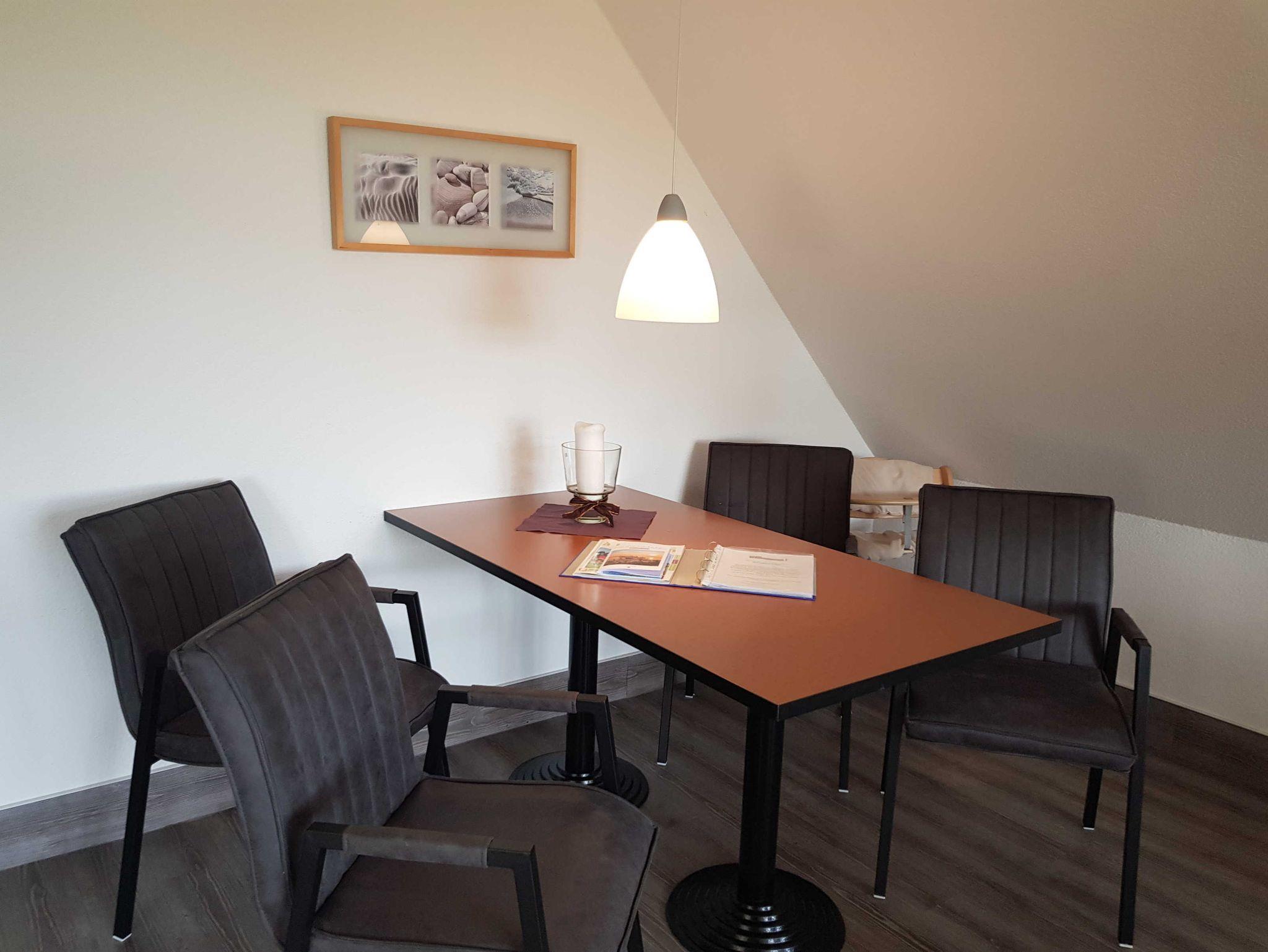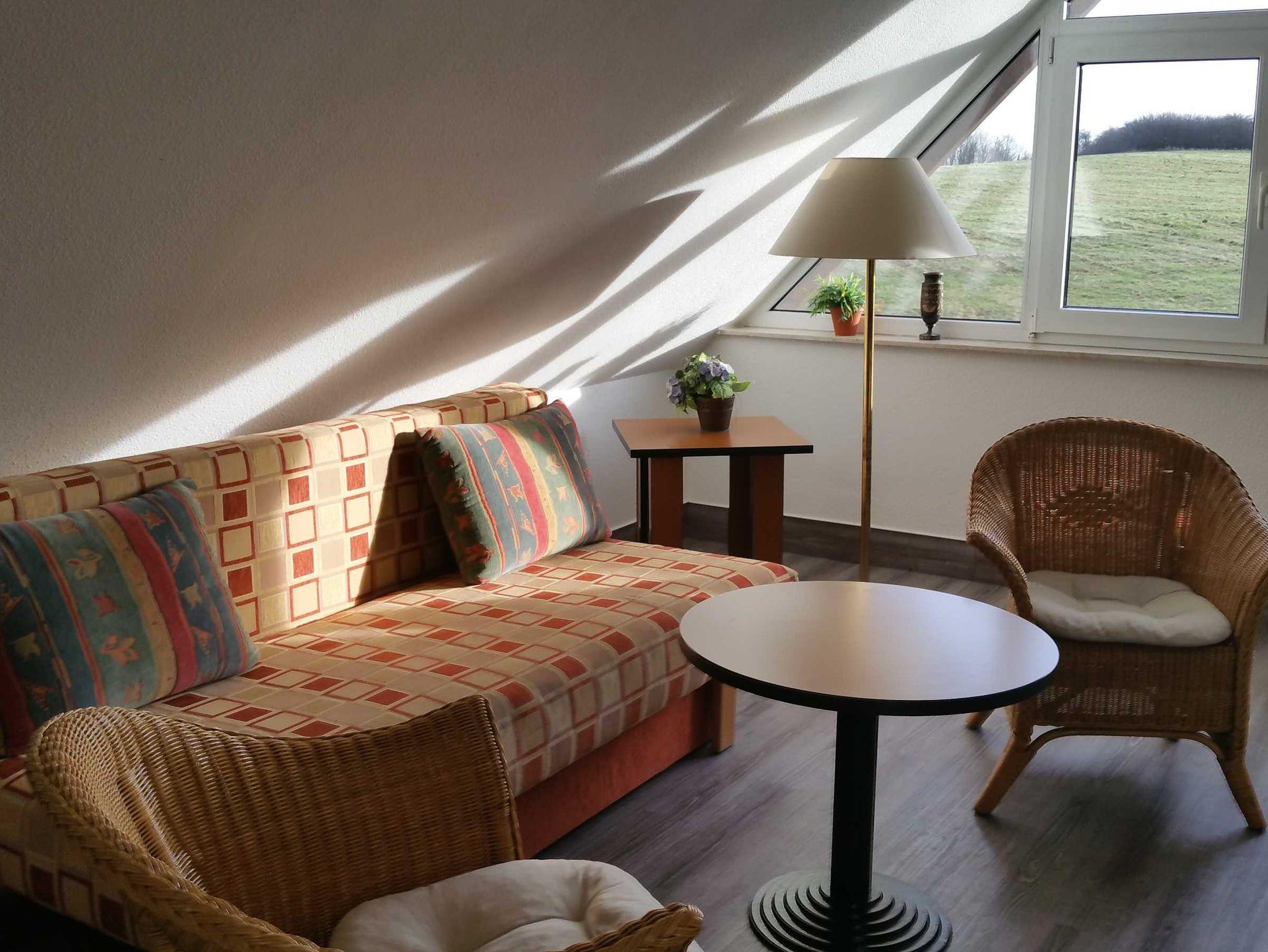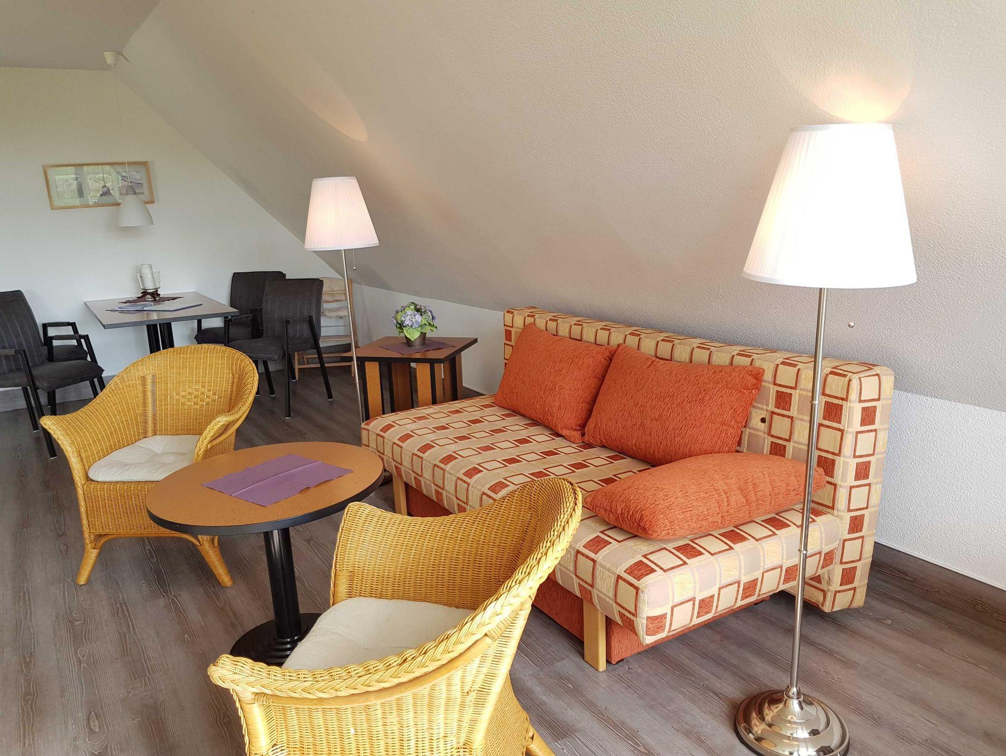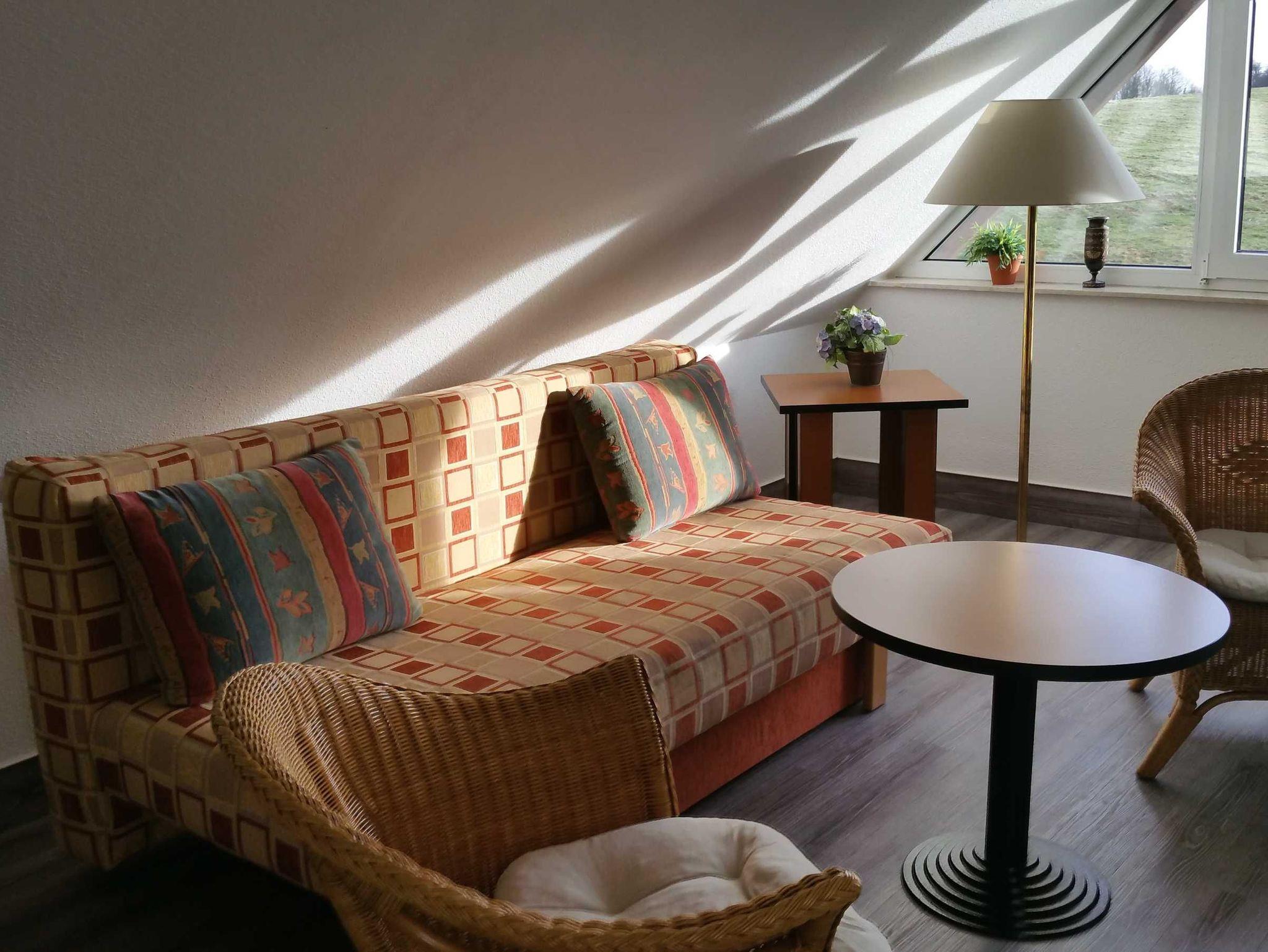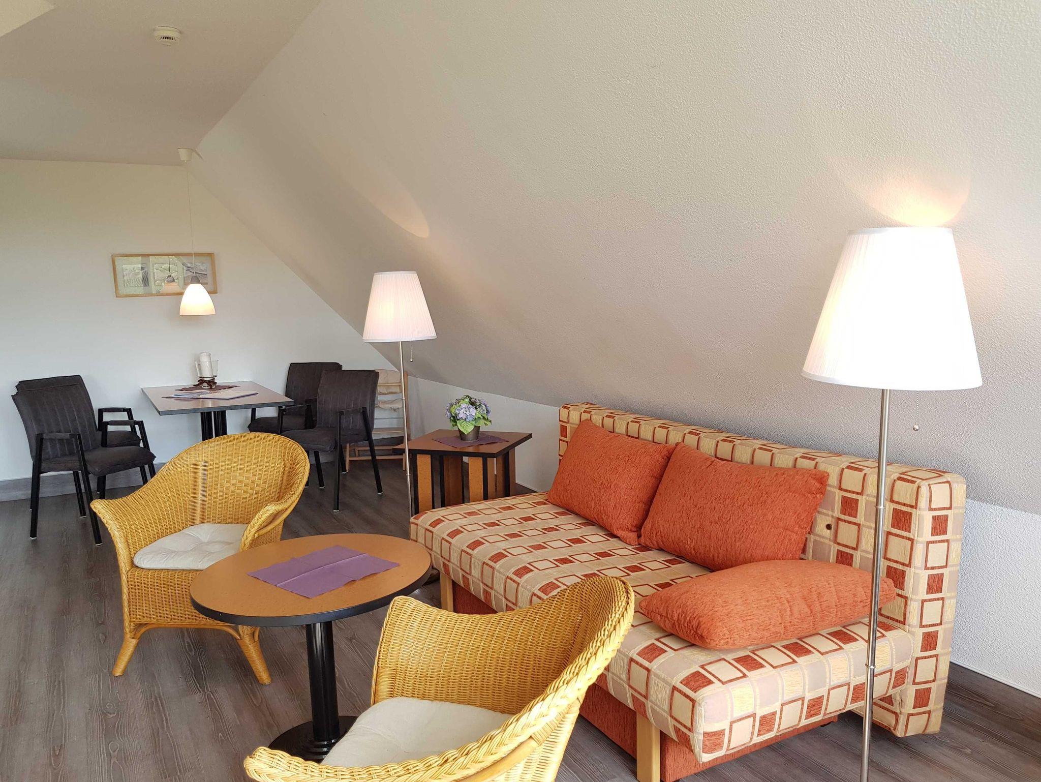 • Wohnzimmer mit ausziehbarer Couch und Esstisch für 4 Personen
