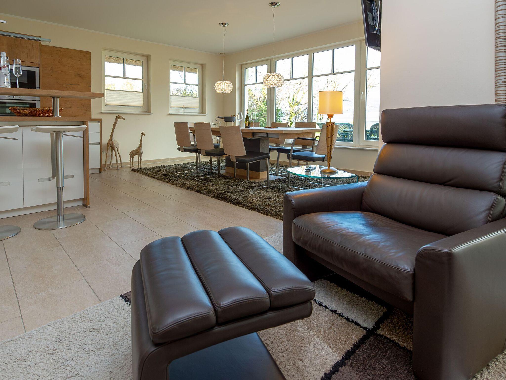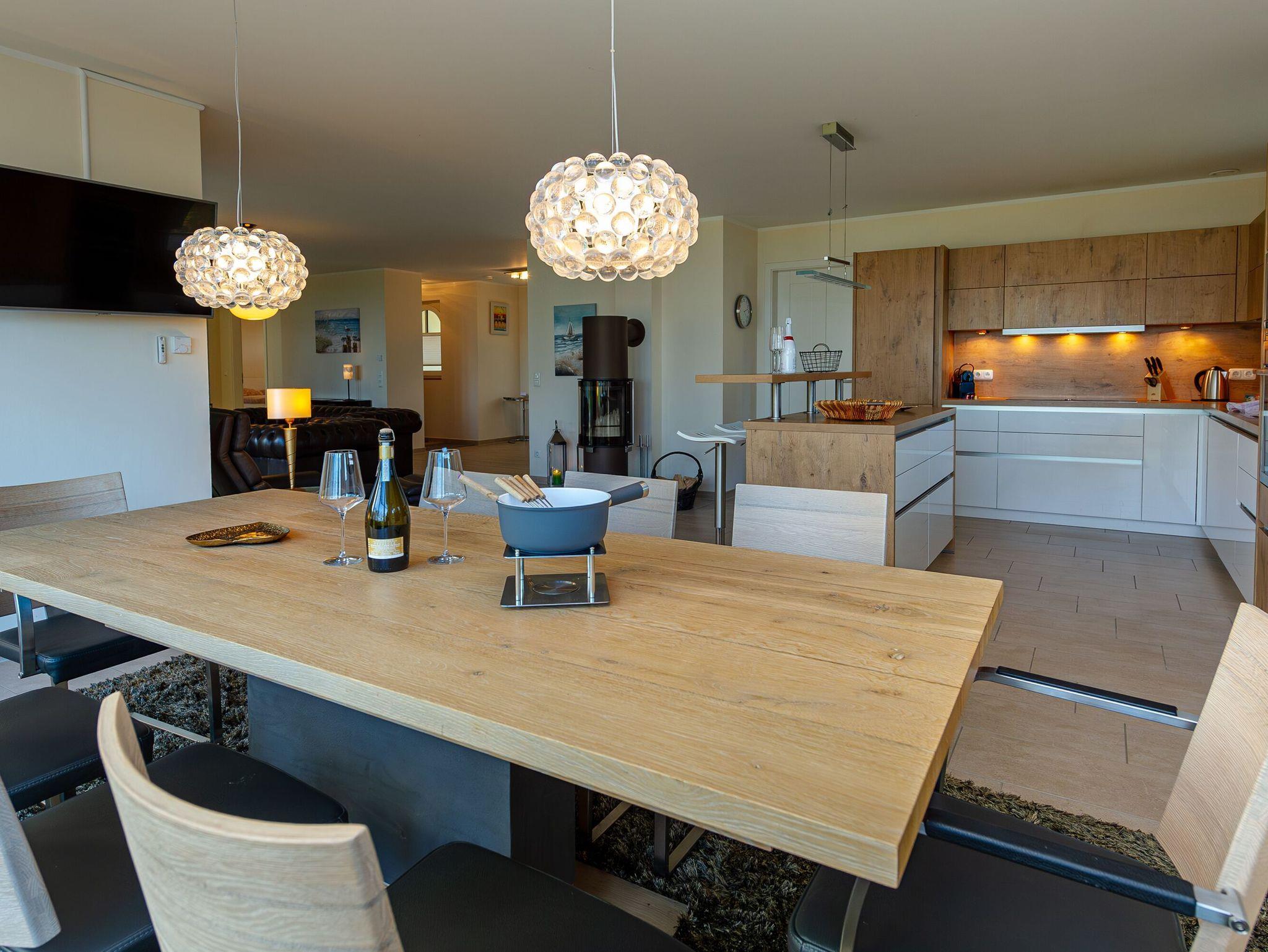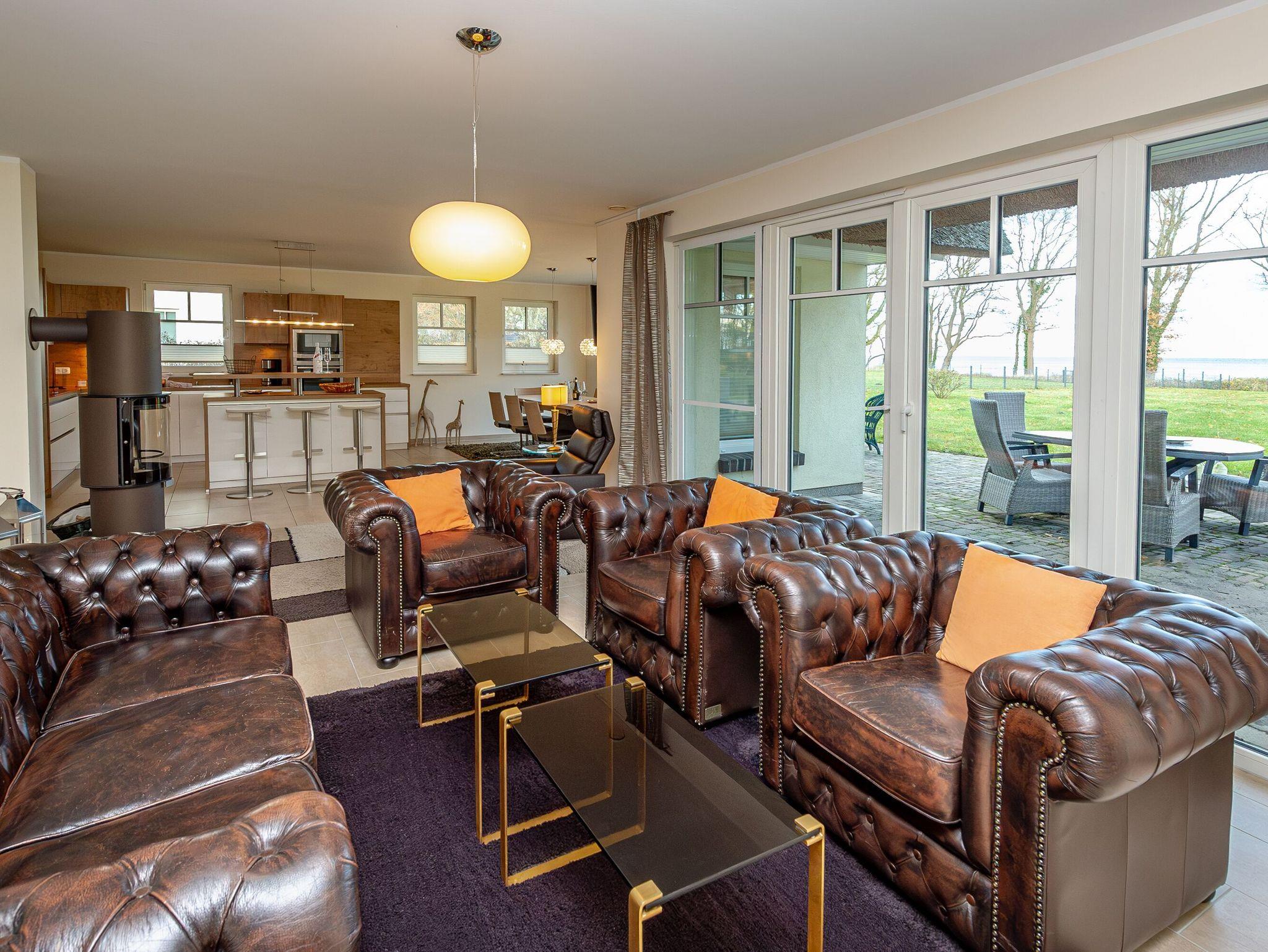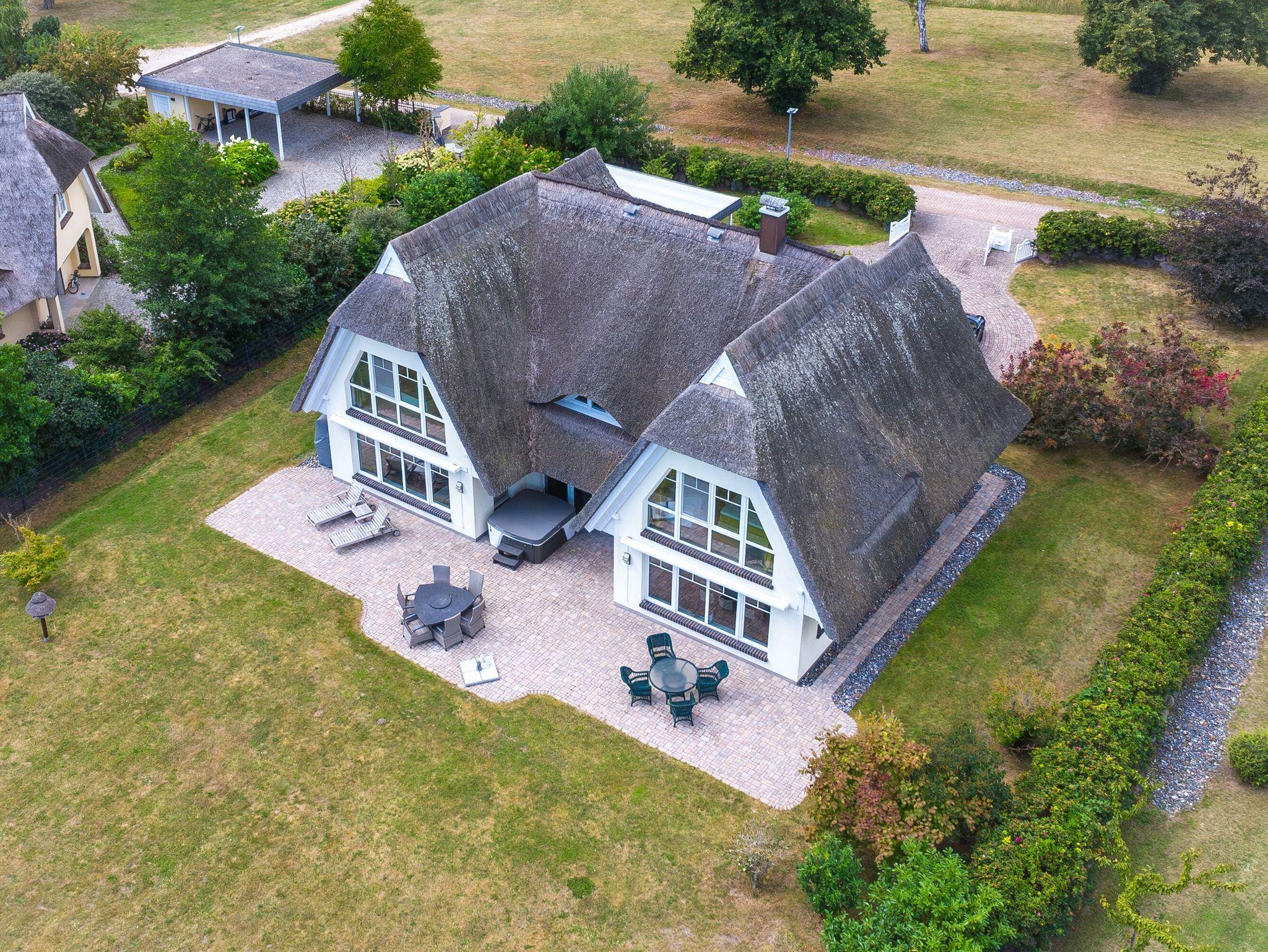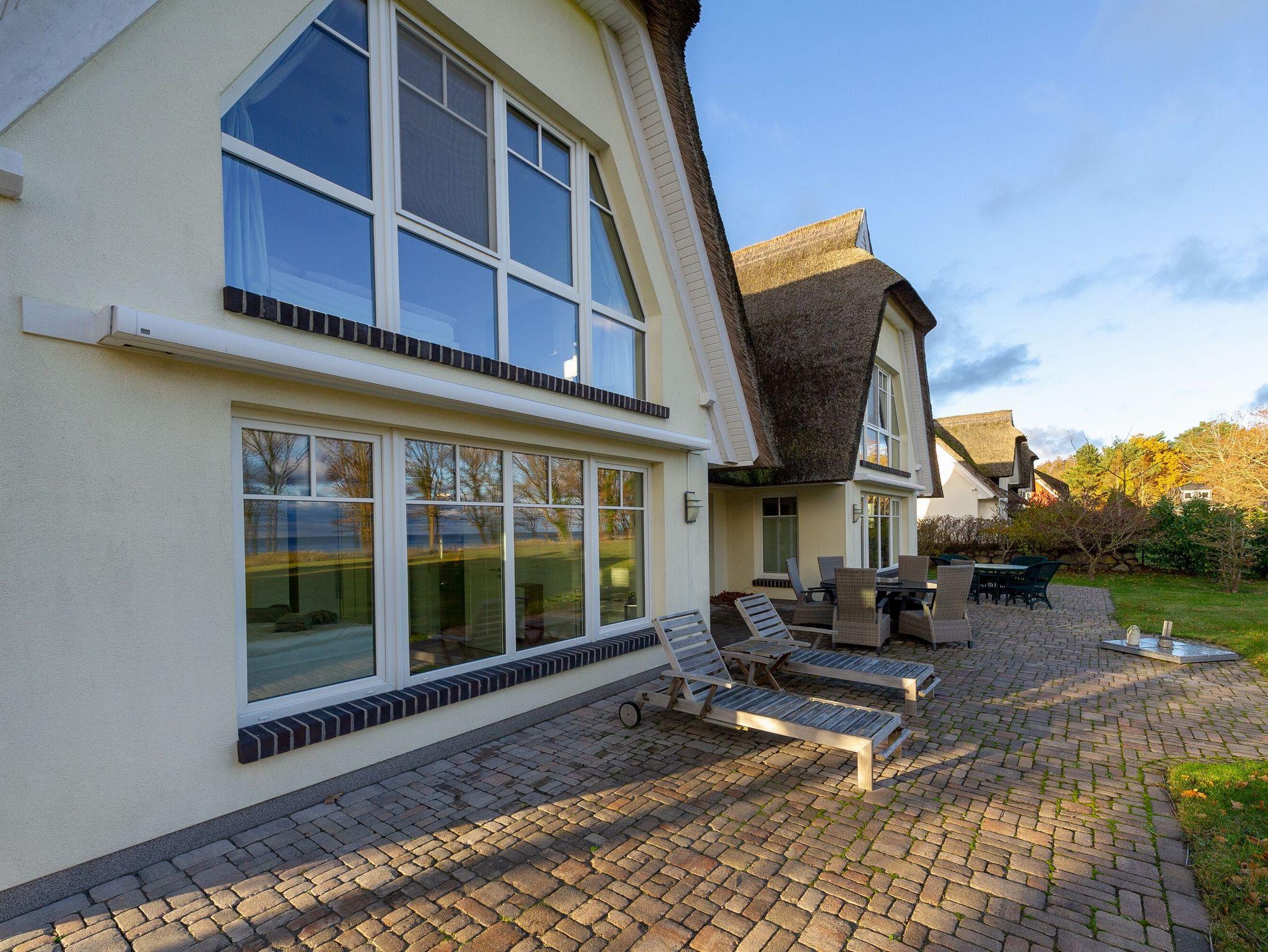 Für die 2013 gebaute und mit dem typischen Reetdach und Friesenwall versehene Villa wurden durchweg exquisite Materialien verwendet, z.B. schwedisches Eichenparkett und italienische Keramikfliesen. Eine Fußbodenheizung sorgt rund ums Jahr für angenehme Wohlfühl-Temperaturen. Überwiegend bodentiefe Fensterfronten ermöglichen einen traumhaften Meerblick. Riesige 258 qm Wohnfläche, verteilt auf zwei Etagen, bieten bis zu 8 Personen mehr als genug Platz. Gleich zwei Kamine (1x Holz, 1x Elektro), eine private Sauna und das hochwertige Interieur von Rolf Benz, Hülsta und anderen bekannten Marken sprechen für sich.